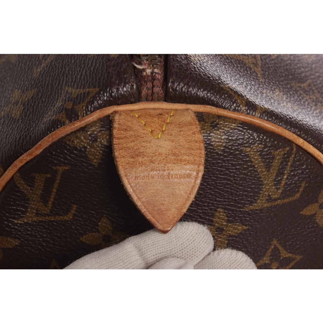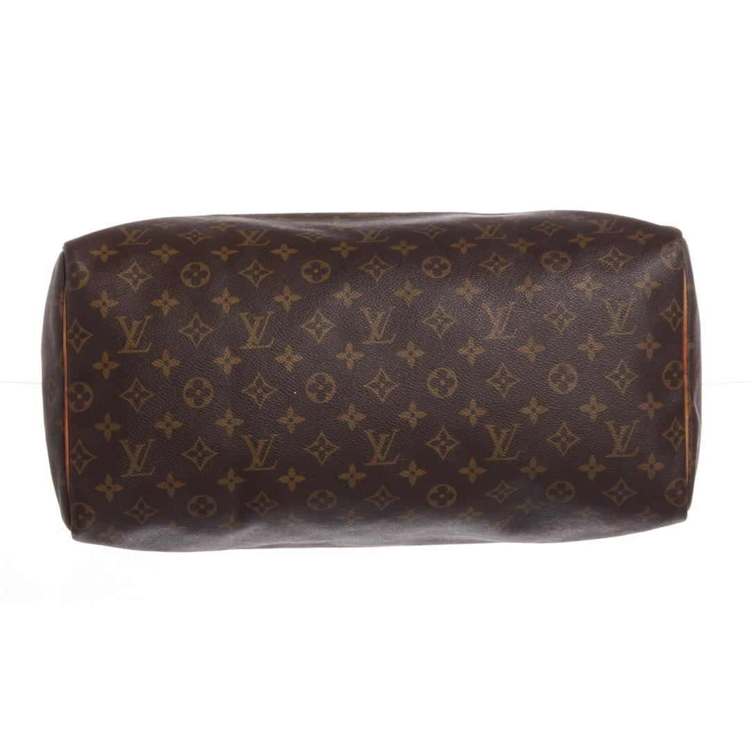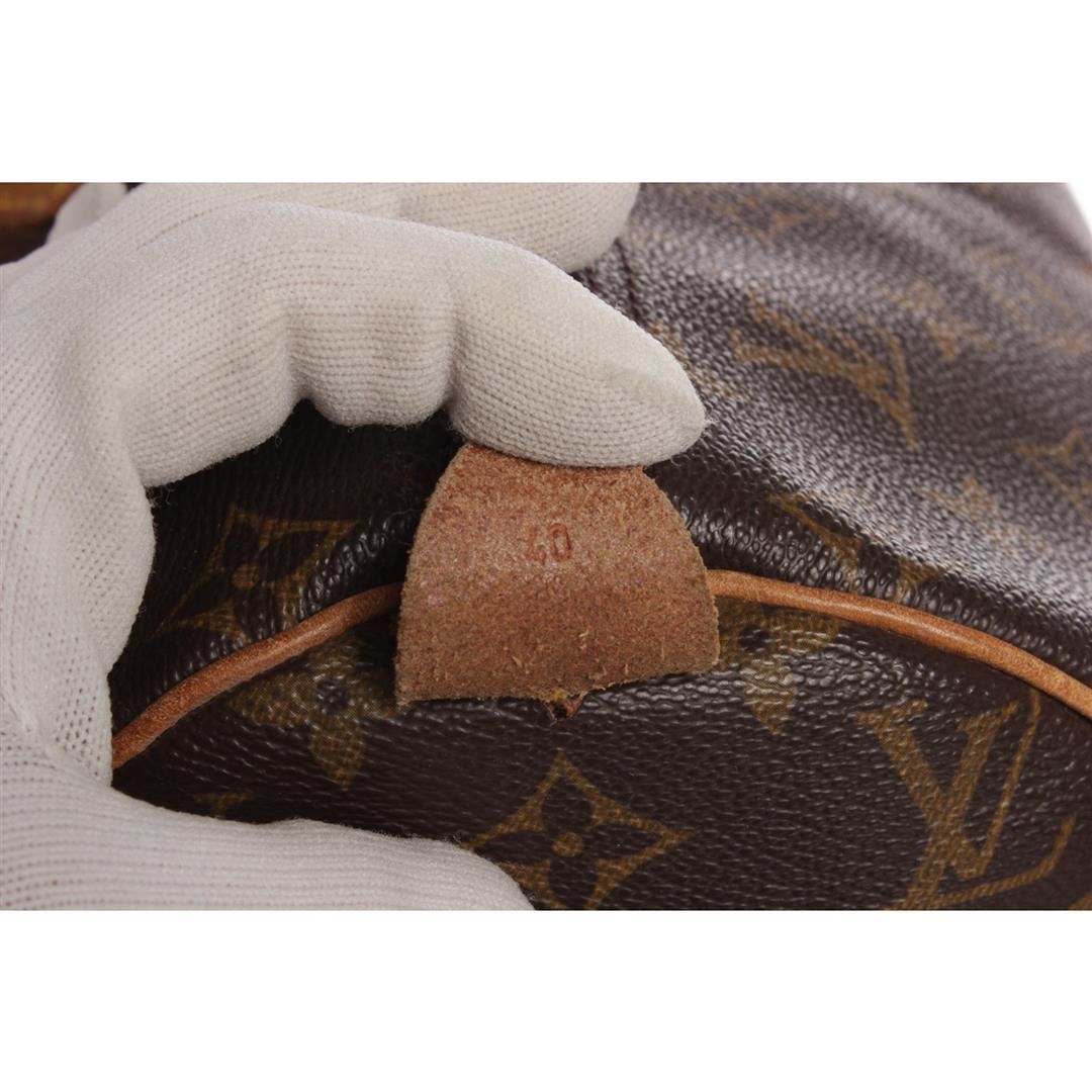 Brown and tan monogram coated canvas Louis Vuitton Speedy 40 with brass hardware, tan vachetta leather accents, dual rolled top handles, brown canvas lining, single pocket at interior wall and zip closure at top. Dimensions = 15.5"x7.5"x9.5"xHandle Drop:3.25"/ 39.3cmx19cmx24.1cmxHandle Drop:8.2cm. Item is pre-owned.