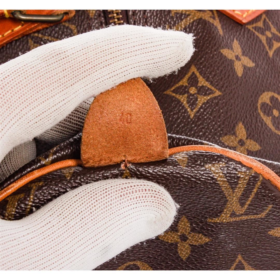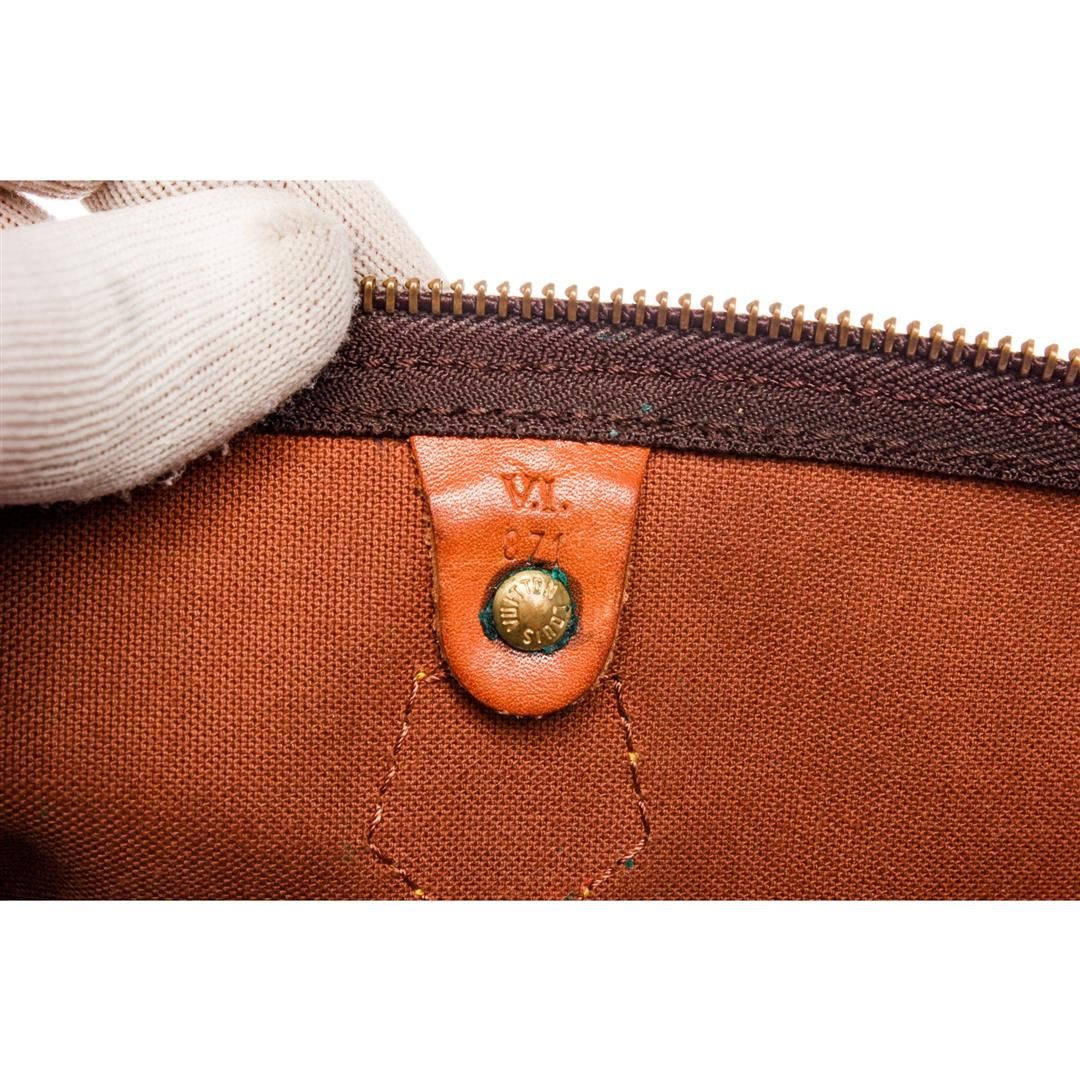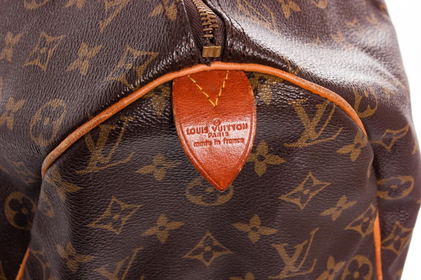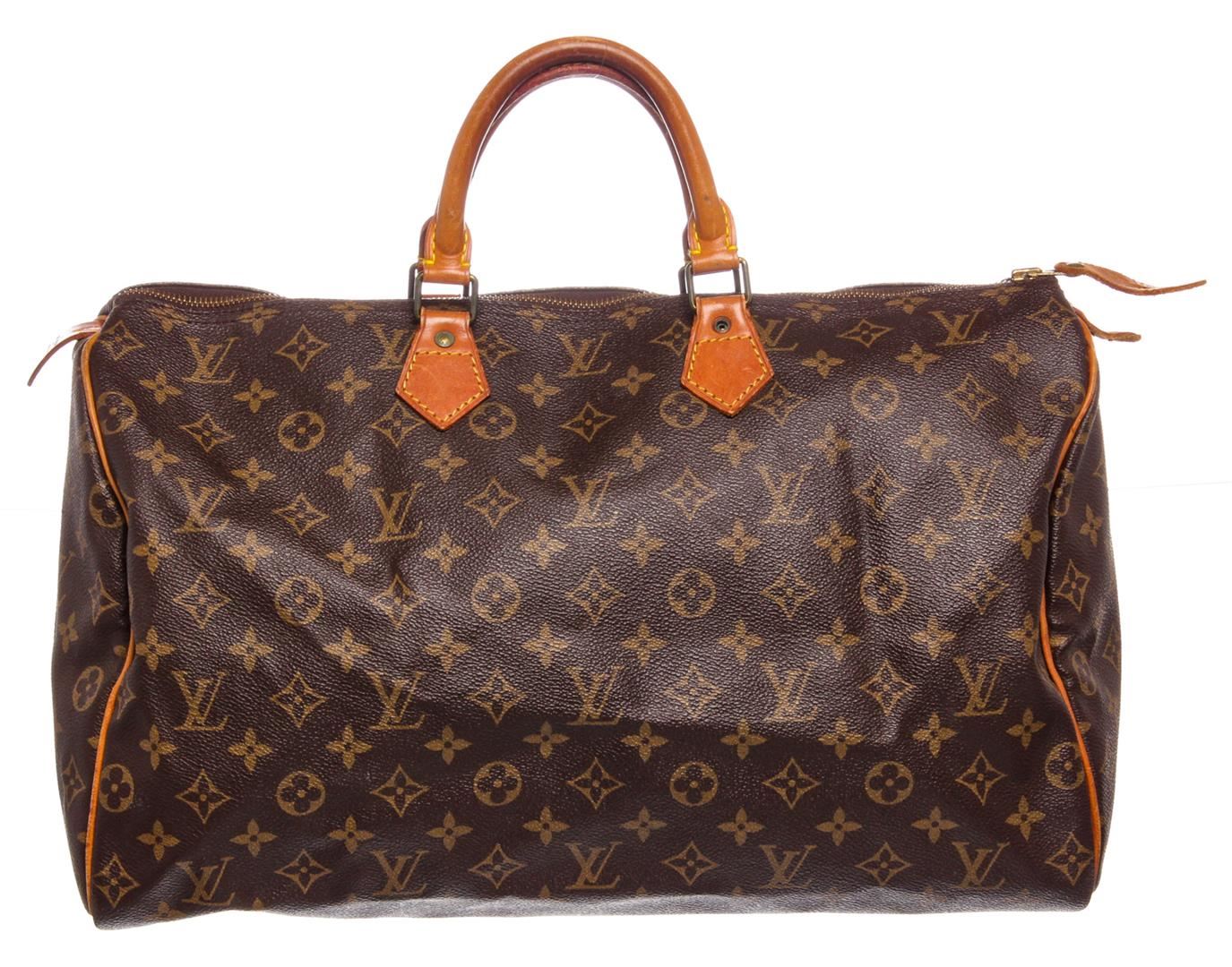 Brown and tan monogram coated canvas Louis Vuitton Speedy 40 with brass hardware, tan vachetta leather accents, dual rolled top handles, brown canvas lining, single pocket at interior wall and zip closure at top.