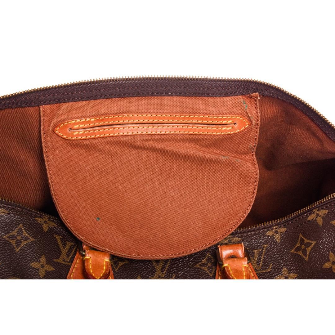Brown and tan monogram coated canvas Louis Vuitton Speedy 40 with brass hardware, tan vachetta leather accents, dual rolled top handles, brown canvas lining, single pocket at interior wall and zip closure at top.