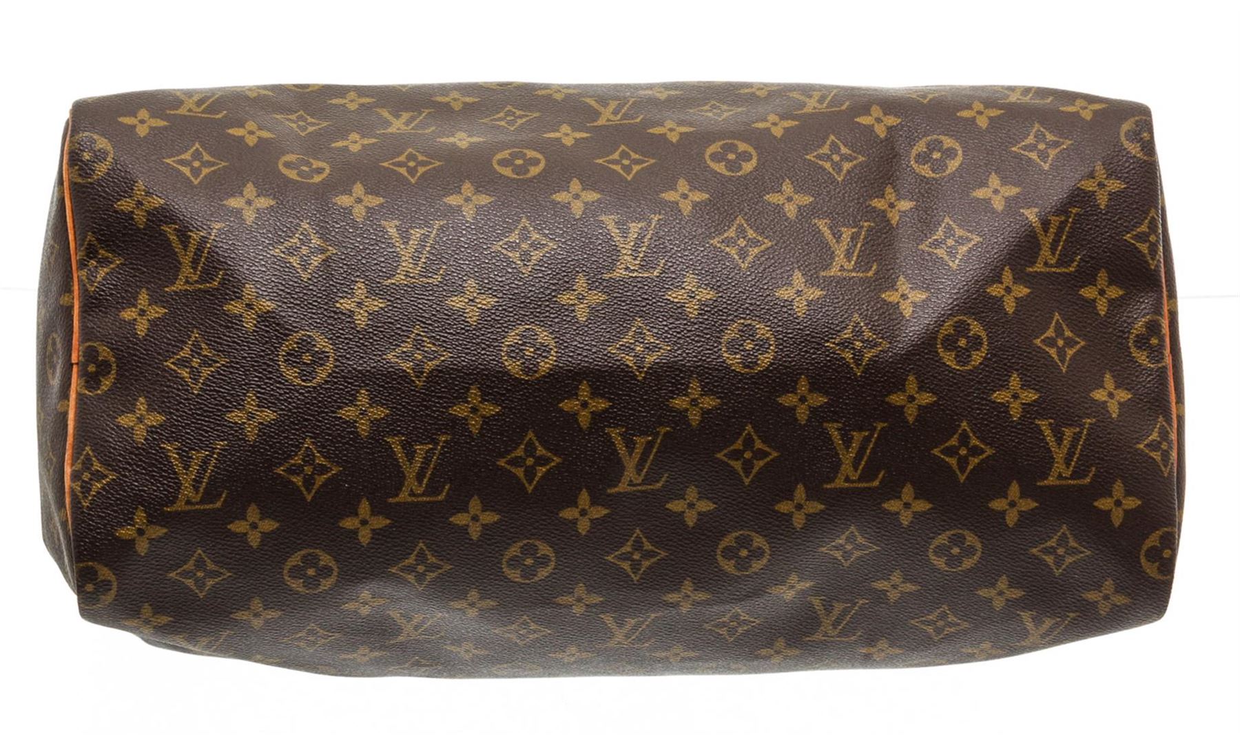 Brown and tan monogram coated canvas Louis Vuitton Speedy 40 with brass hardware, tan vachetta leather accents, dual rolled top handles, brown canvas lining, single pocket at interior wall and zip closure at top.