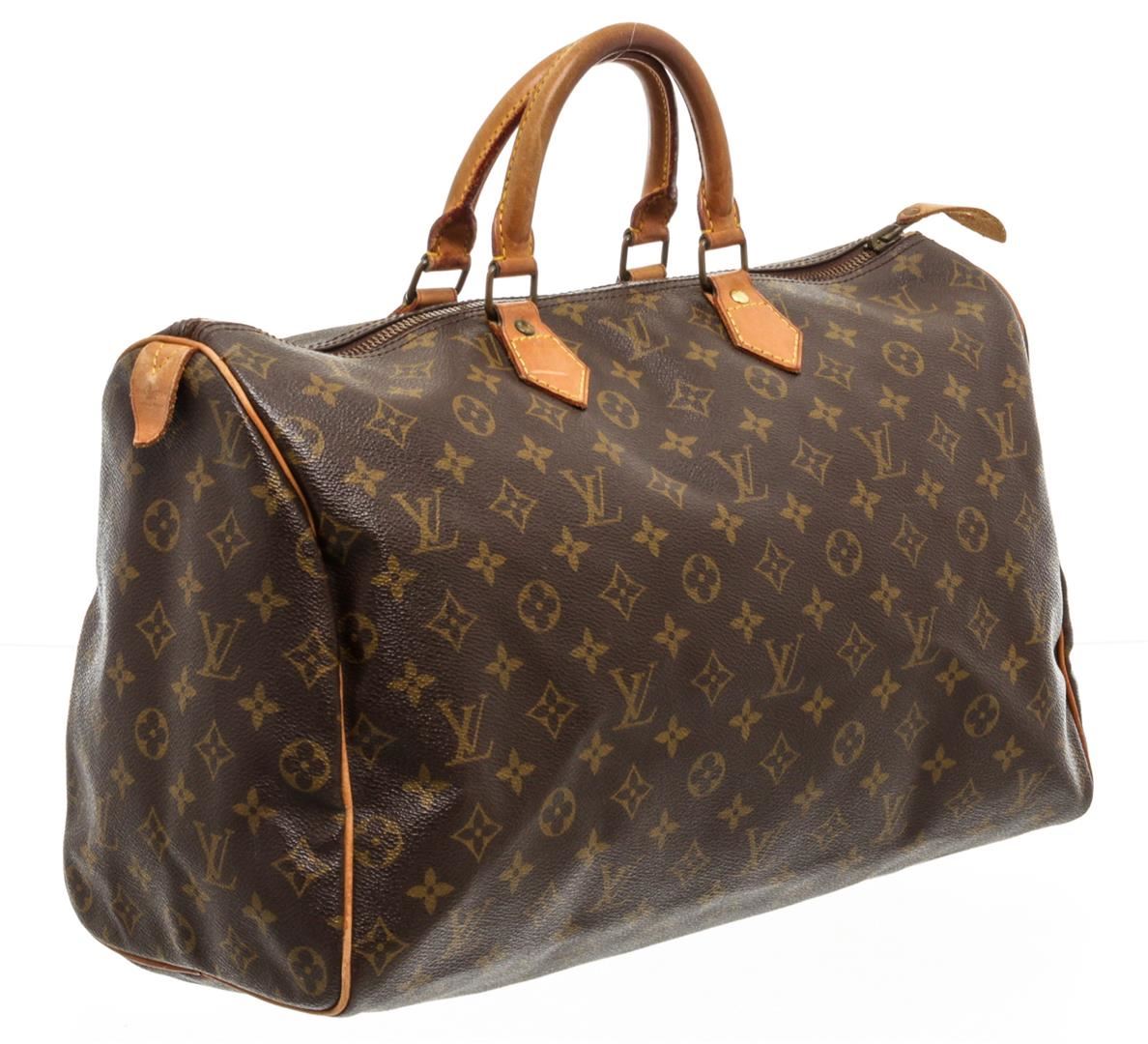 Brown and tan monogram coated canvas Louis Vuitton Speedy 40 with brass hardware, tan vachetta leather accents, dual rolled top handles, brown canvas lining, single pocket at interior wall and zip closure at top.