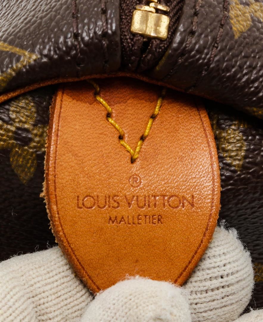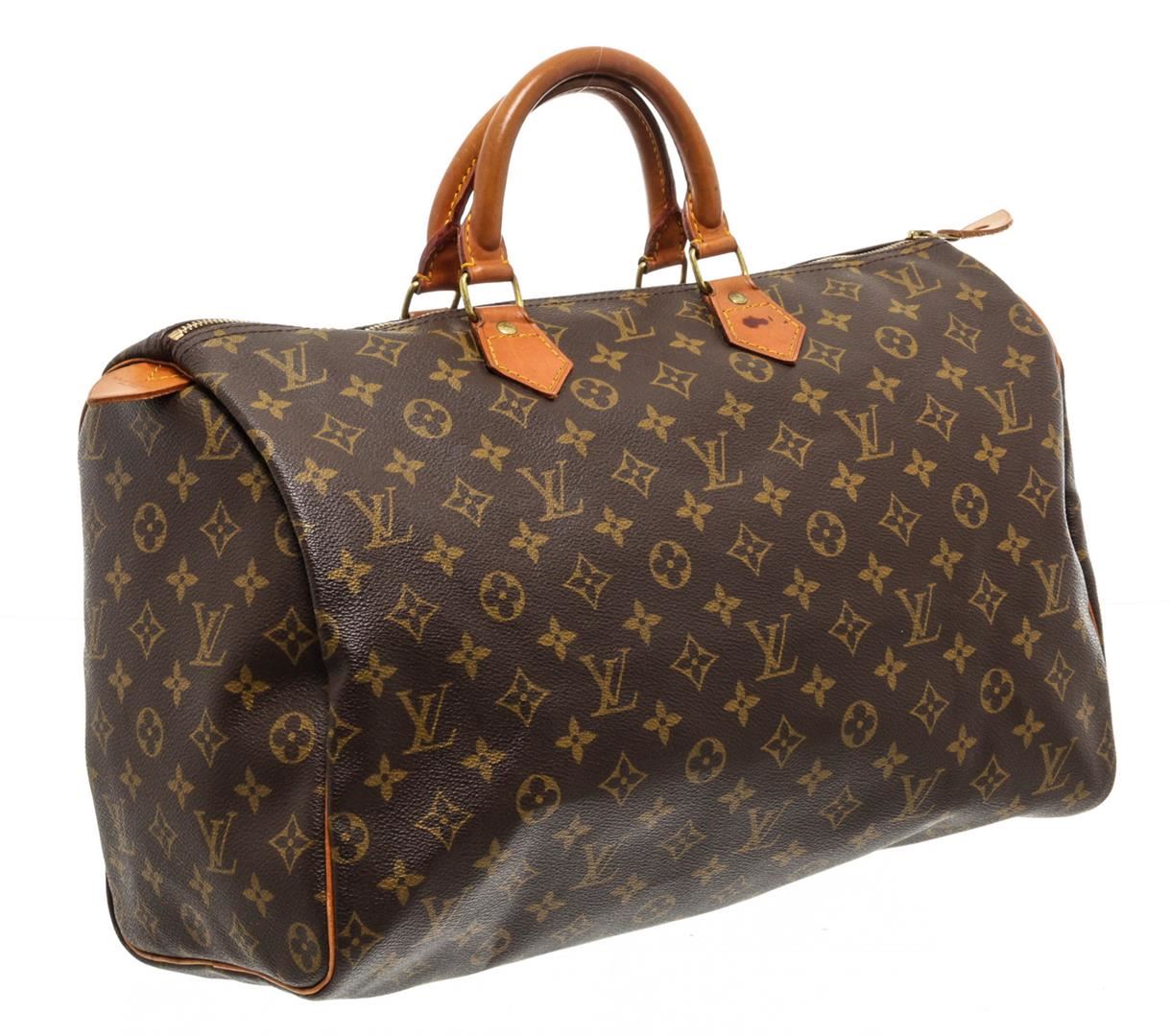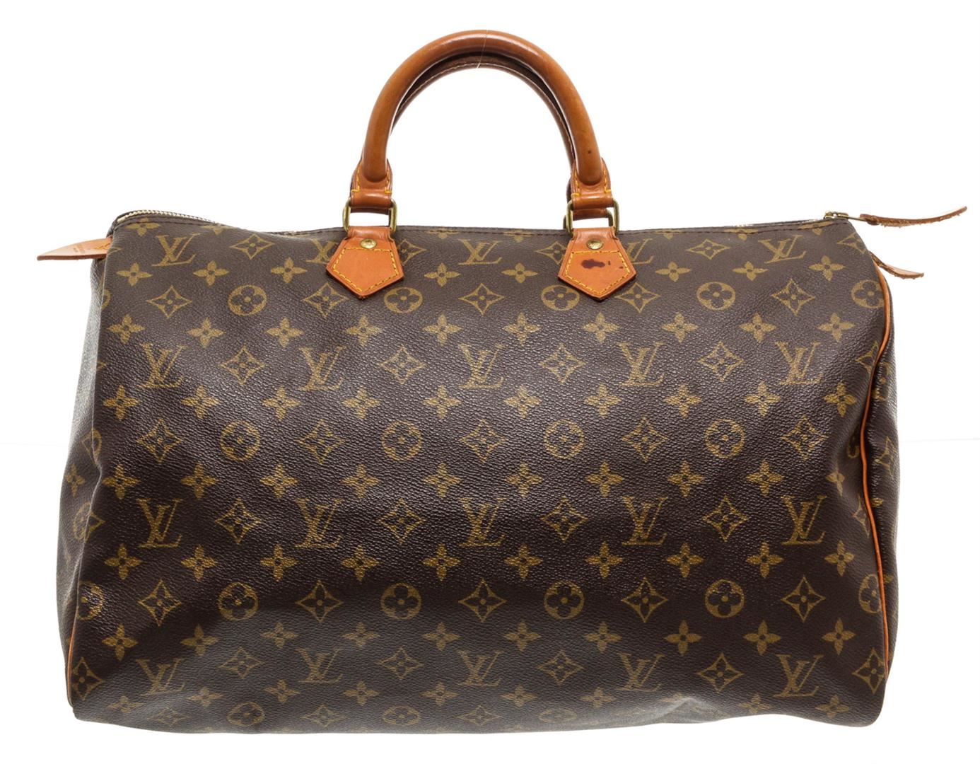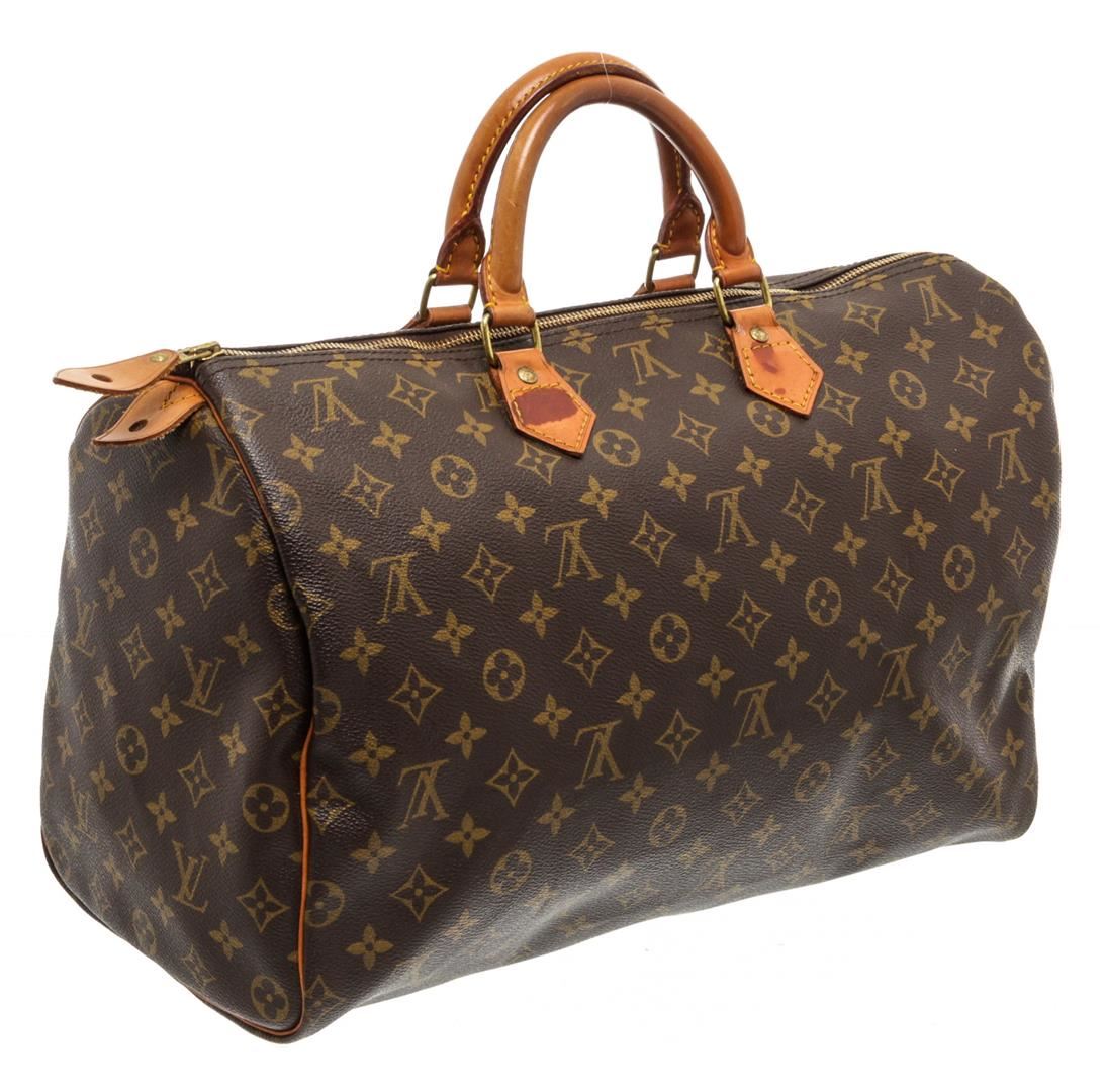 Brown and tan monogram coated canvas Louis Vuitton Speedy 40 with brass hardware, tan vachetta leather accents, dual rolled top handles, brown canvas lining, single pocket at interior wall and zip closure at top.