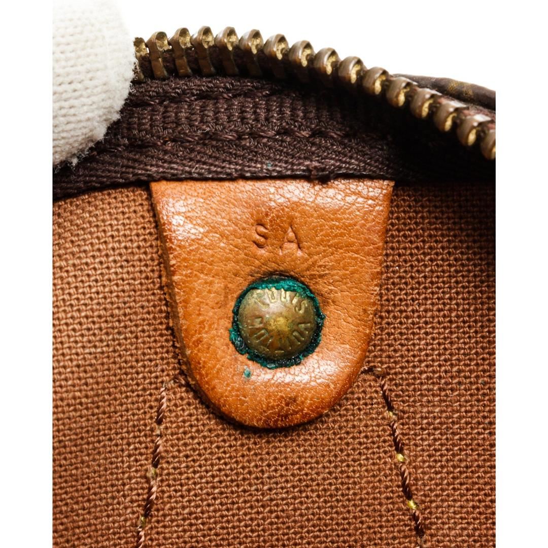 Brown and tan monogram coated canvas Louis Vuitton Speedy 40 with brass hardware, tan vachetta leather accents, dual rolled top handles, brown canvas lining, single pocket at interior wall and zip closure at top.