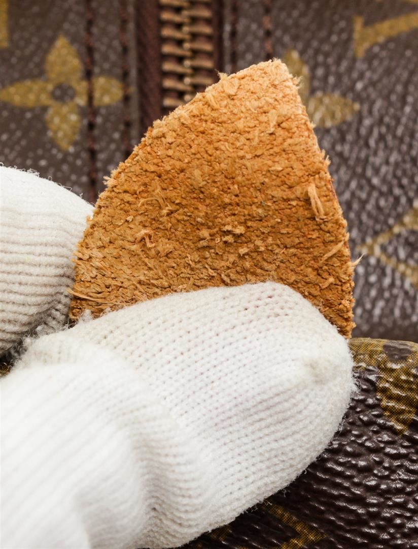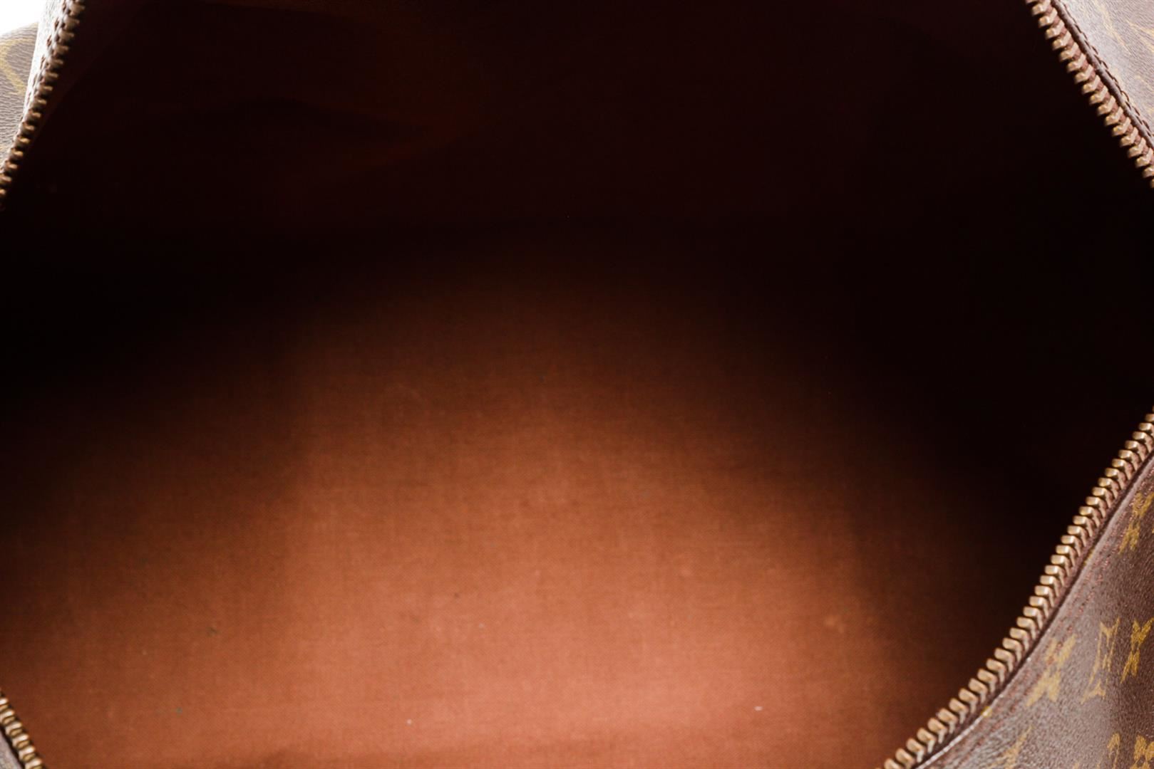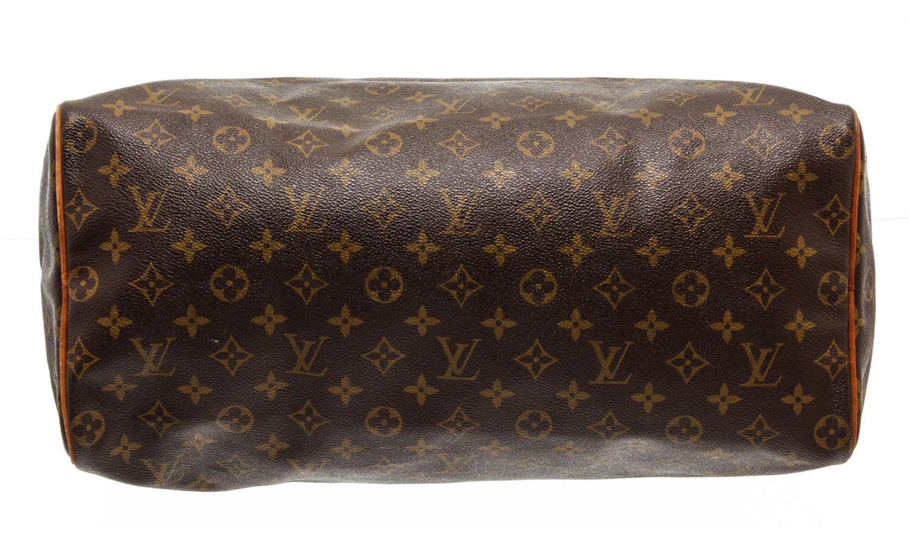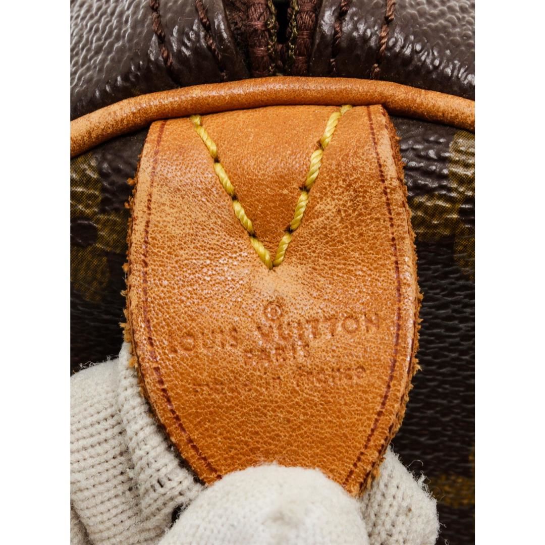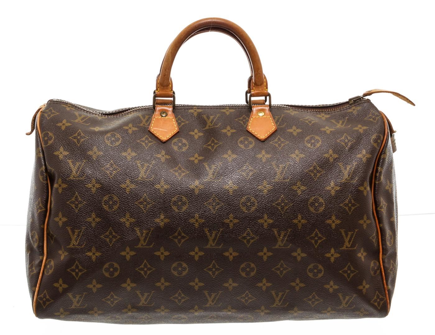 Brown and tan monogram coated canvas Louis Vuitton Speedy 40 with brass hardware, tan vachetta leather accents, dual rolled top handles, brown canvas lining, single pocket at interior wall and zip closure at top.