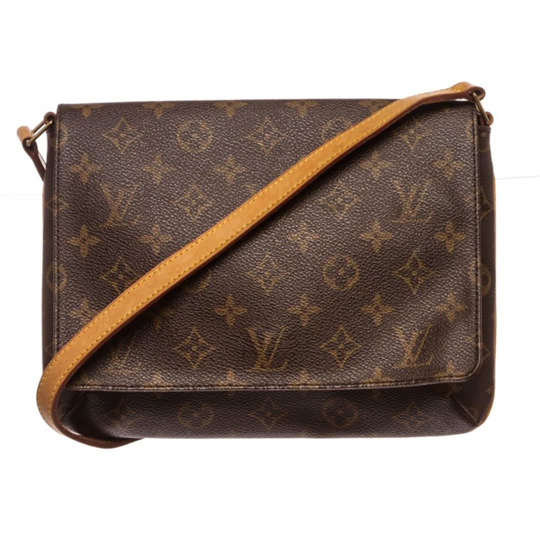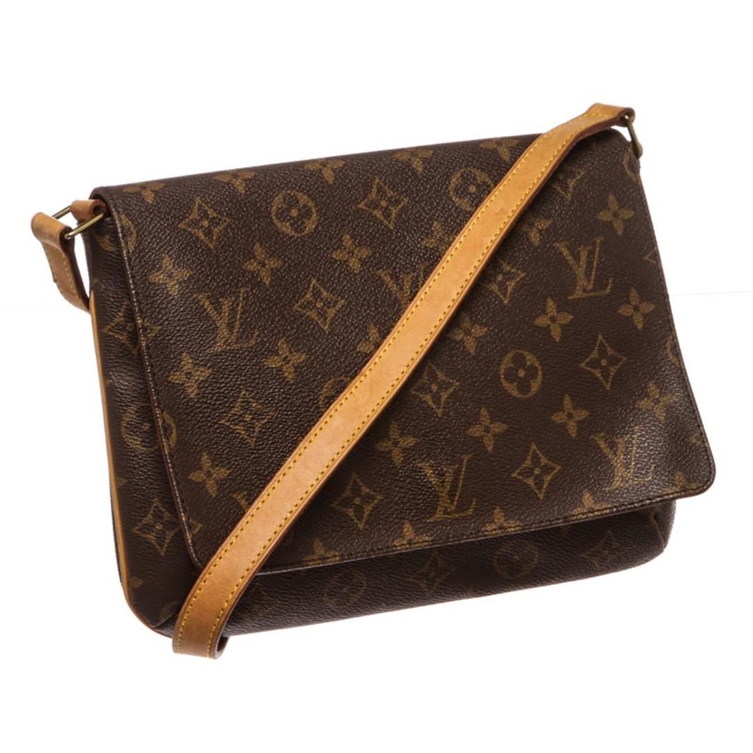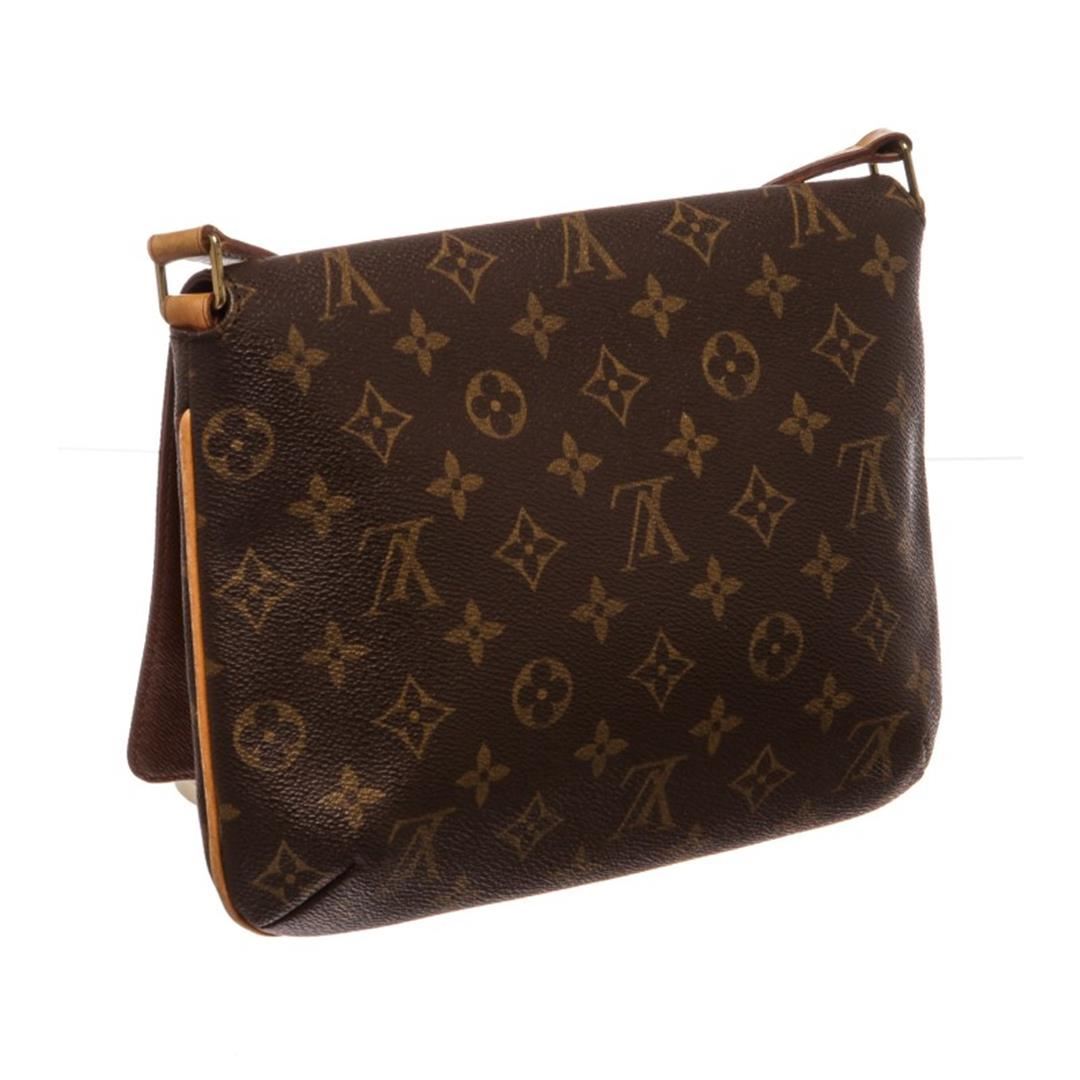 Brown and tan monogram coated canvas Louis Vuitton Musette Tango bag with brass hardware, tan vachetta leather trim, single flat shoulder strap, marigold Alcantara lining, single pocket at interior wall and magnetic snap closure at front flap. Item is Pre-Owned.