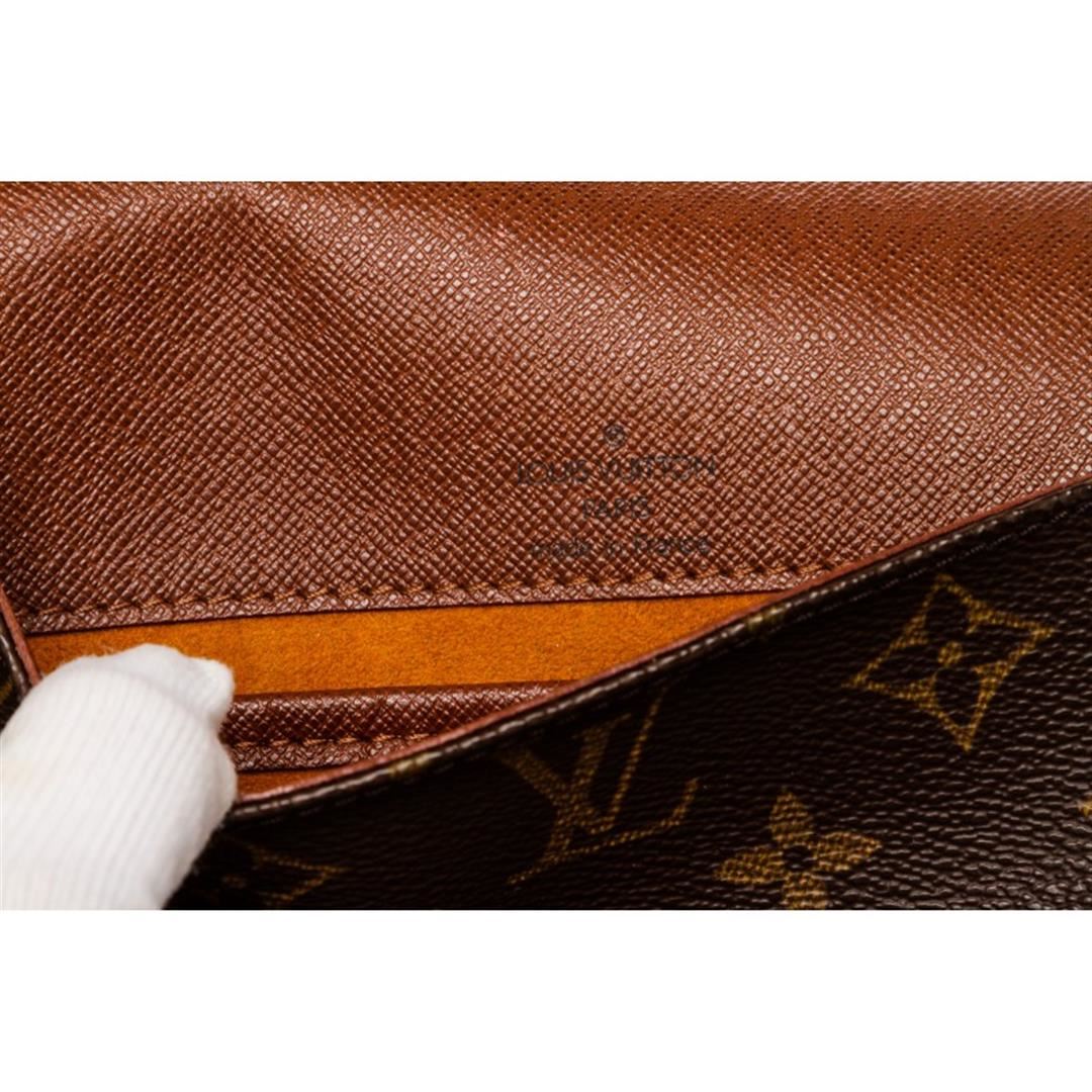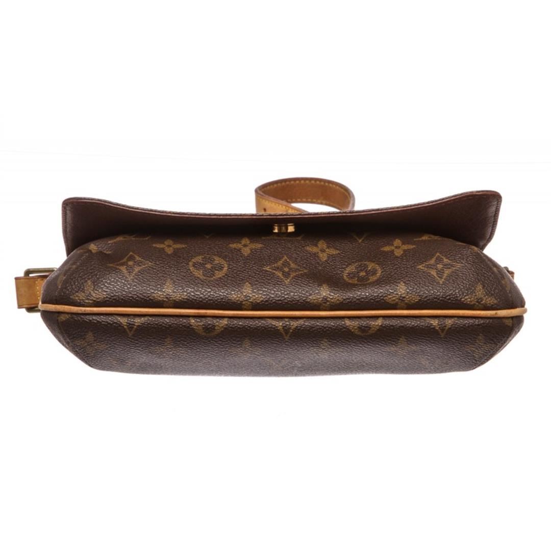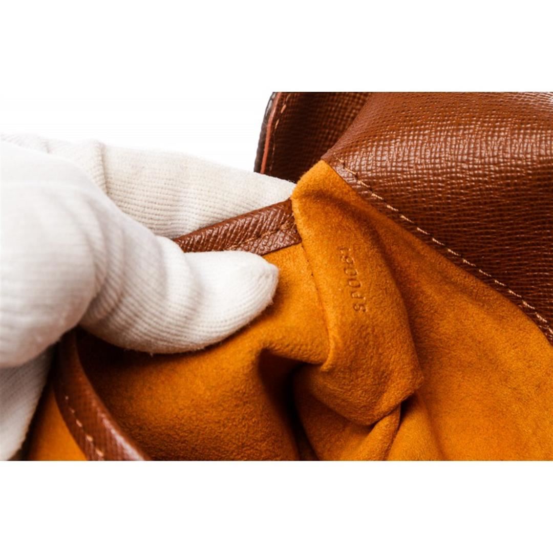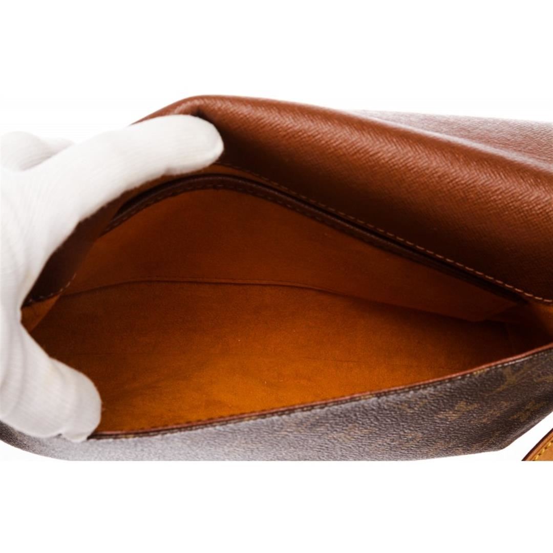 Brown and tan monogram coated canvas Louis Vuitton Musette Tango bag with brass hardware, tan vachetta leather trim, single flat shoulder strap, marigold Alcantara lining, single pocket at interior wall and magnetic snap closure at front flap. Item is Pre-Owned.