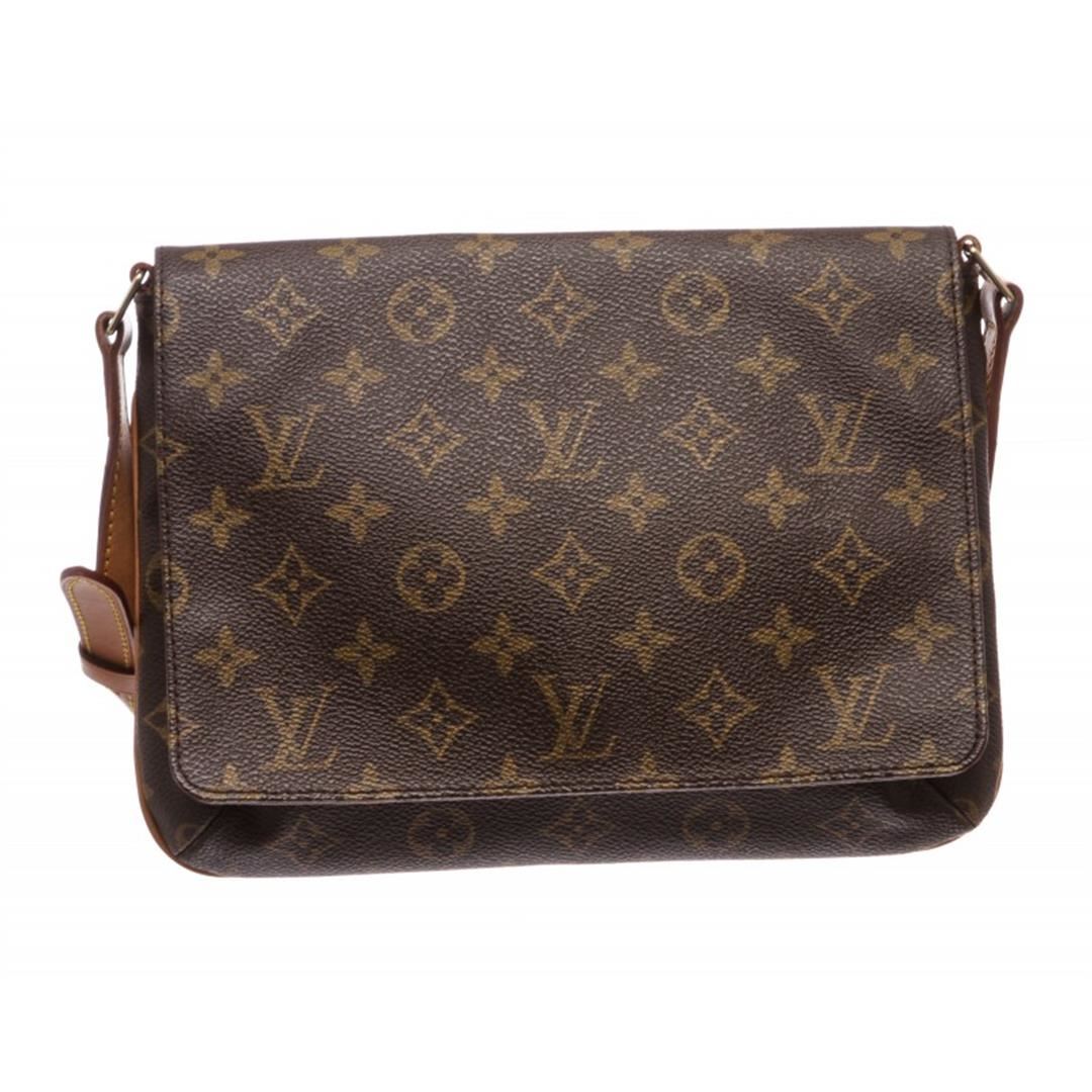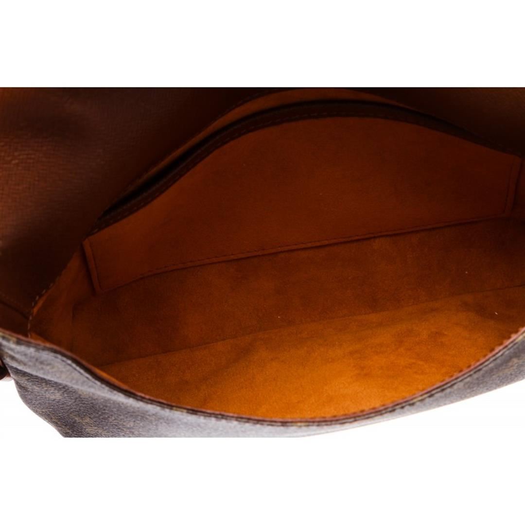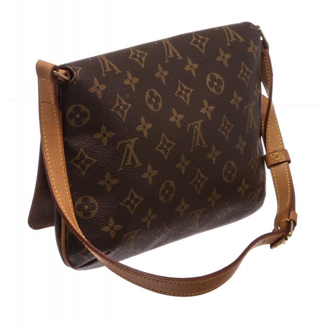 Brown and tan monogram coated canvas Louis Vuitton Musette Tango bag with brass hardware, tan vachetta leather trim, single flat shoulder strap, marigold Alcantara lining, single pocket at interior wall and magnetic snap closure at front flap. Item is Pre-Owned.