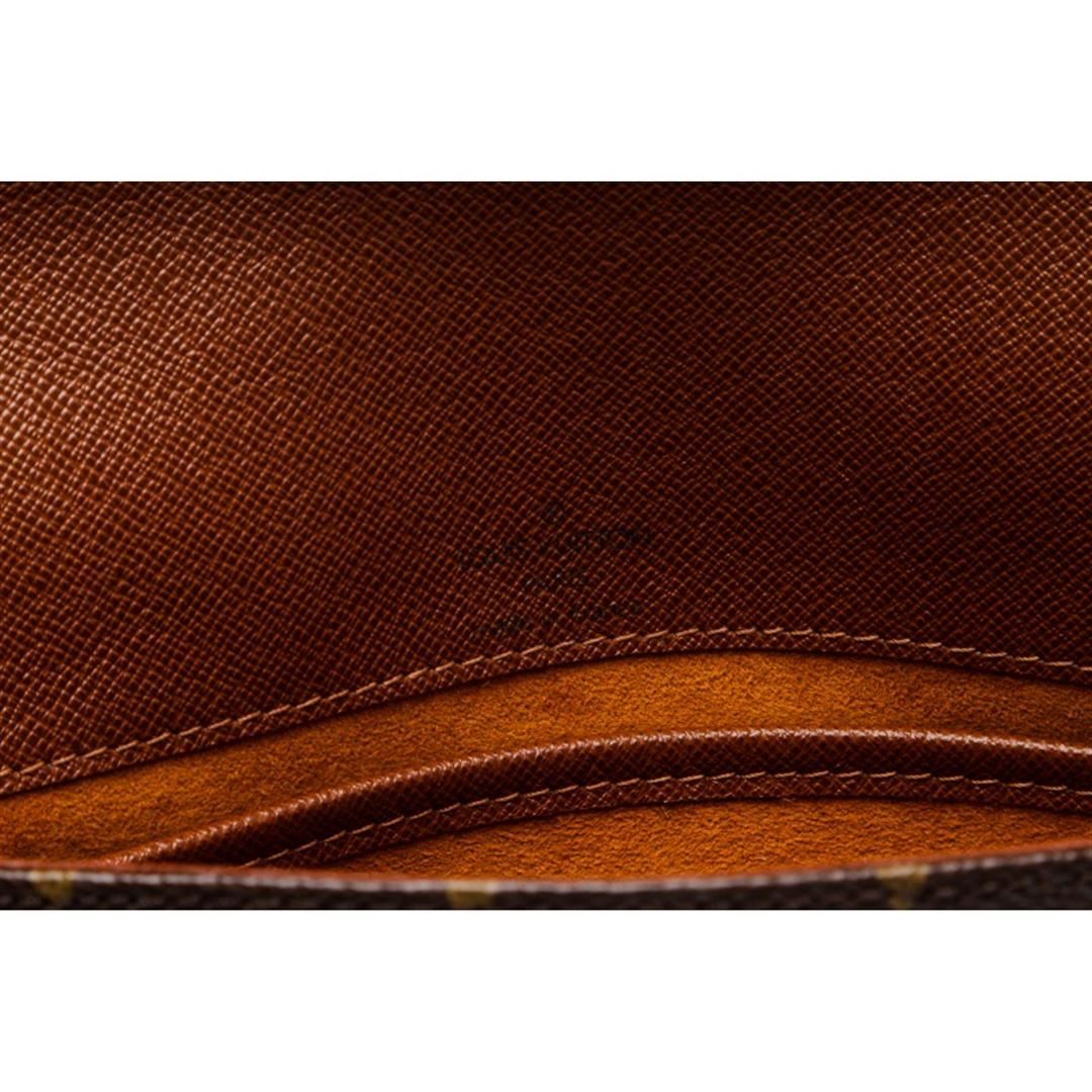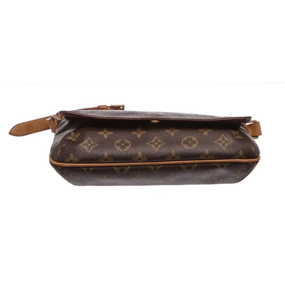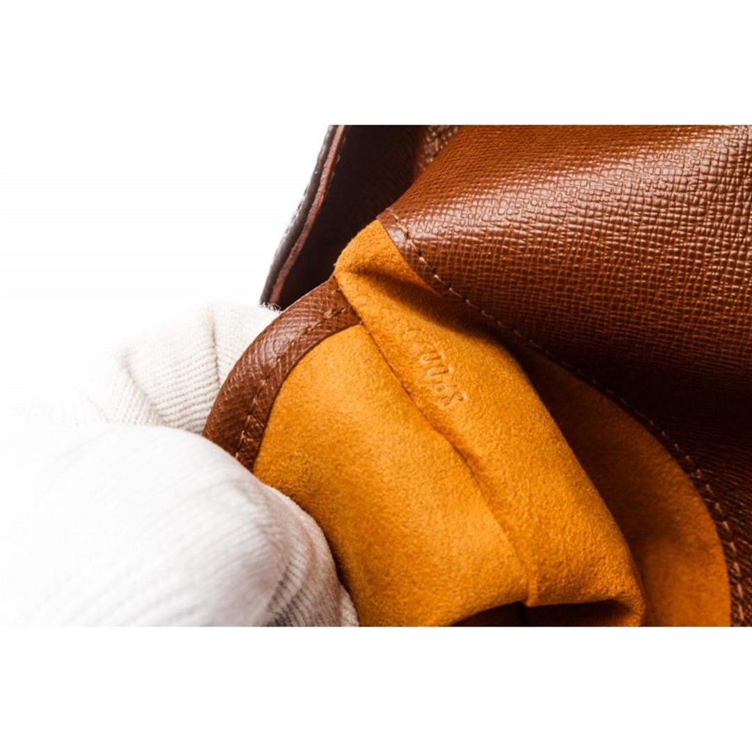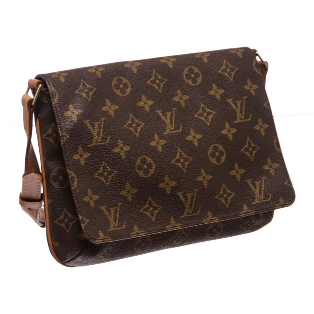 Brown and tan monogram coated canvas Louis Vuitton Musette Tango bag with brass hardware, tan vachetta leather trim, single flat shoulder strap, marigold Alcantara lining, single pocket at interior wall and magnetic snap closure at front flap. Item is Pre-Owned.