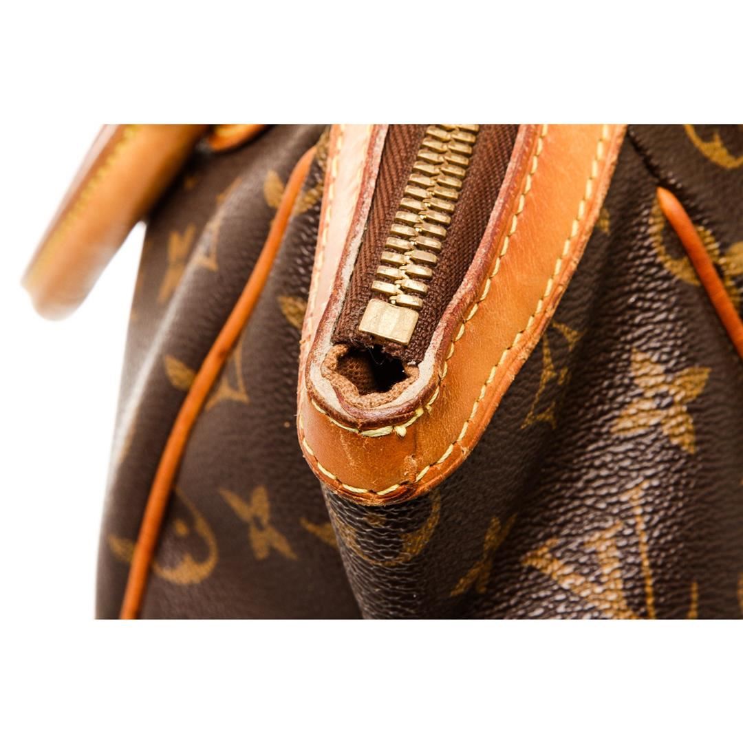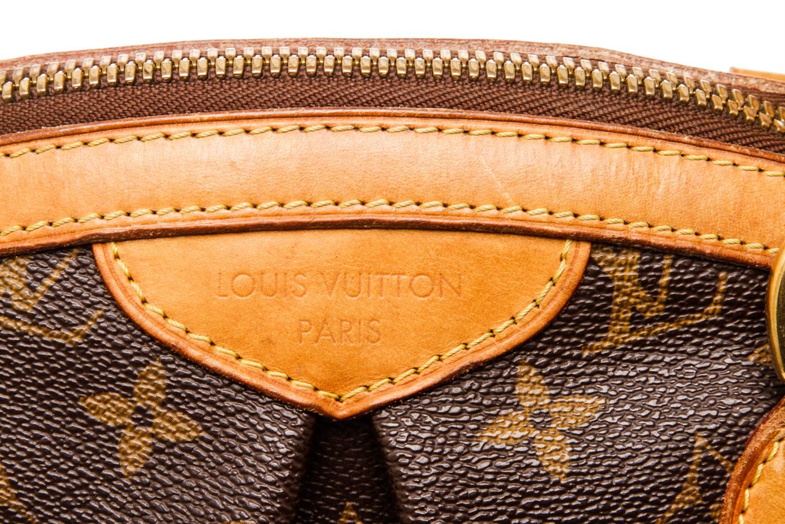 Brown and tan monogram coated canvas Louis Vuitton Tivoli PM with brass hardware, tan vachetta leather trim, dual rolled top handles, brown woven lining, dual pockets at interior wall and zip closure at top.