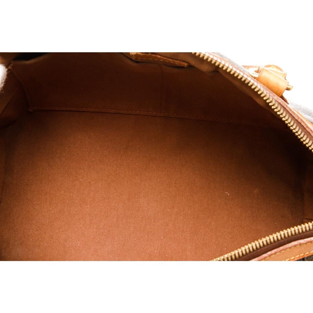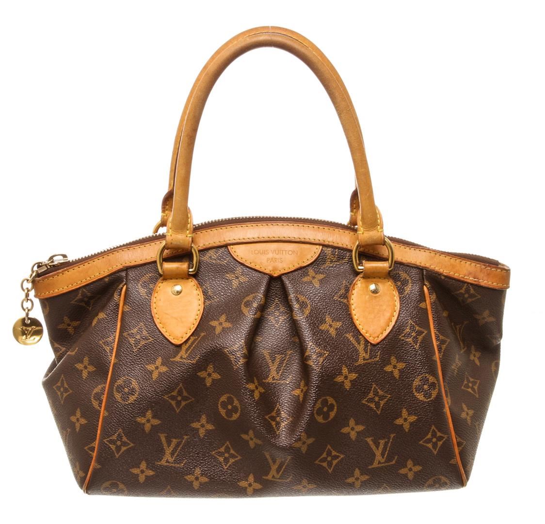Brown and tan monogram coated canvas Louis Vuitton Tivoli PM with brass hardware, tan vachetta leather trim, dual rolled top handles, brown woven lining, dual pockets at interior wall and zip closure at top.
