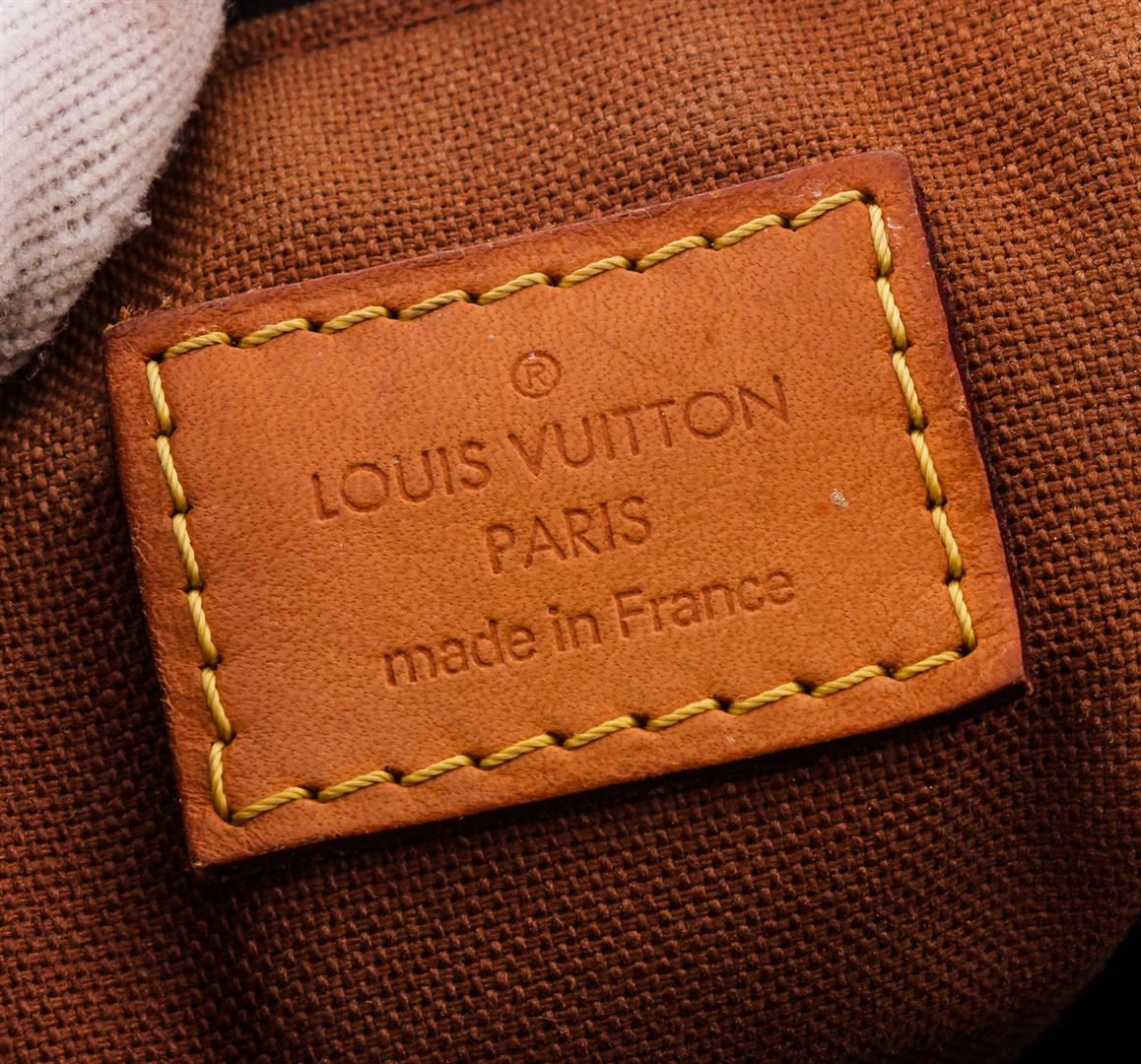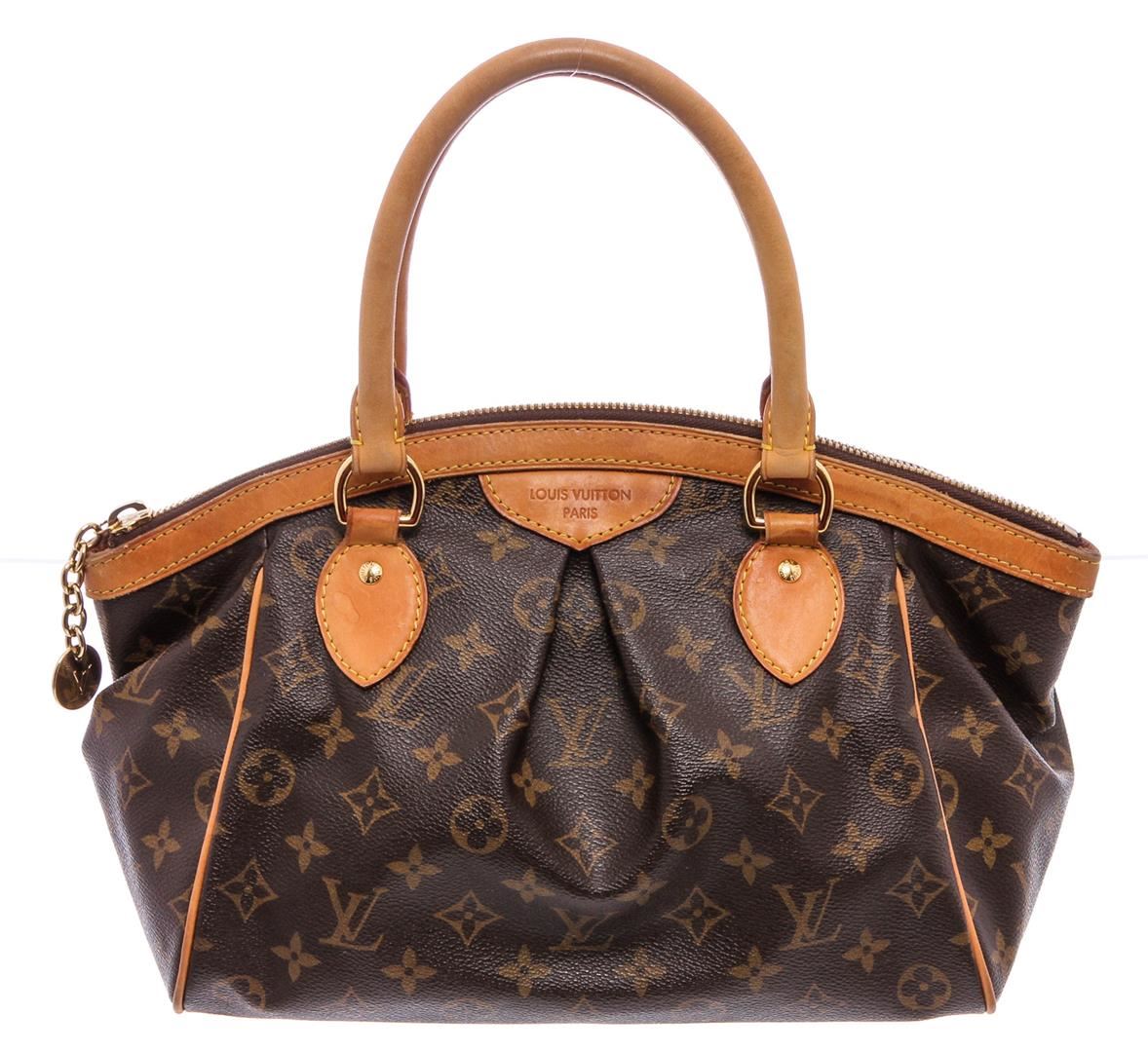 One Louis Vuitton Monogram Canvas Leather Tivoli PM Bag. Brown and tan monogram coated canvas Louis Vuitton Tivoli PM with brass hardware, tan vachetta leather trim, dual rolled top handles, brown woven lining, dual pockets at interior wall and zip closure at top.