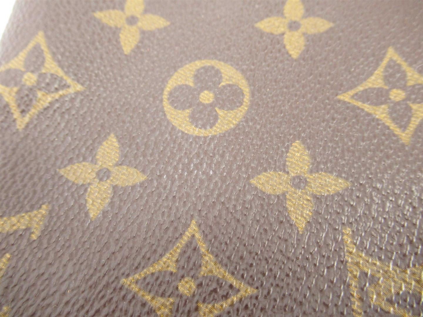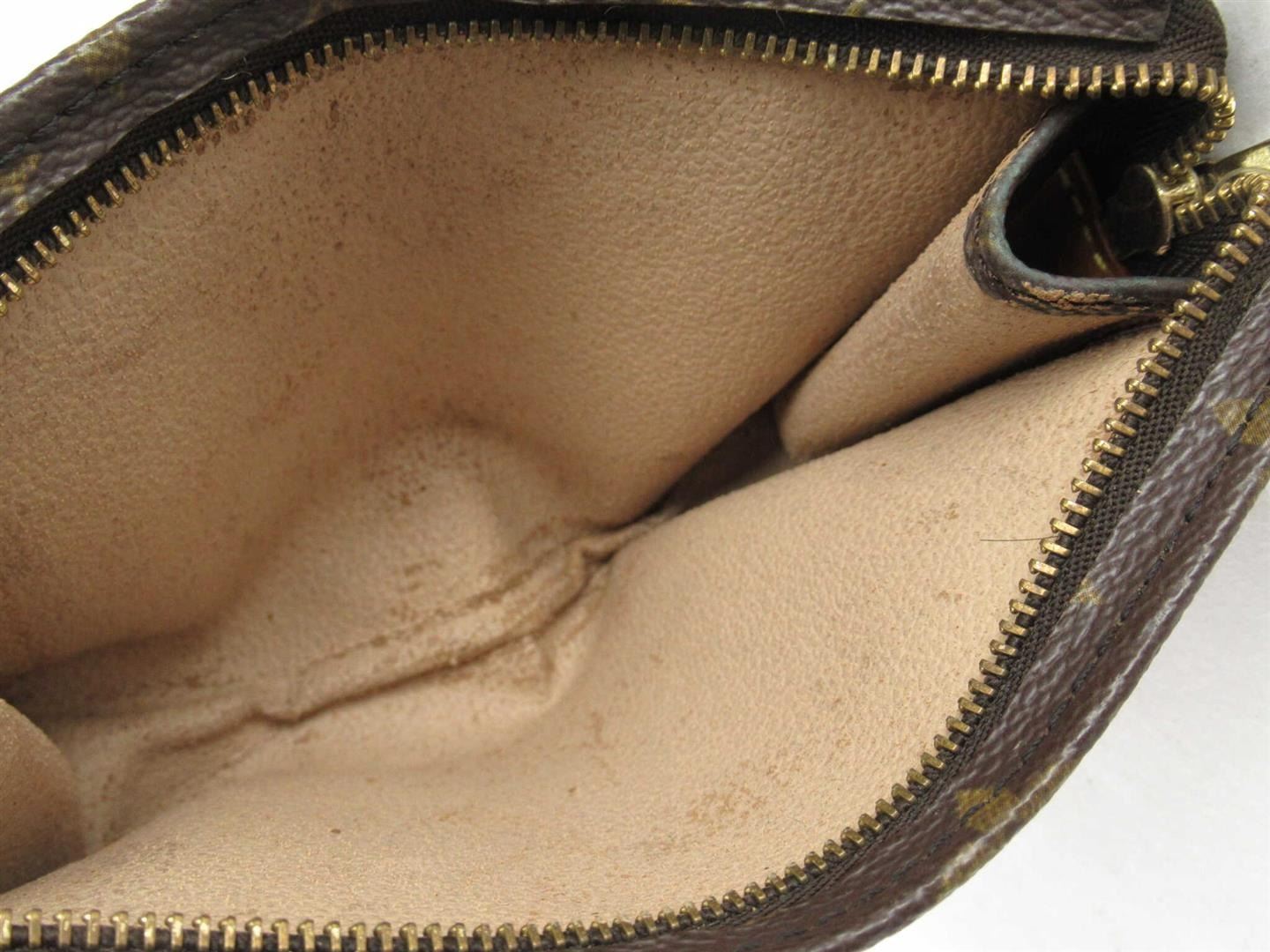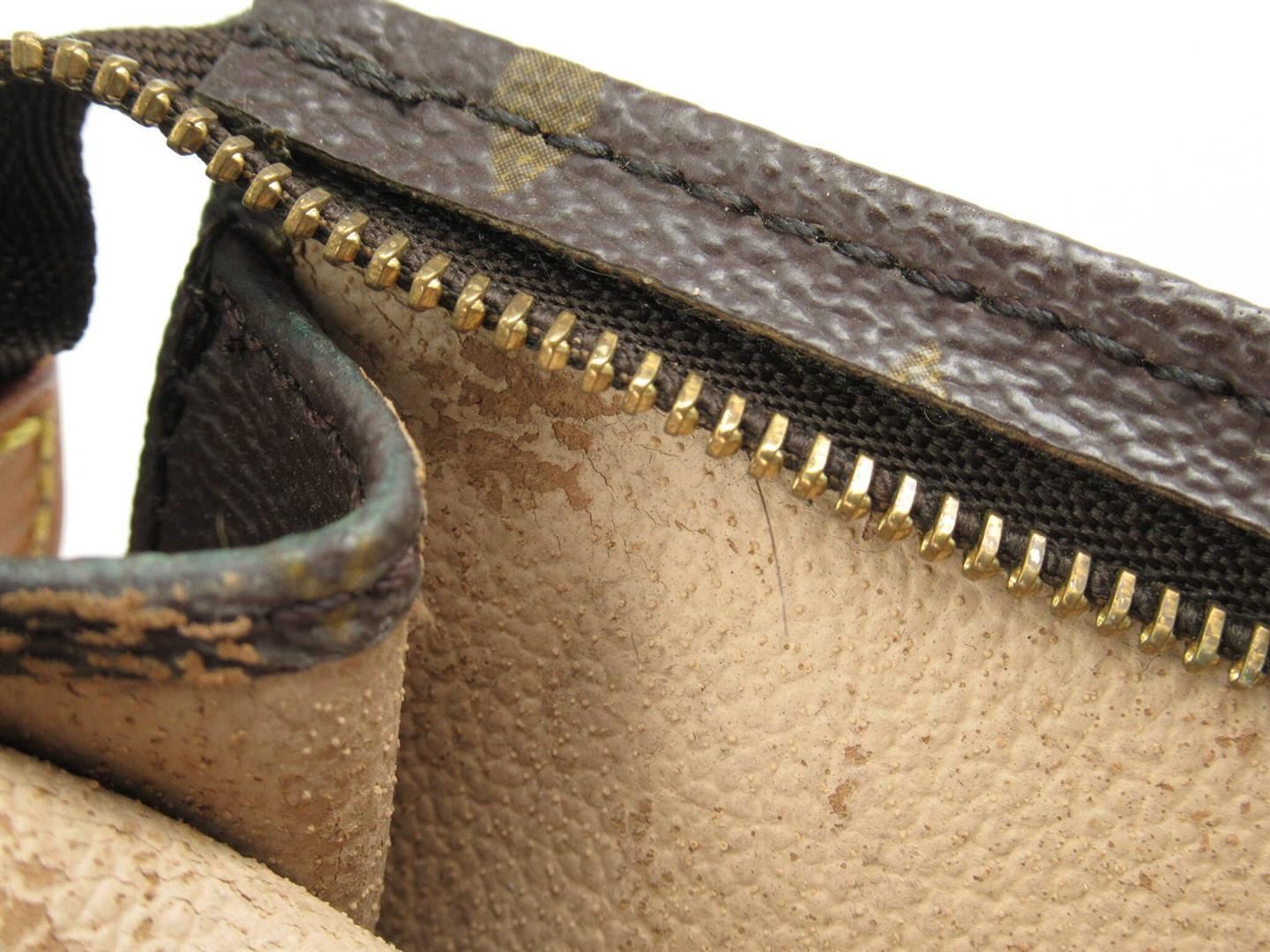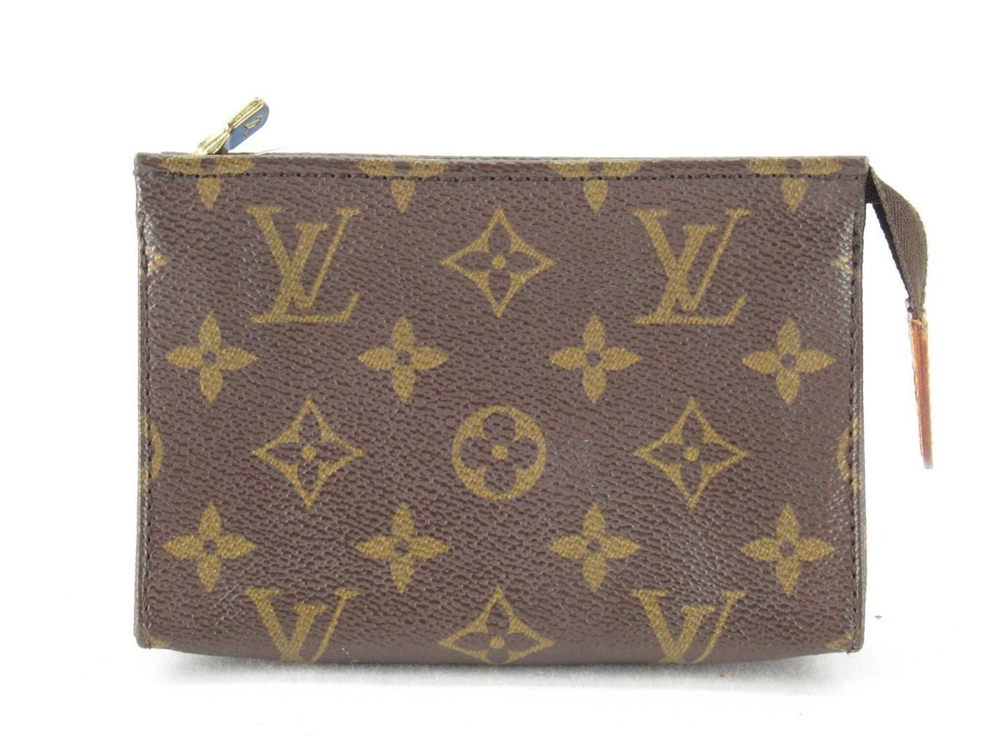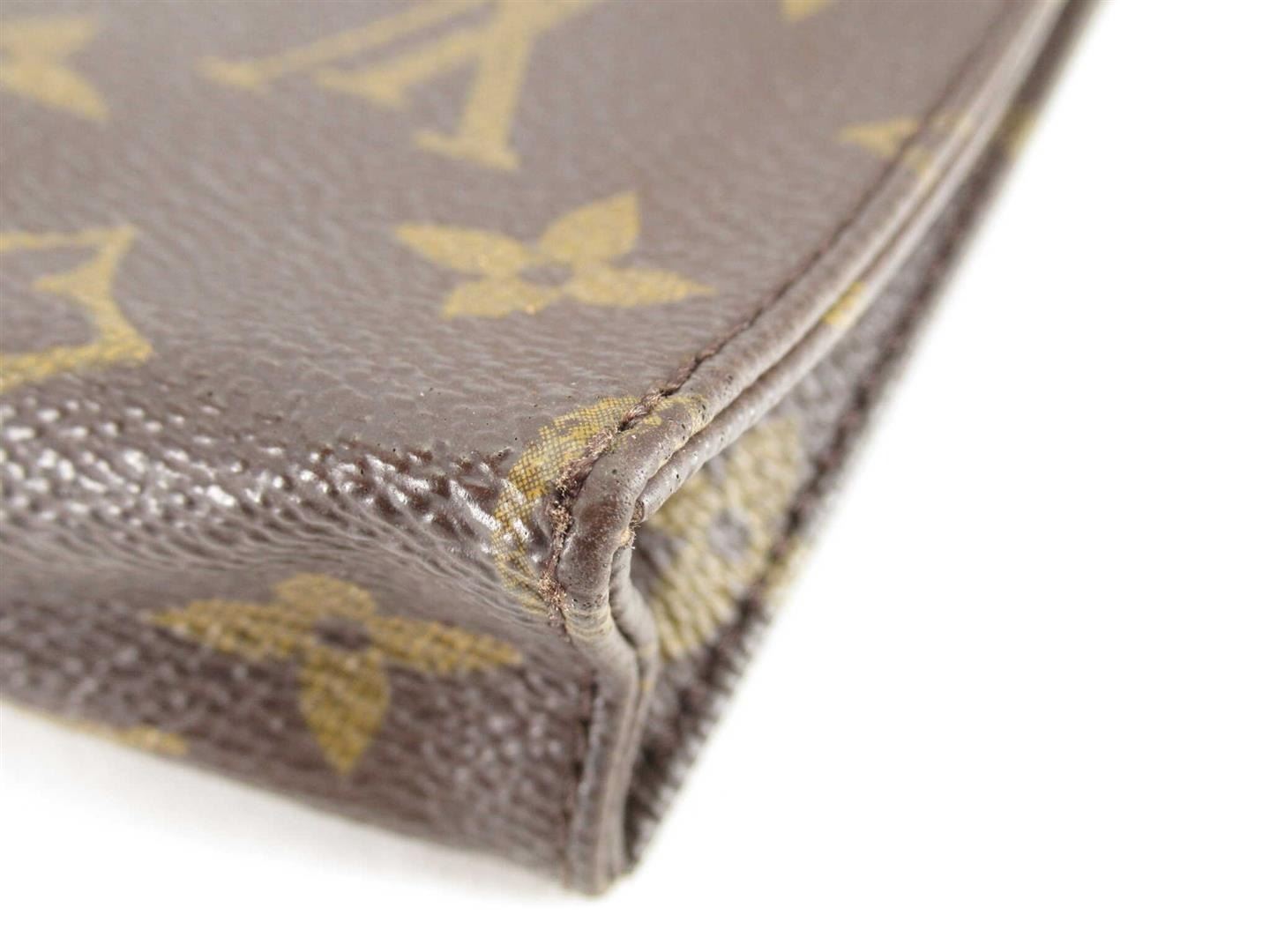 Brown and tan monogram coated canvas Louis Vuitton Toiletry Pouch 15 with gold-tone hardware, brown Vachetta leather trim, beige coated canvas lining and zip closure at top. Please note: interior is peeling/sticky.