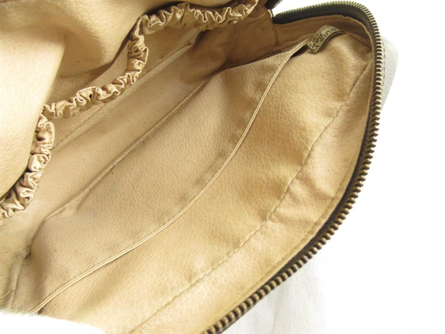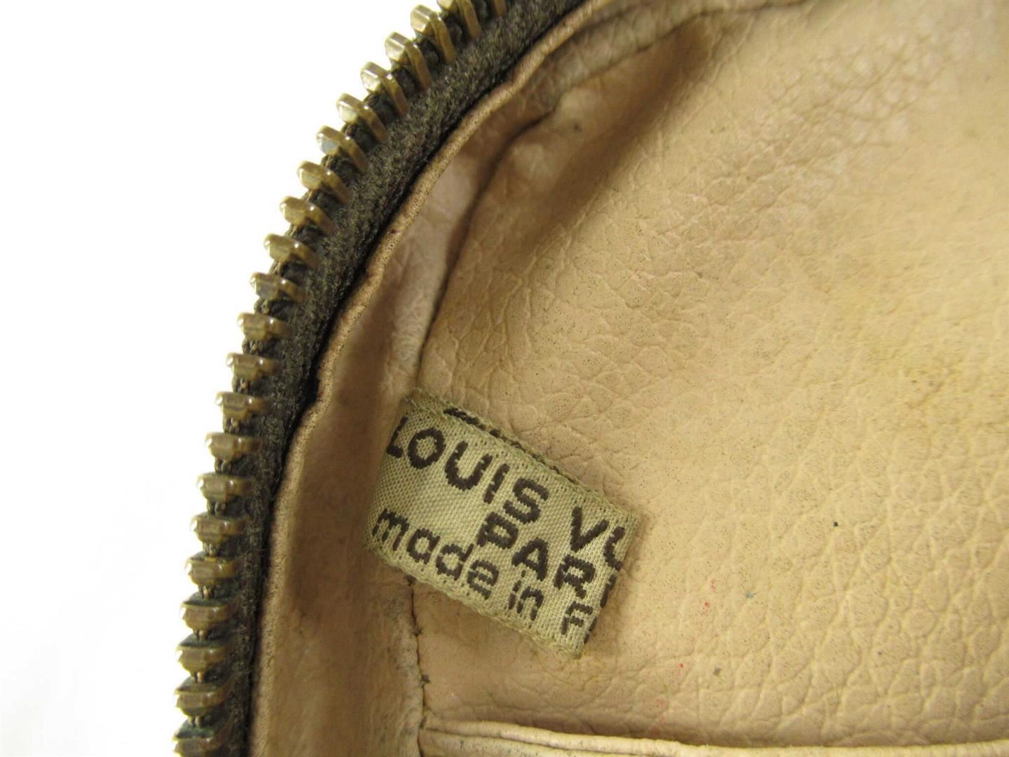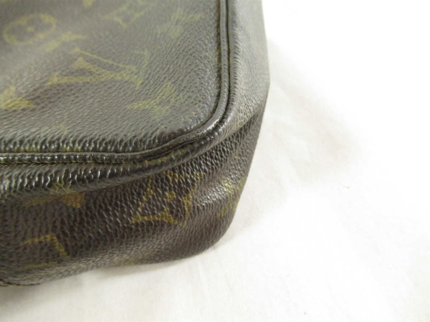 Brown and tan monogram coated canvas Louis Vuitton Toiletry MM with brass hardware, creme coated canvas lining, single slit pocket, three elasticized straps and zip-around closure at top.