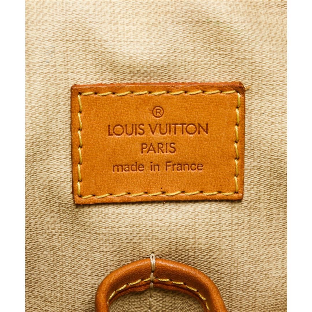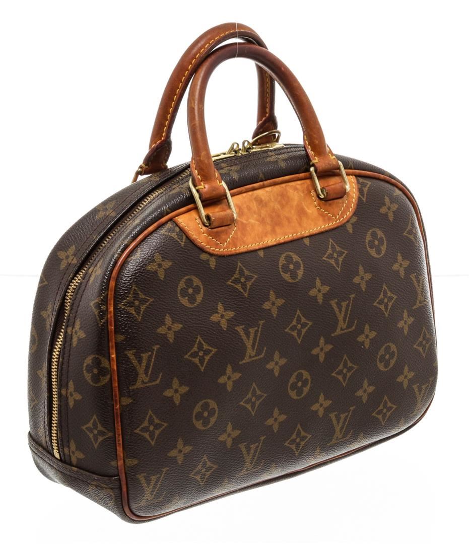 Brown and tan monogram coated canvas Louis Vuitton Trouville bag with brass hardware, tan vachetta leather trim, dual rolled top handles, exterior slip pocket at front, creme canvas lining, four slip pockets at interior wall and two-way zip closures at top.