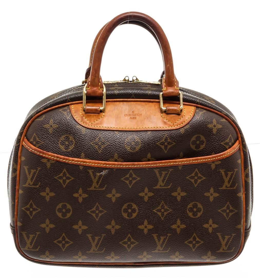 Brown and tan monogram coated canvas Louis Vuitton Trouville bag with brass hardware, tan vachetta leather trim, dual rolled top handles, exterior slip pocket at front, creme canvas lining, four slip pockets at interior wall and two-way zip closures at top.