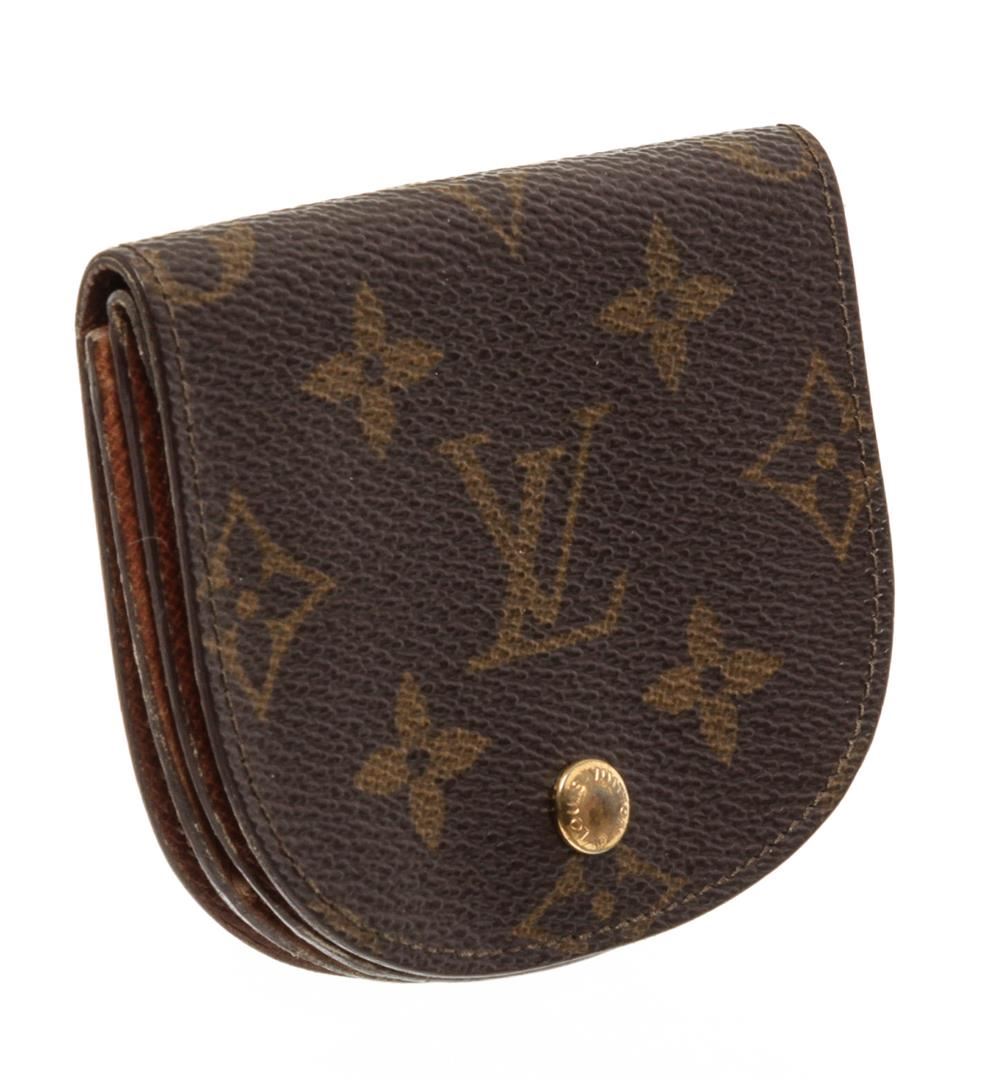 Brown monogram canvas leather Louis Vuitton vintage coin purse with brass hardware, brown leather lining, dual compartments, snap pocket at lining and snap closure. Authentic.