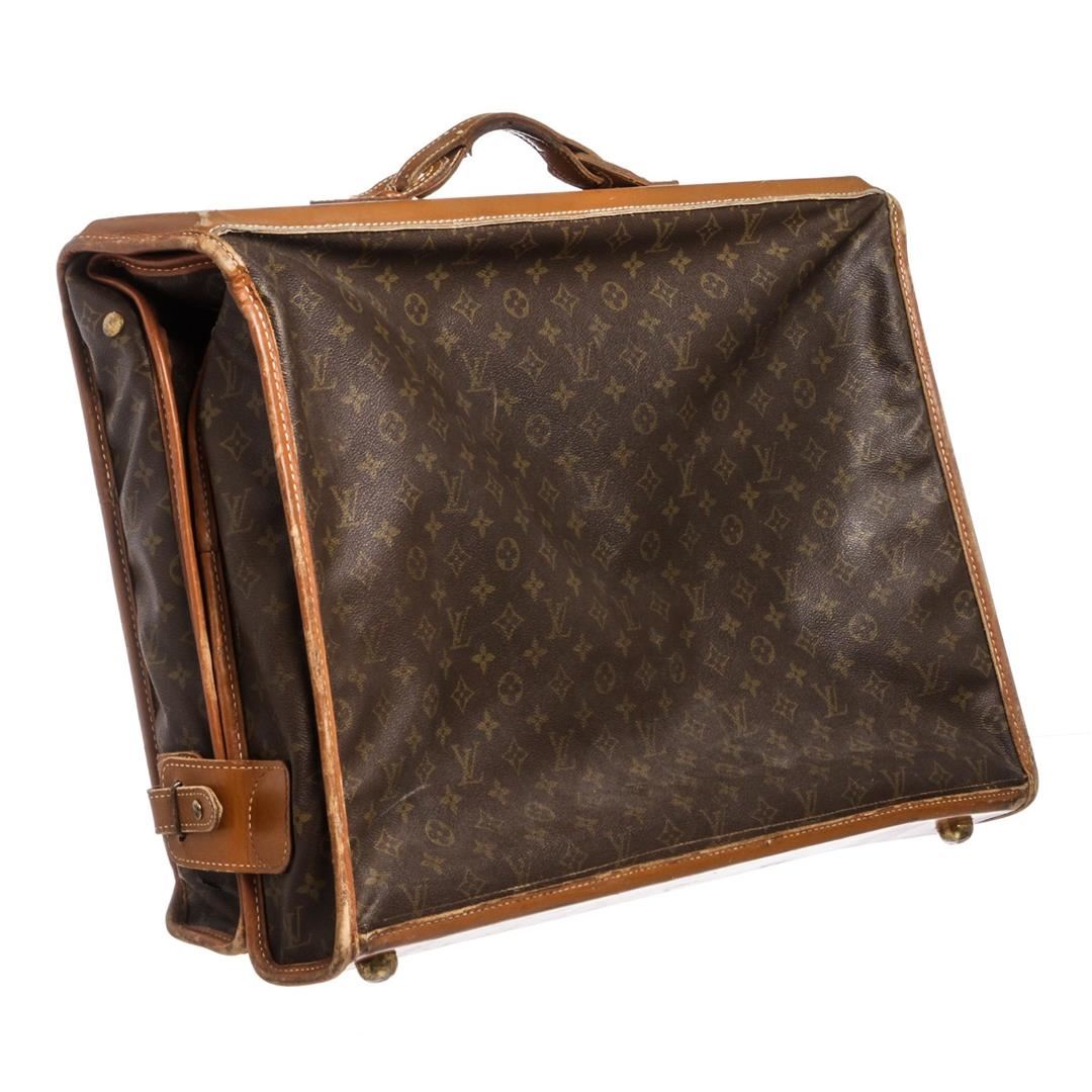 Monogram Louis Vuitton canvas leather vintage garment bag with gold tone hardware. Item is pre-owned. Item Dimensions: 22.5"x6.5" 17"-Folded 39"-Unfolded / 57.15cmx16.51cm 43.18cm- Folded-99.06cm.