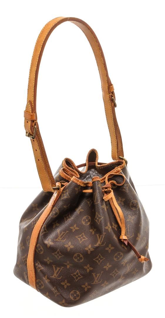 One Louis Vuitton Monogram Canvas Leather Vintage Noe PM Drawstring Shoulder Bag. Brown and tan monogram coated canvas Louis Vuitton Noe PM with brass hardware, tan vachetta leather accents, adjustable flat shoulder strap, brown canvas interior and drawstring tie closure at top.