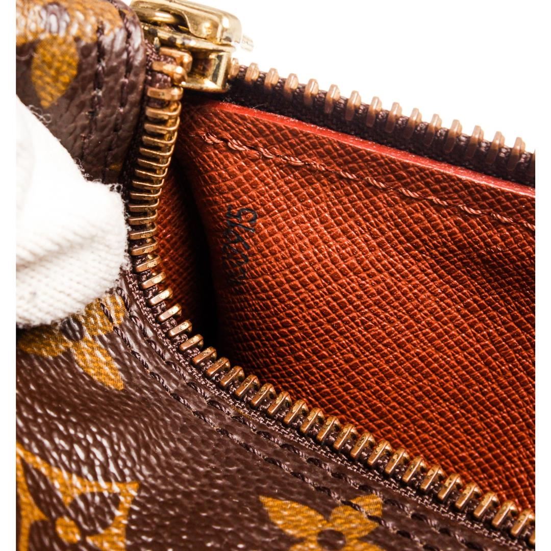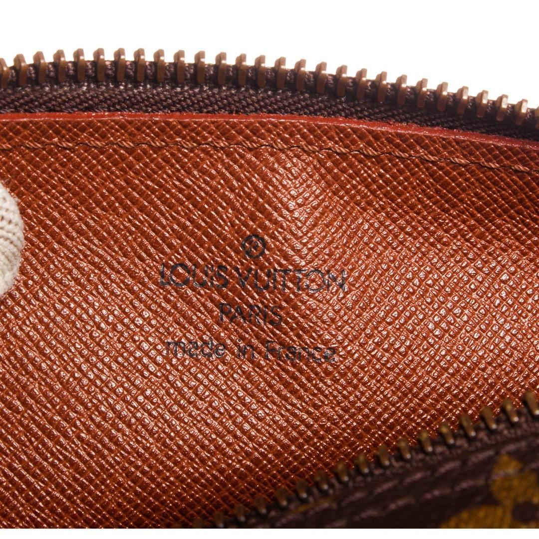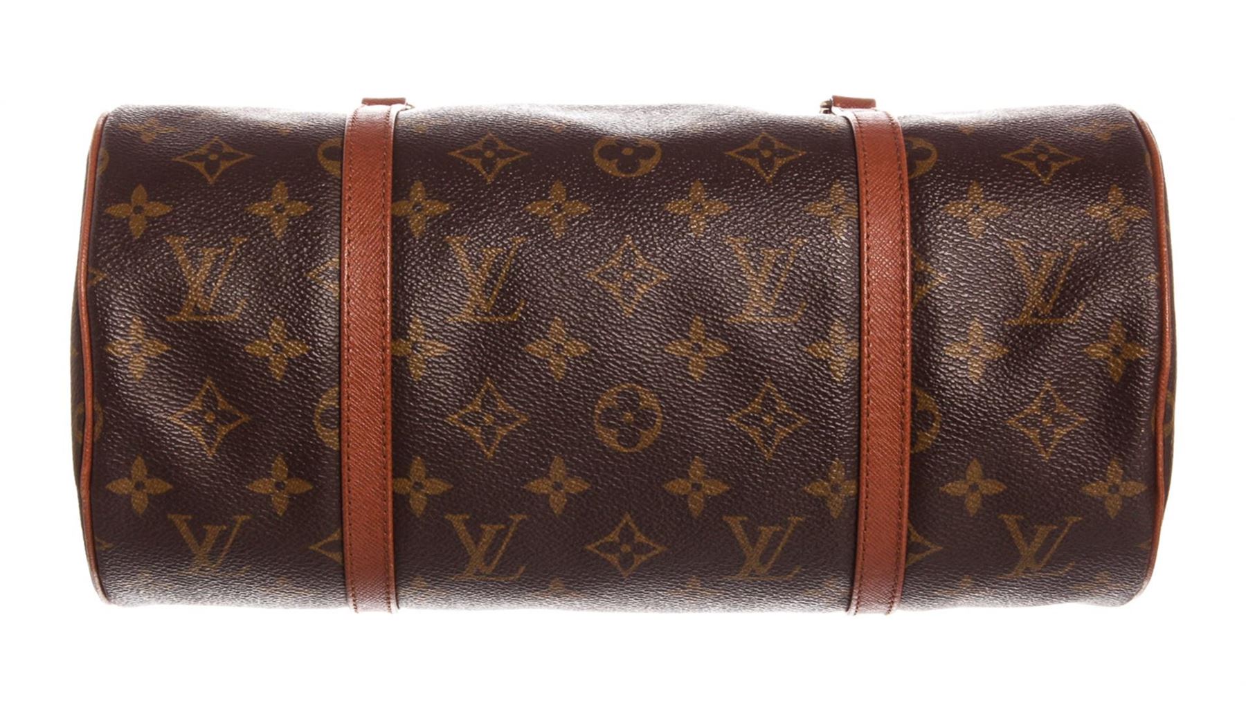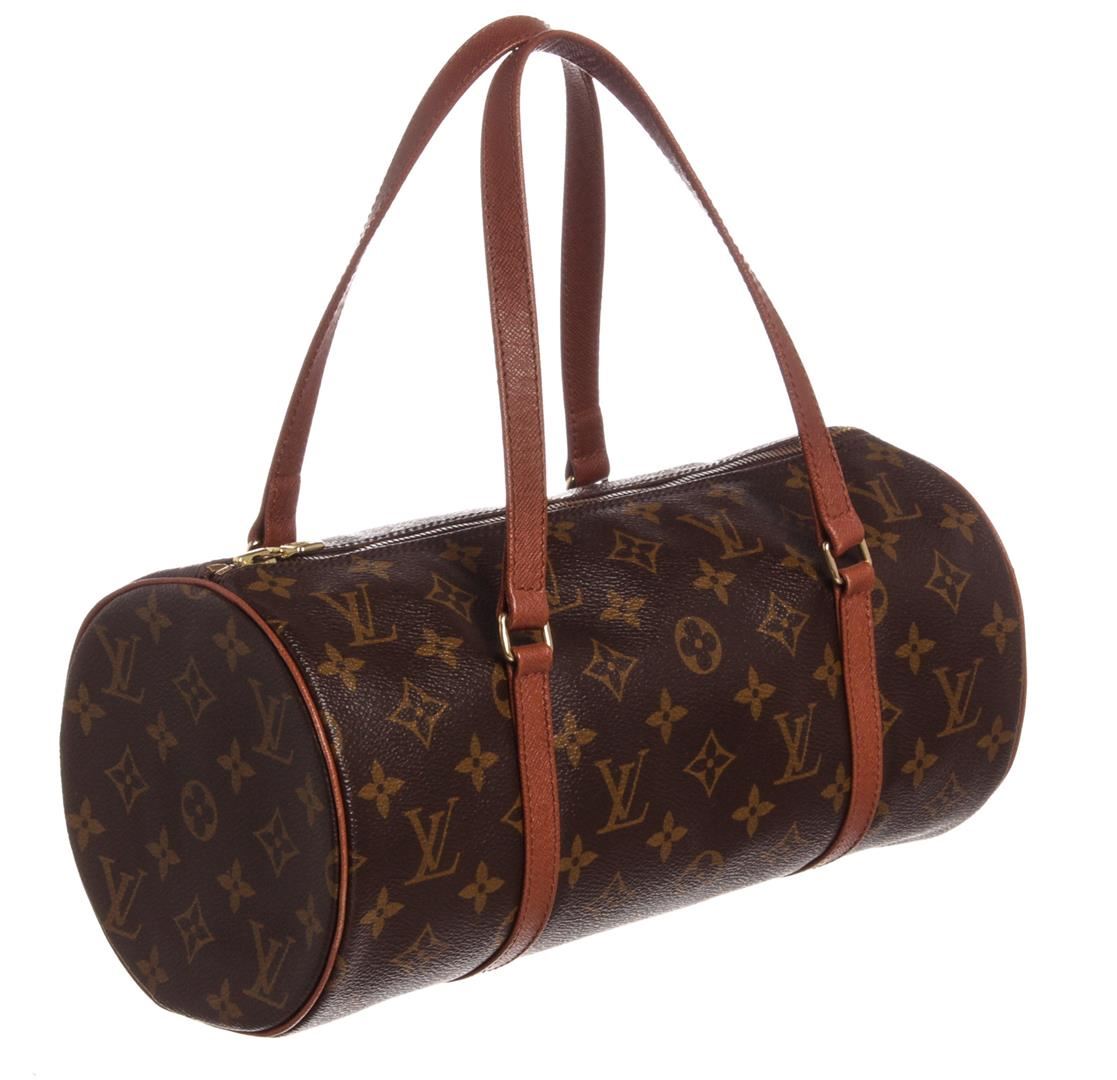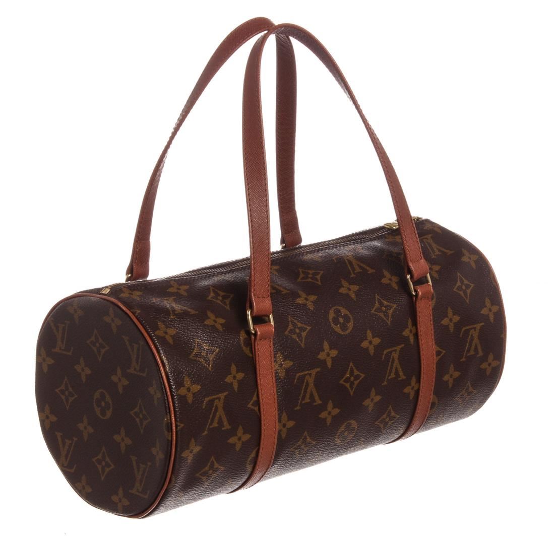 Brown and tan monogram coated canvas Louis Vuitton Vintage Papillon 26 with brass hardware, brown Taiga leather trim, dual flat handles, brown Taiga leather lining and zip closure at top.