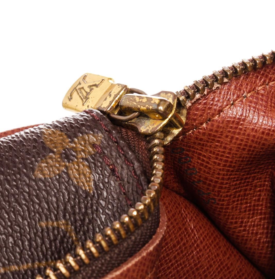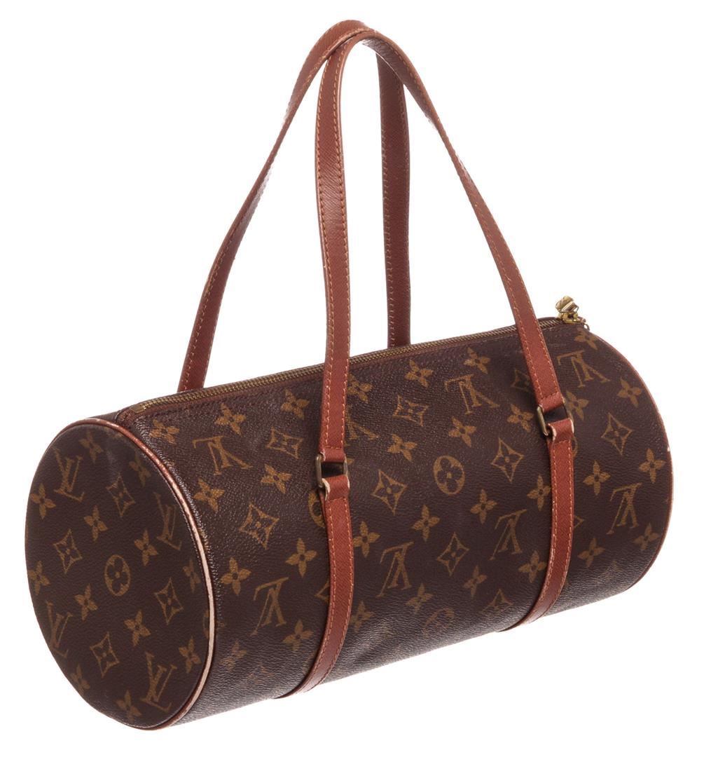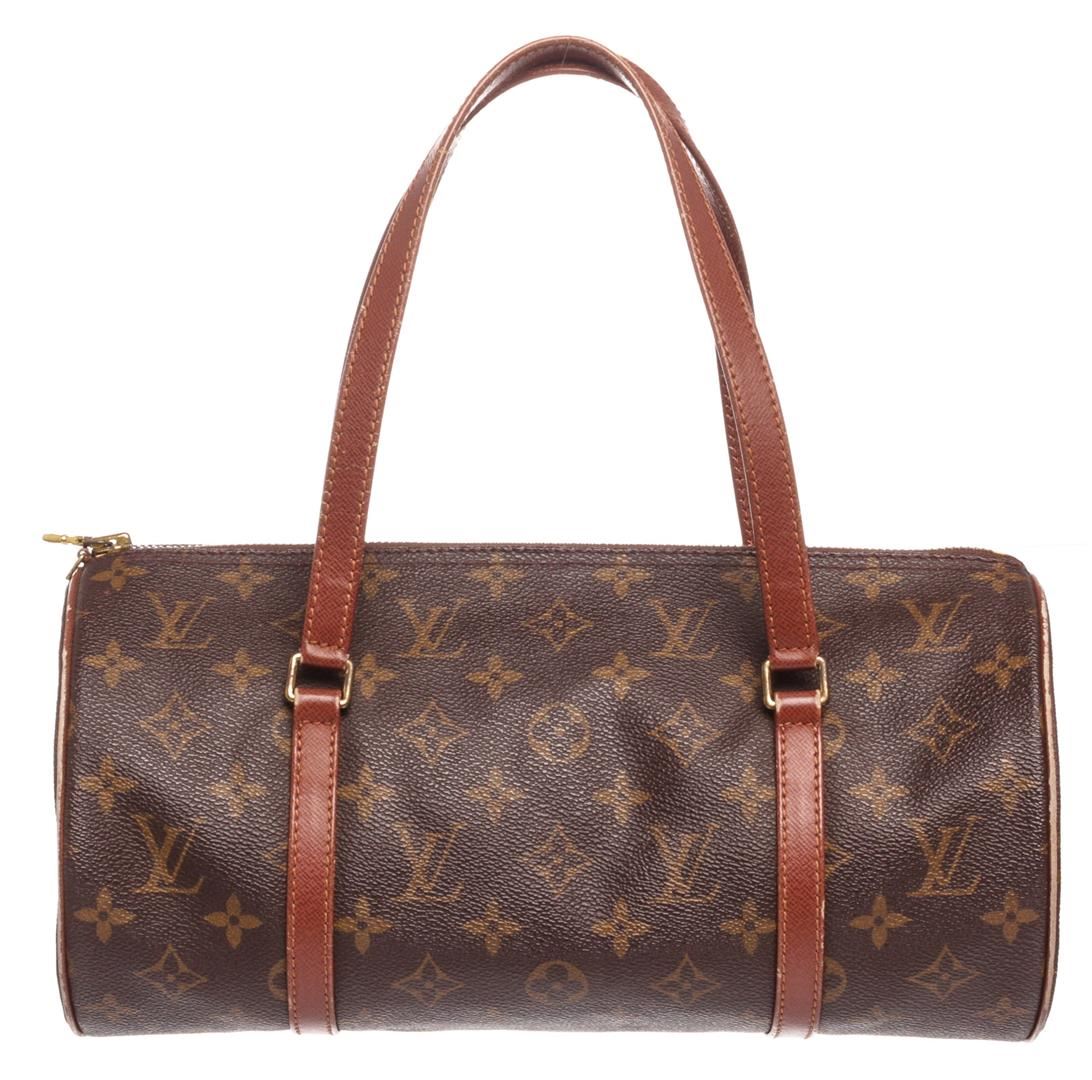 Brown and tan monogram coated canvas Louis Vuitton Vintage Papillon 26 with brass hardware, brown Taiga leather trim, dual flat handles, brown Taiga leather lining and zip closure at top.