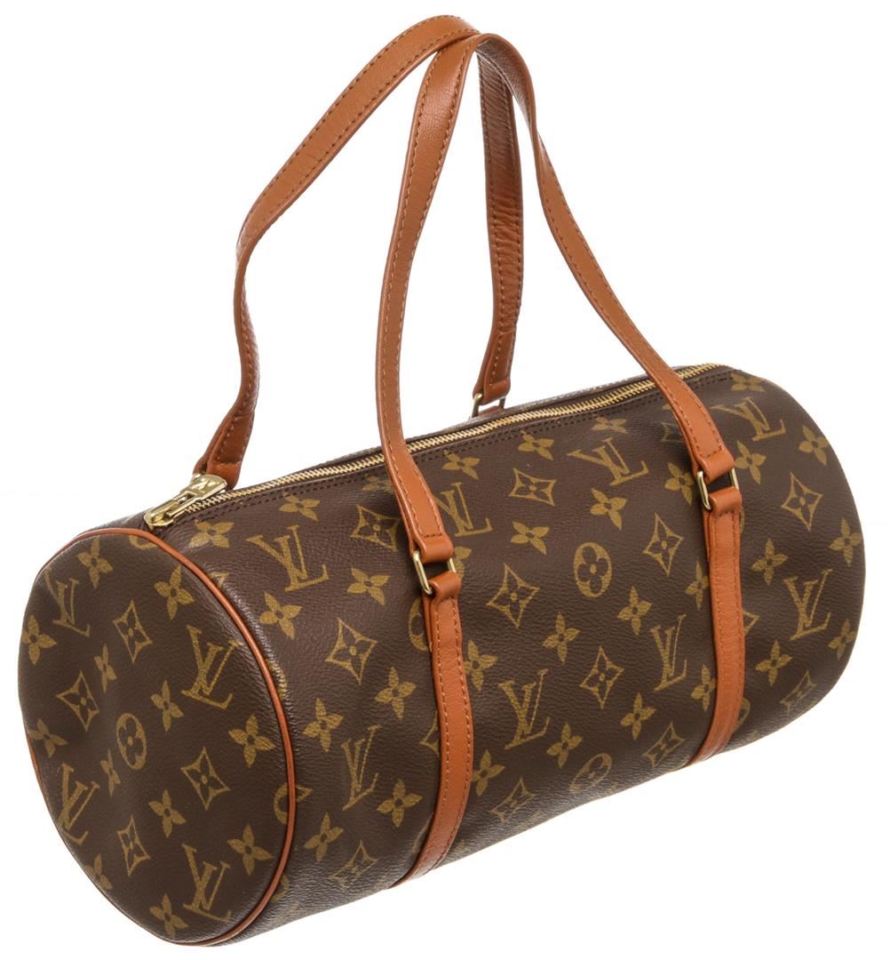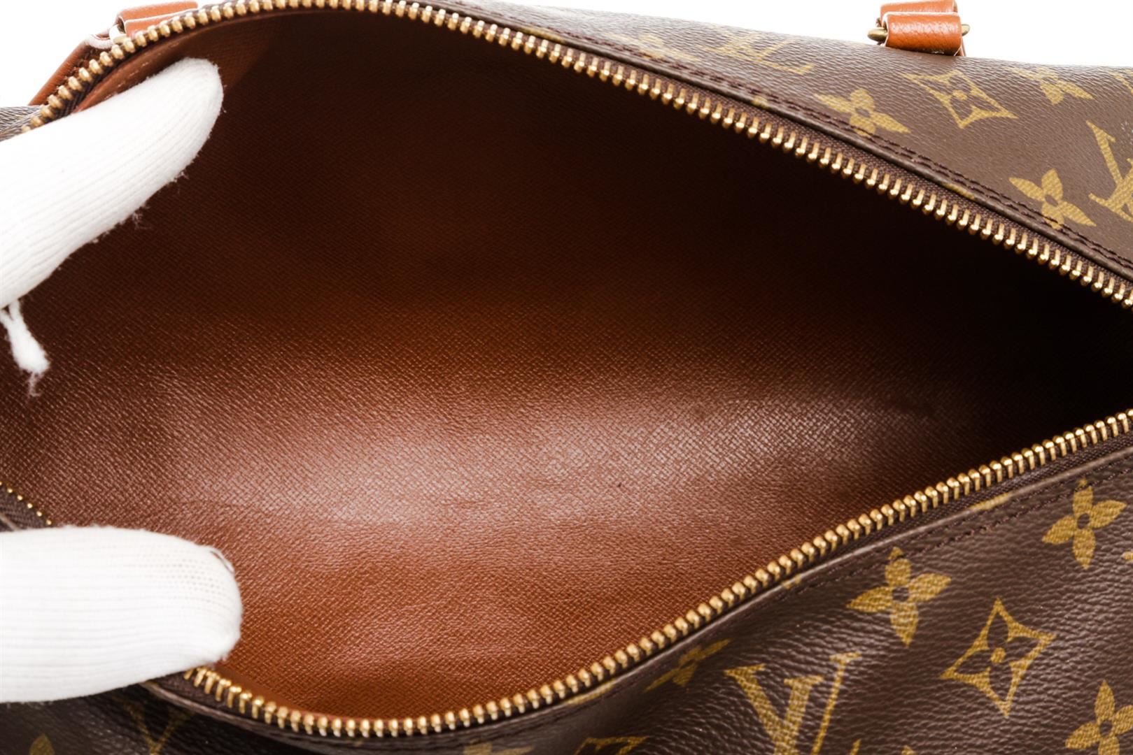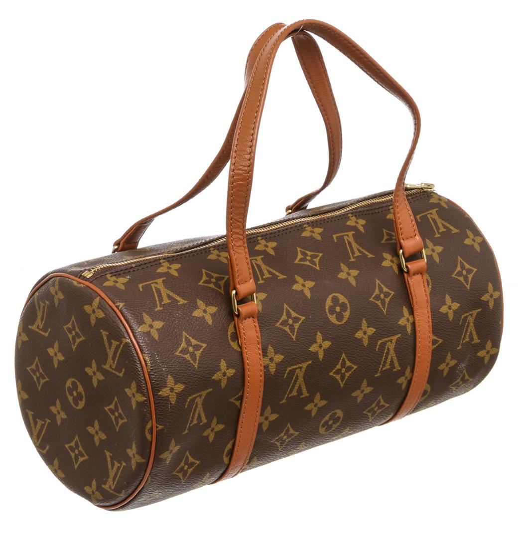 Brown and tan monogram coated canvas Louis Vuitton Vintage Papillon 26 with brass hardware, brown Taiga leather trim, dual flat handles, brown Taiga leather lining and zip closure at top. Authentic.