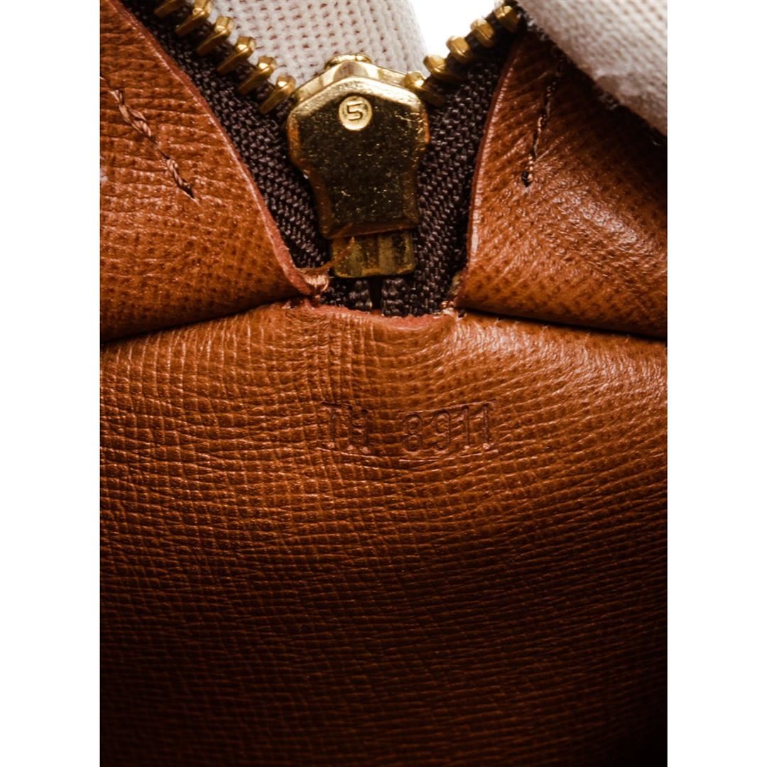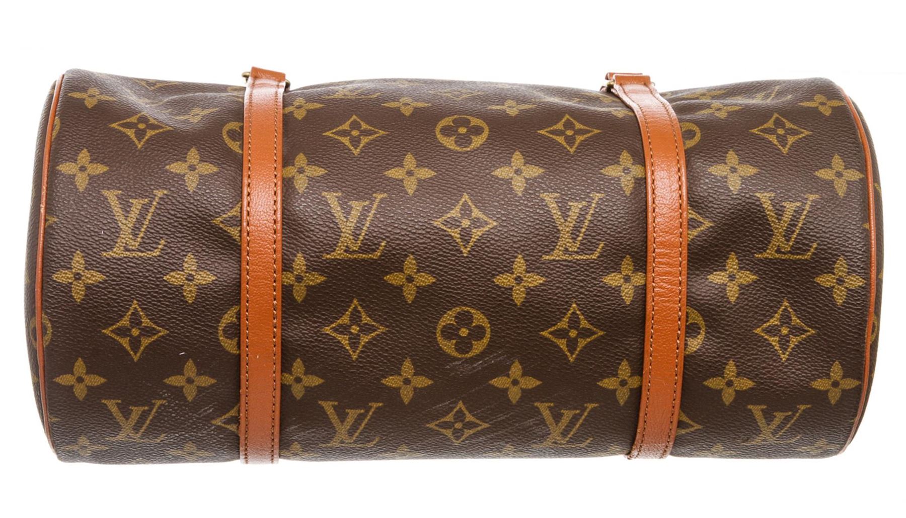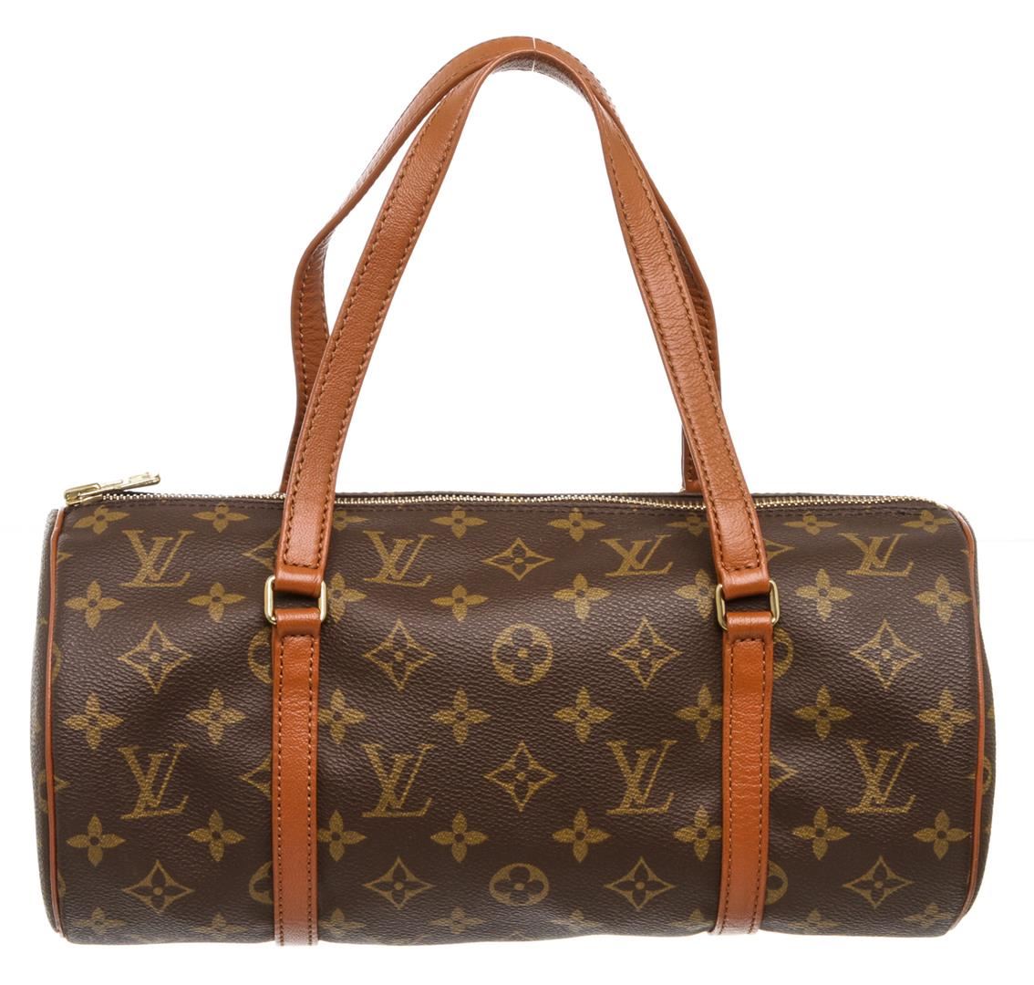 Brown and tan monogram coated canvas Louis Vuitton Vintage Papillon 26 with brass hardware, brown Taiga leather trim, dual flat handles, brown Taiga leather lining and zip closure at top. Authentic.