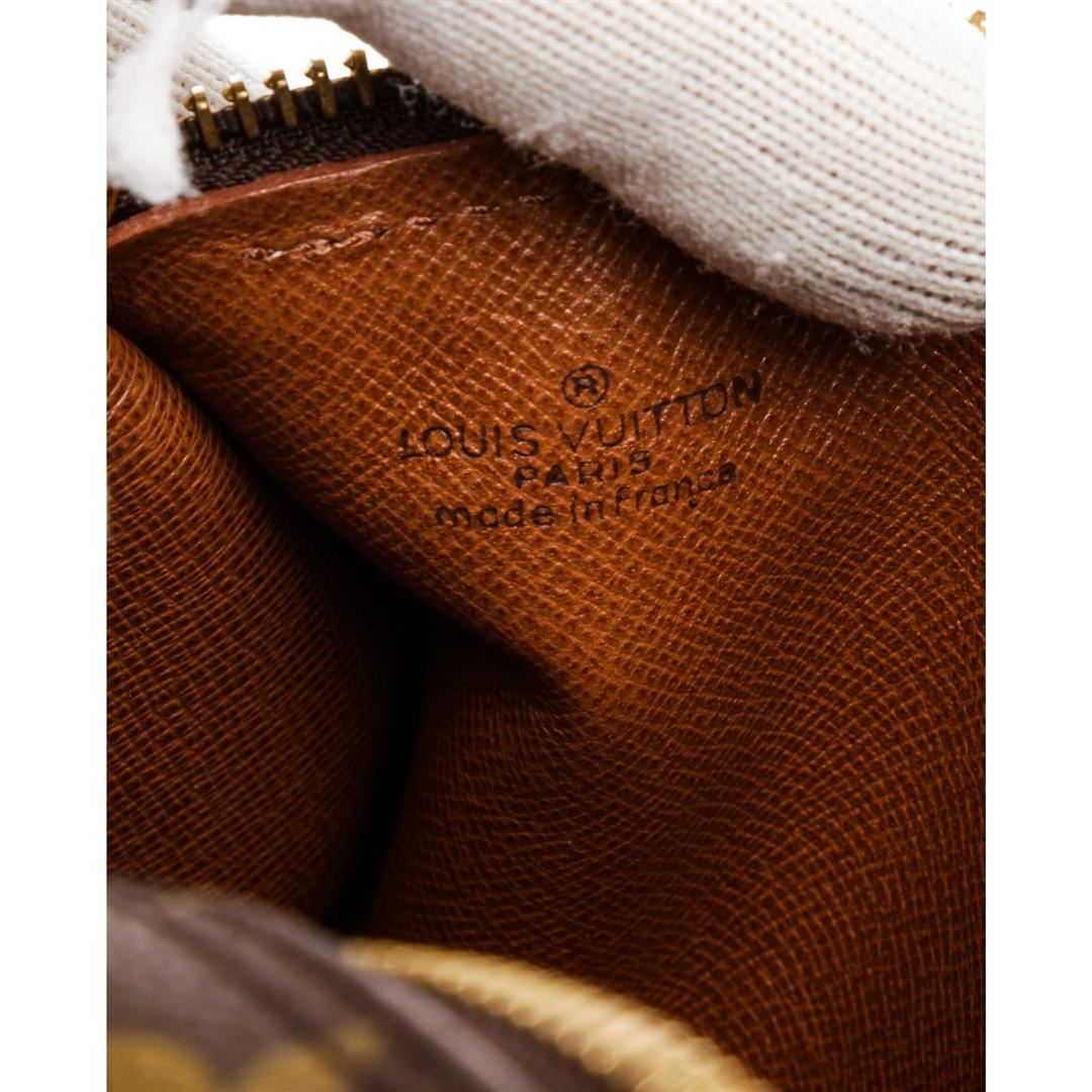 Brown and tan monogram coated canvas Louis Vuitton Vintage Papillon 26 with brass hardware, brown Taiga leather trim, dual flat handles, brown Taiga leather lining and zip closure at top. Authentic.