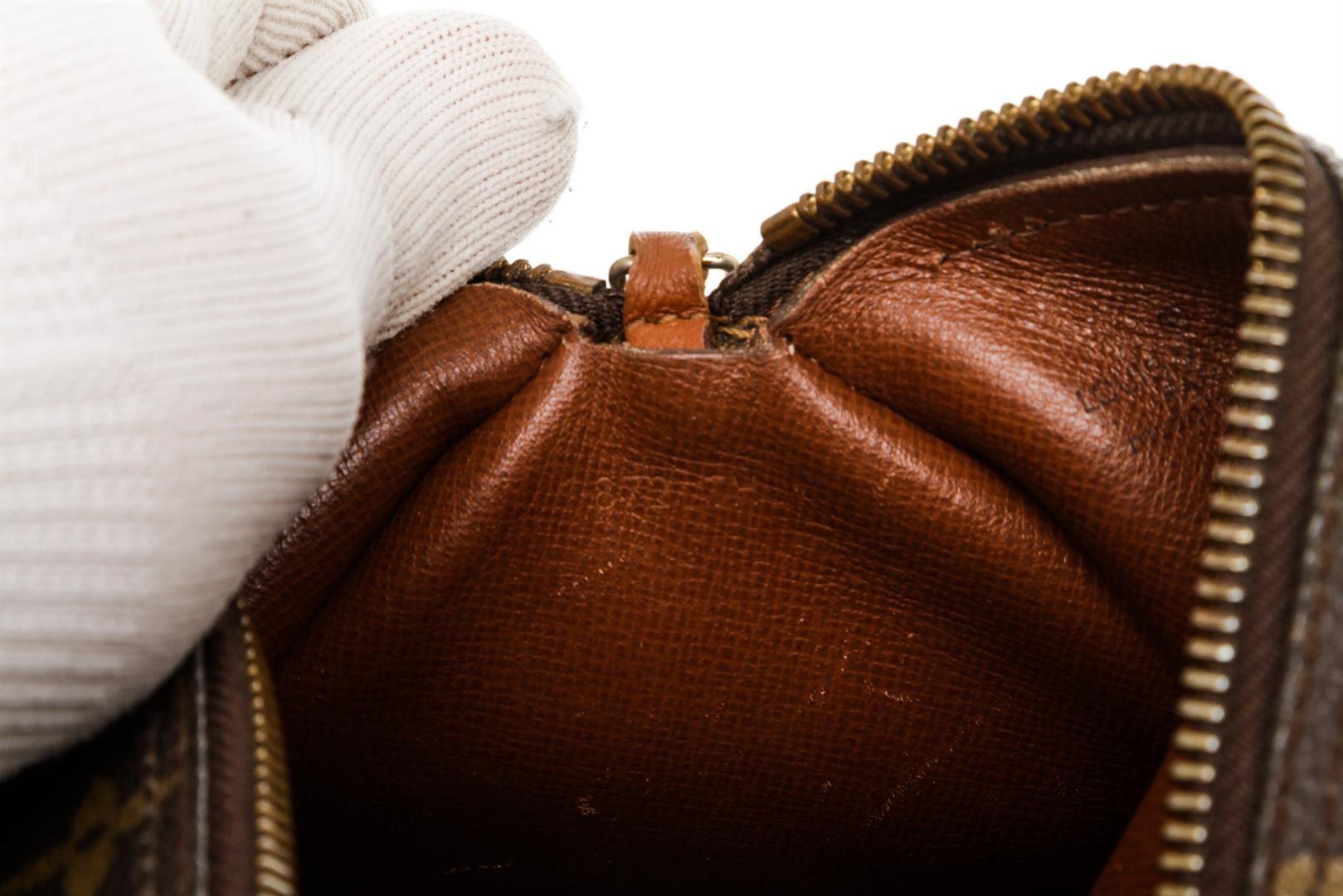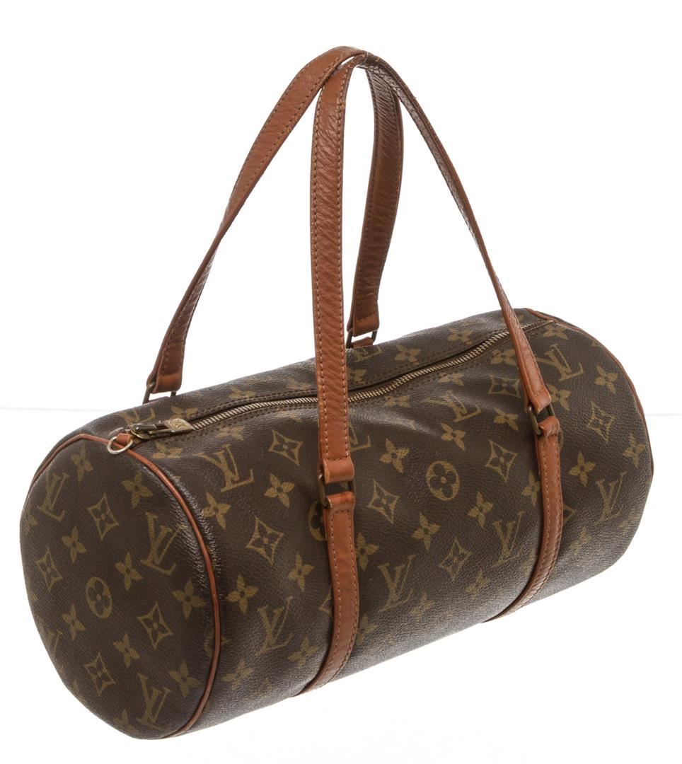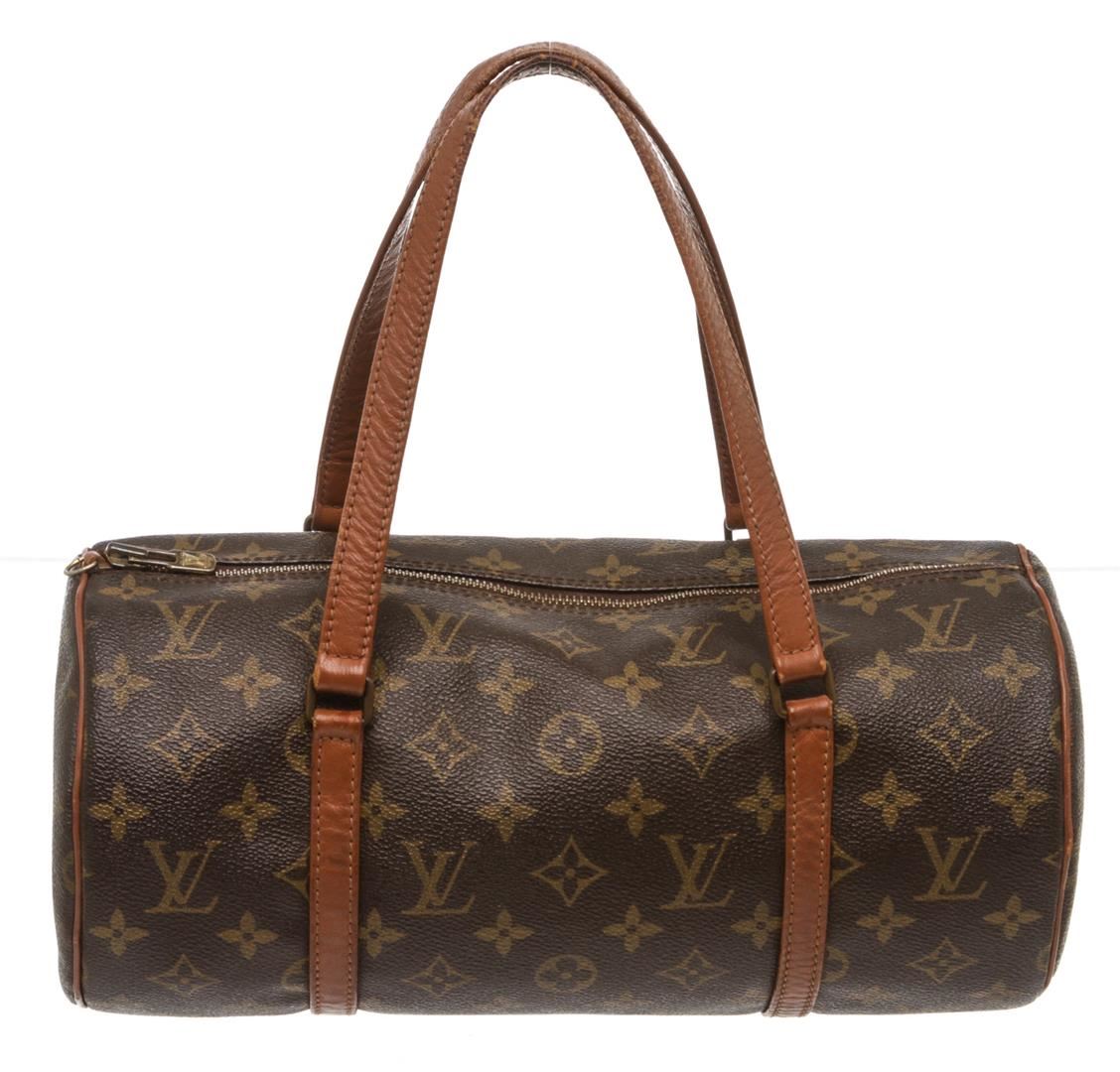 One Louis Vuitton Monogram Canvas Leather Vintage Papillon 30 cm Bag. Brown and tan monogram coated canvas Louis Vuitton Papillon with brass hardware, brown leather trim, dual flat handles, brown Taiga leather interior and zip closure at top. Includes detachable pouch with zip closure and dust bag.