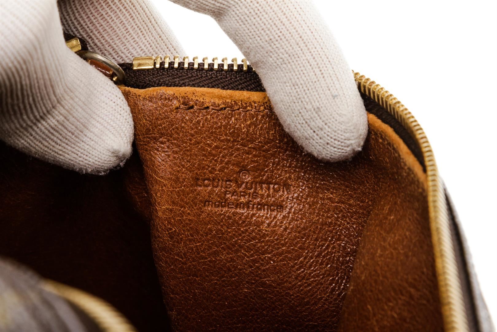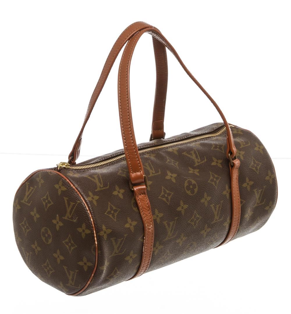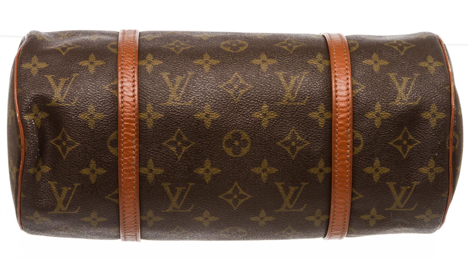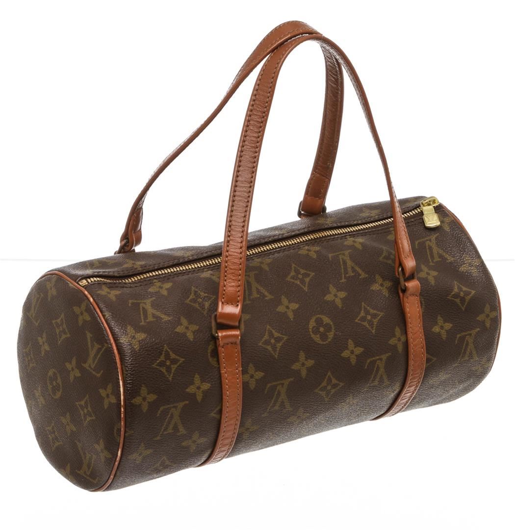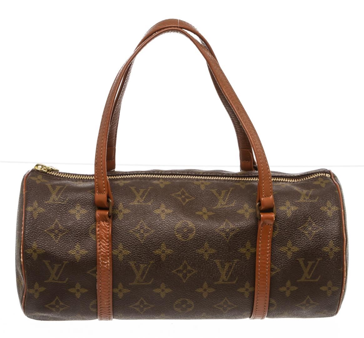 One Louis Vuitton Monogram Canvas Leather Vintage Papillon 30 cm Bag. Brown and tan monogram coated canvas Louis Vuitton Papillon with brass hardware, brown leather trim, dual flat handles, brown Taiga leather interior and zip closure at top. Includes detachable pouch with zip closure and dust bag.