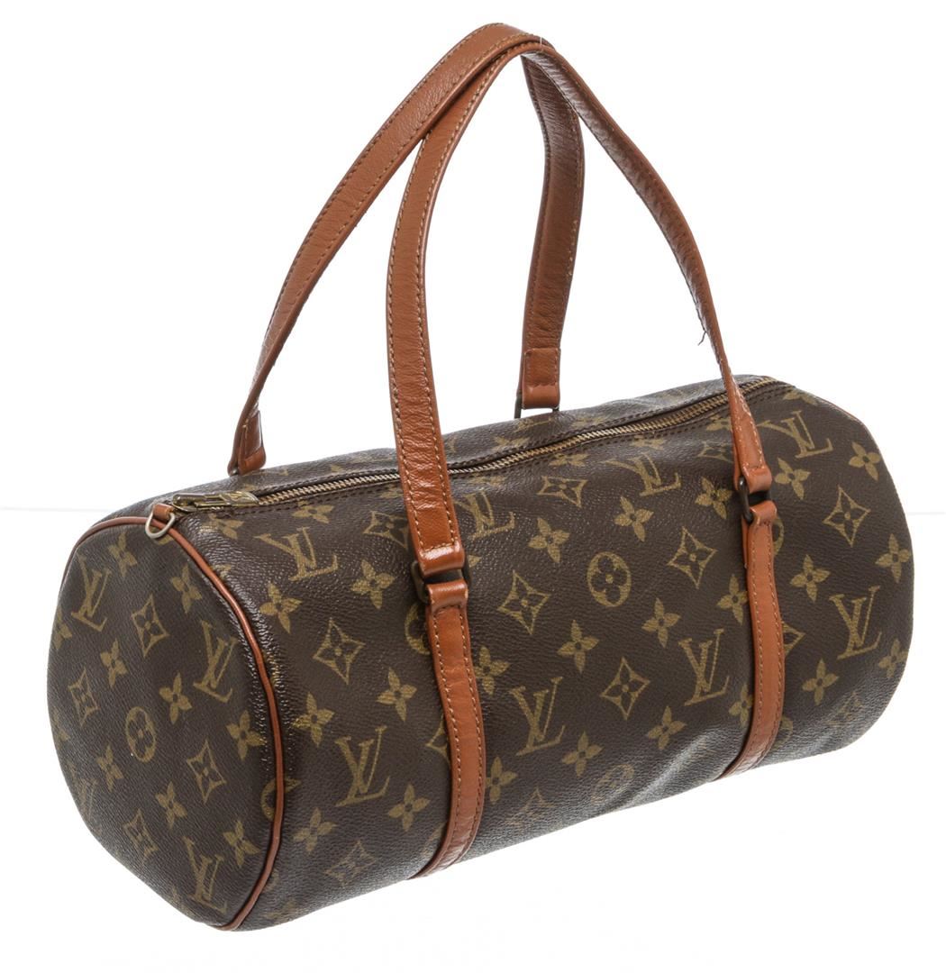 One Louis Vuitton Monogram Canvas Leather Vintage Papilon 26 cm Shoulder Bag. Brown and tan monogram coated canvas Louis Vuitton Papillon with brass hardware, dual flat top handles, brown leather trim throughout, brown leather lining and zip closure at top.