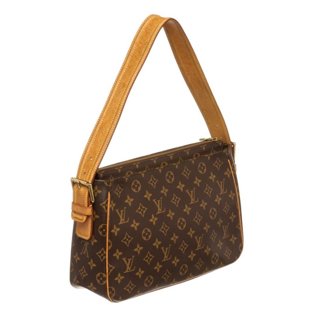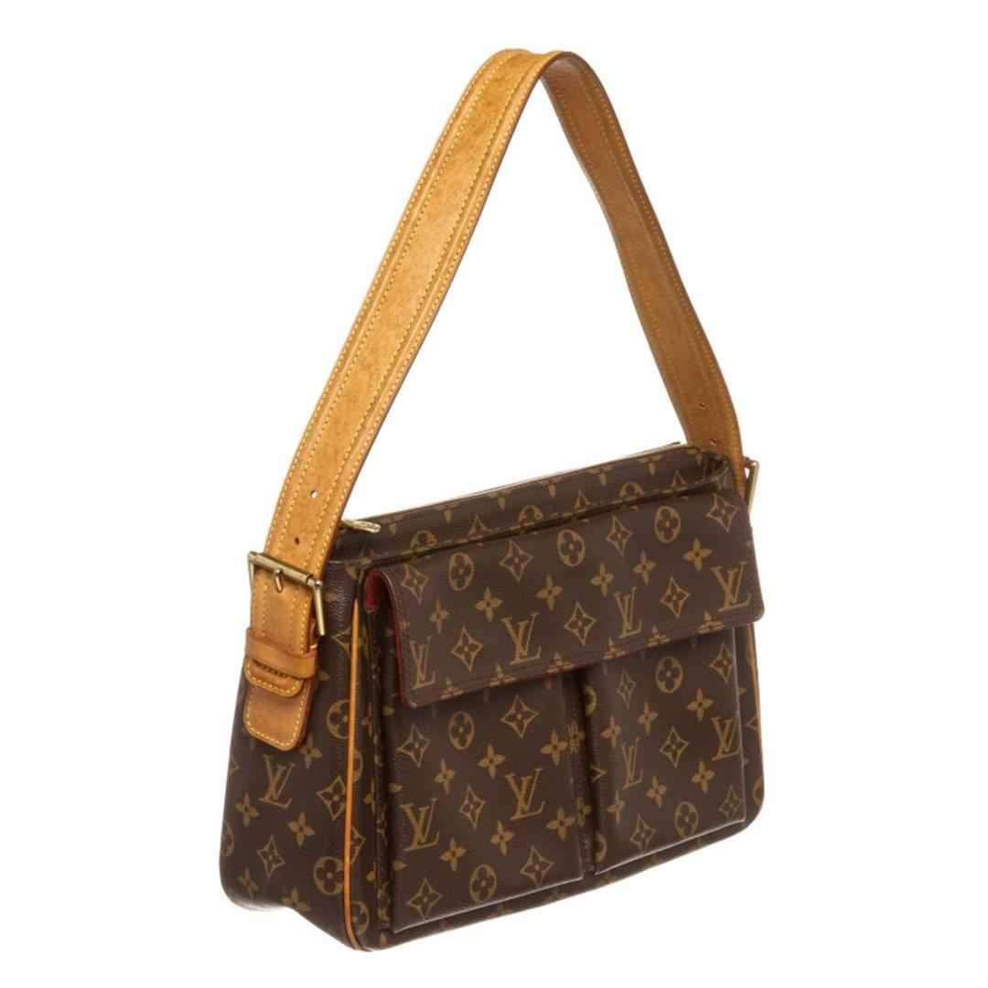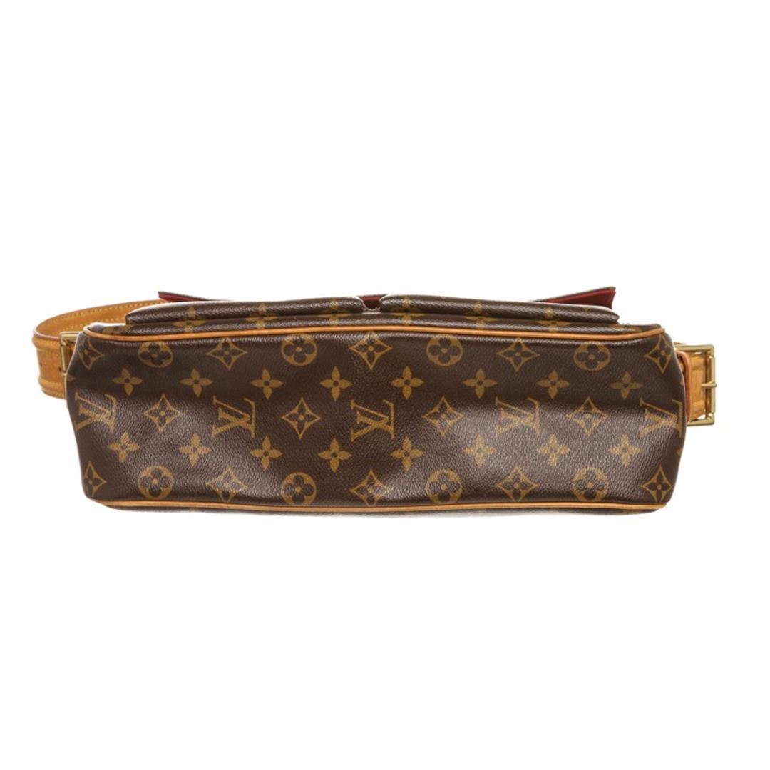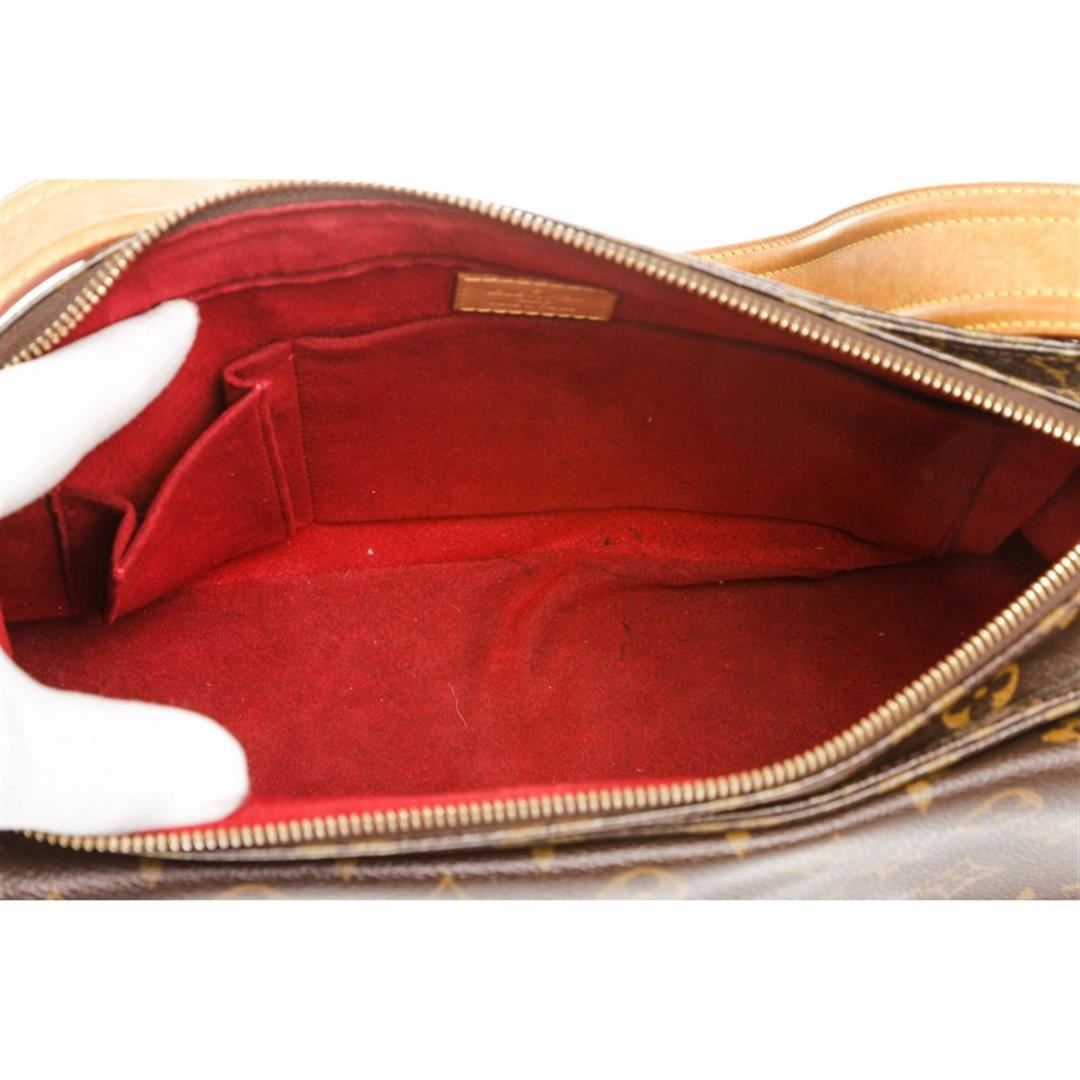 Brown and tan monogram coated canvas Louis Vuitton Viva Cite GM with brass hardware, tan vachetta leather trim, flat shoulder strap, dual exterior pockets with snap closures, crimson Alcantara lining, dualit pockets at interior walls and zip closure at top.