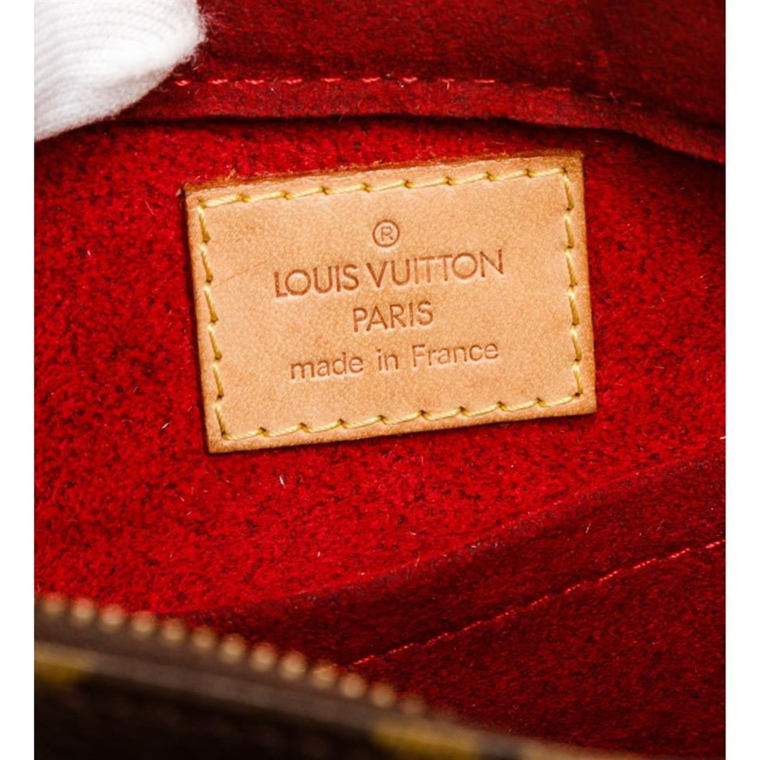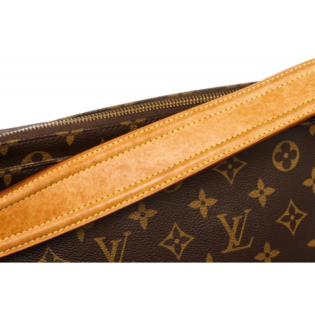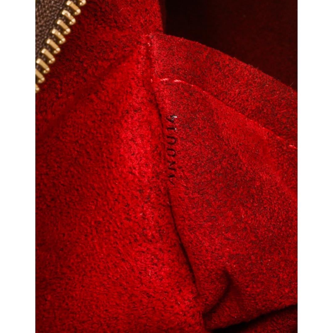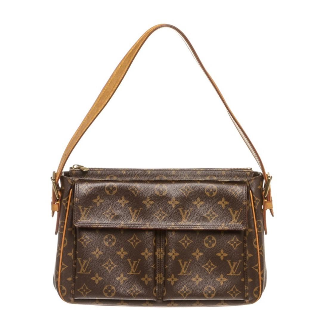 Brown and tan monogram coated canvas Louis Vuitton Viva Cite GM with brass hardware, tan vachetta leather trim, flat shoulder strap, dual exterior pockets with snap closures, crimson Alcantara lining, dualit pockets at interior walls and zip closure at top.