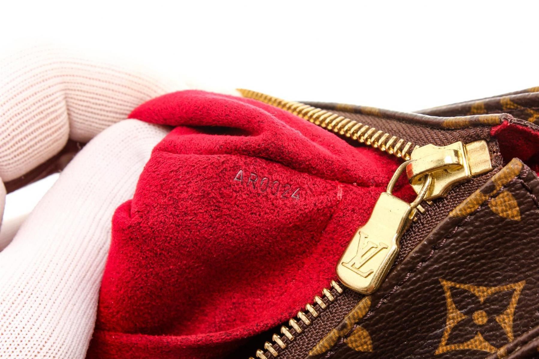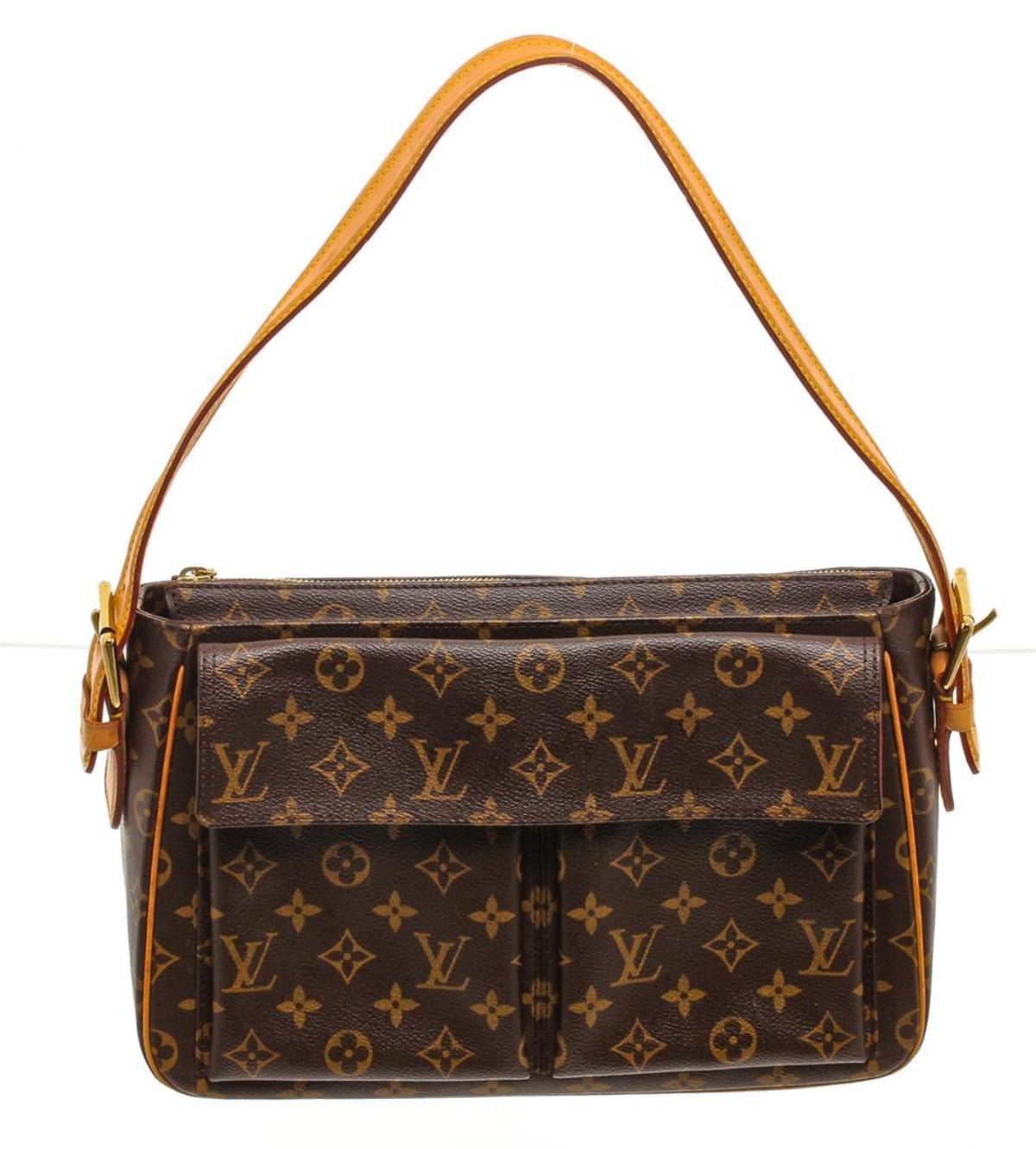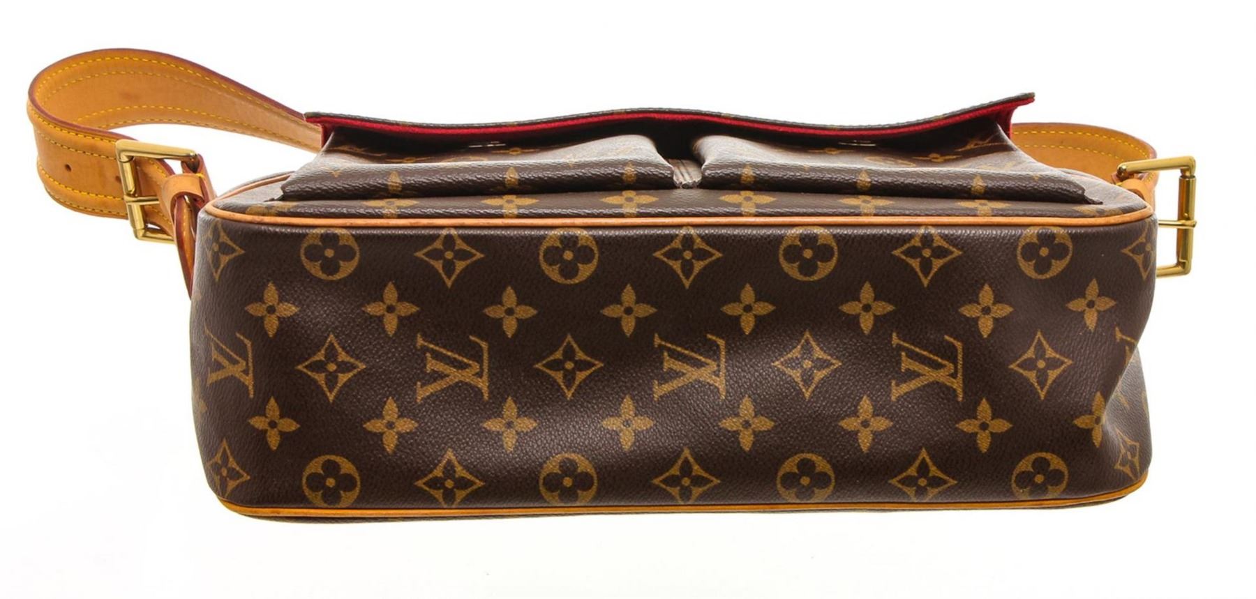 One Louis Vuitton Monogram Canvas Leather Viva Cite GM Bag. Brown and tan monogram coated canvas Louis Vuitton Viva Cite GM with brass hardware, tan vachetta leather trim, flat shoulder strap, dual exterior pockets with snap closures, crimson Alcantara lining, dual slit pockets at interior walls and zip closure at top.