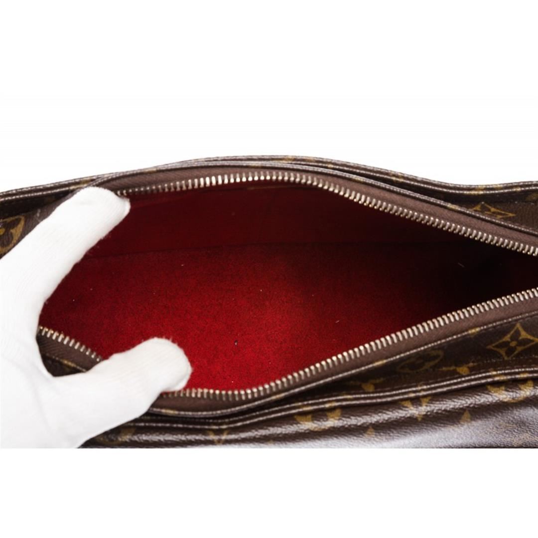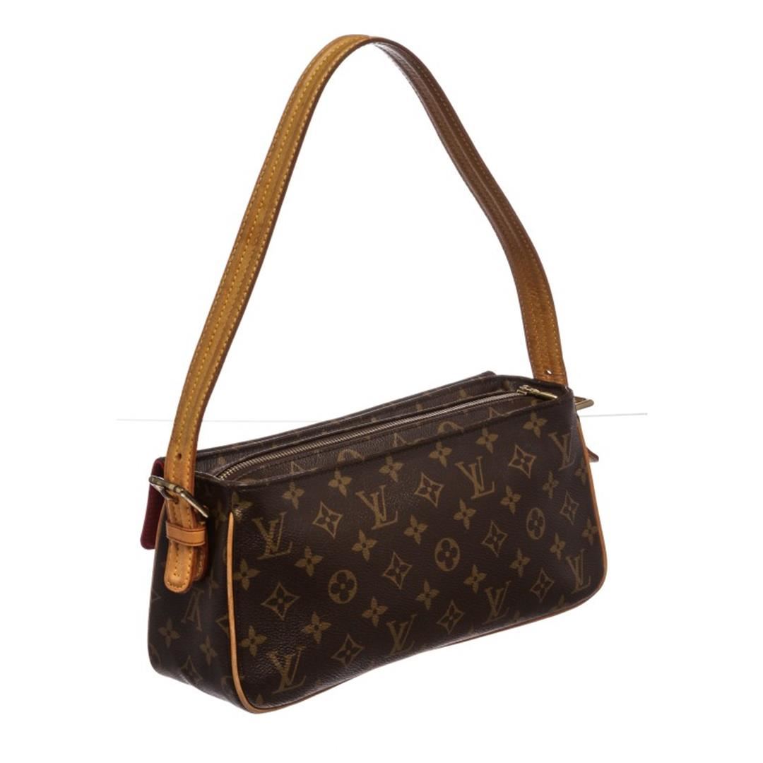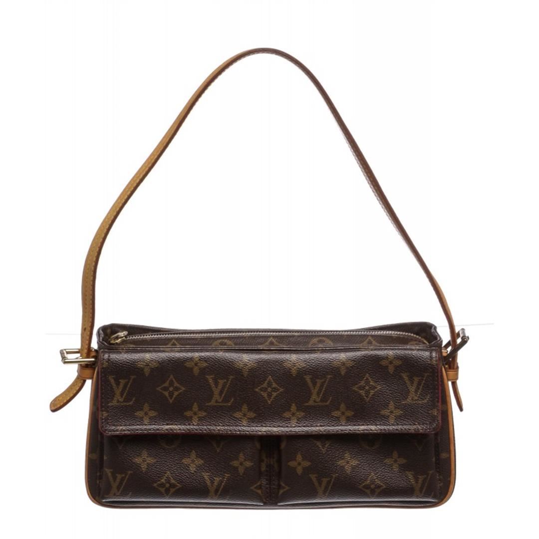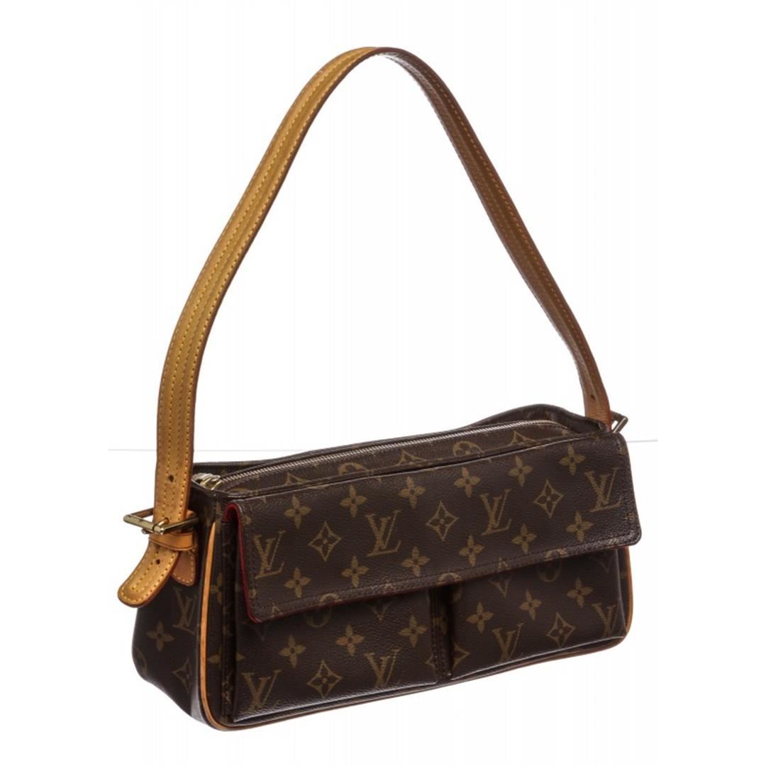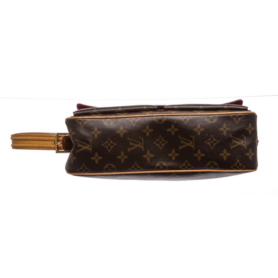 Brown and tan monogram coated canvas Louis Vuitton Viva Cite MM with brass hardware, tan vachetta leather accents, flat shoulder strap, dual exterior pockets at front with snap closures, crimson Alcantara lining, dual open pockets at interior walls and zip closure at top. Item is Pre-Owned.