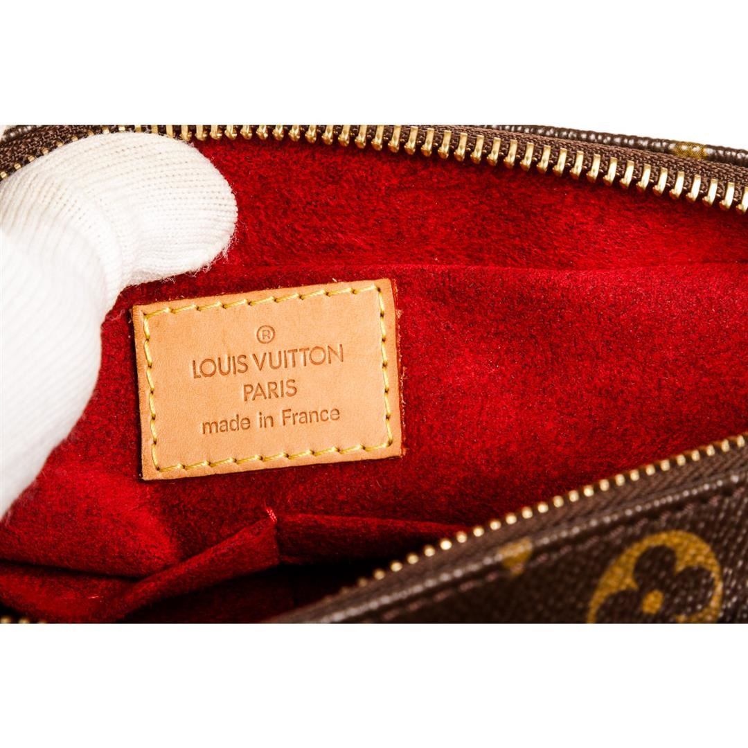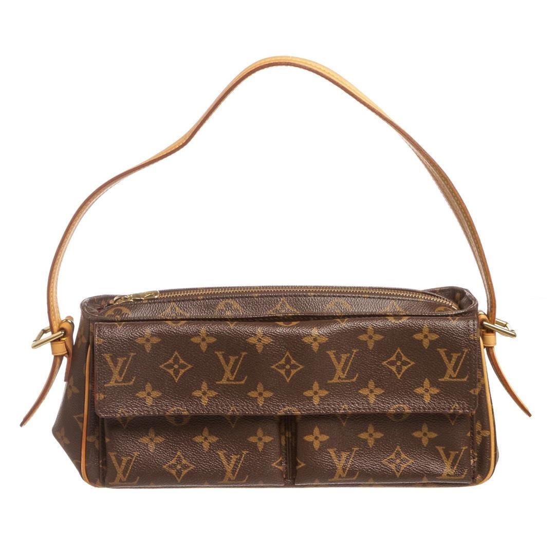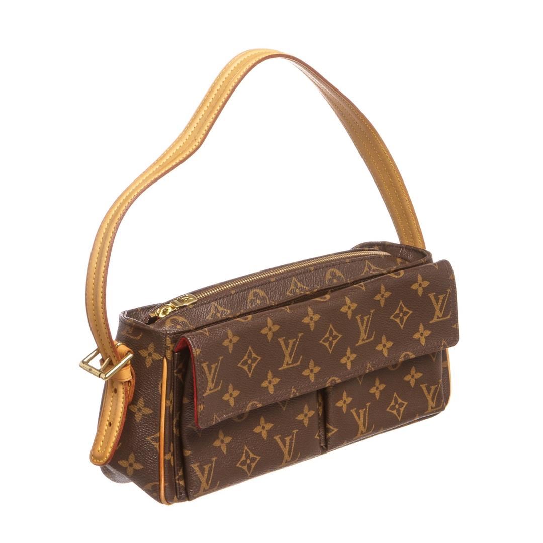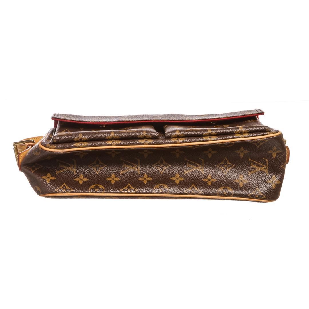 Brown and tan monogram coated canvas Louis Vuitton Viva Cite MM with brass hardware, tan vachetta leather accents, flat shoulder strap, dual exterior pockets at front with snap closures, crimson Alcantara lining, dual open pockets at interior walls and zi Item is pre-owned. Item Dimensions: 11.5"x3.25"x5"xBag Drop:8"/29.2cmx8.2cmx12.7cmxBag Drop:20.3cm.