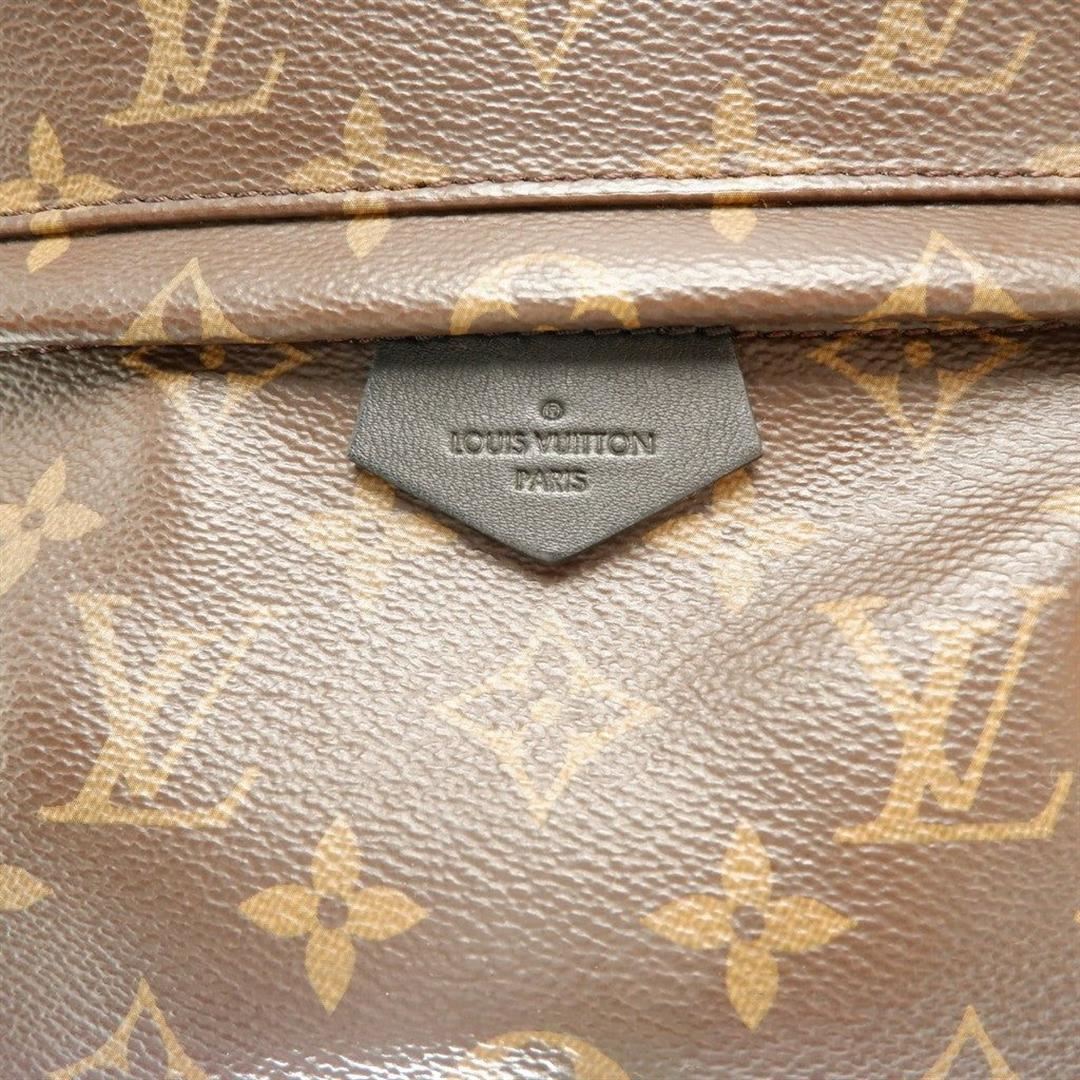 Brown and tan monogram coated canvas Louis Vuitton Palm Springs Mini backpack bag with leather trim, one front zip pocket, single zip closure, leather backpack straps and top handle, fine textile interior lining with one flat pocket, gold-tone hardware.