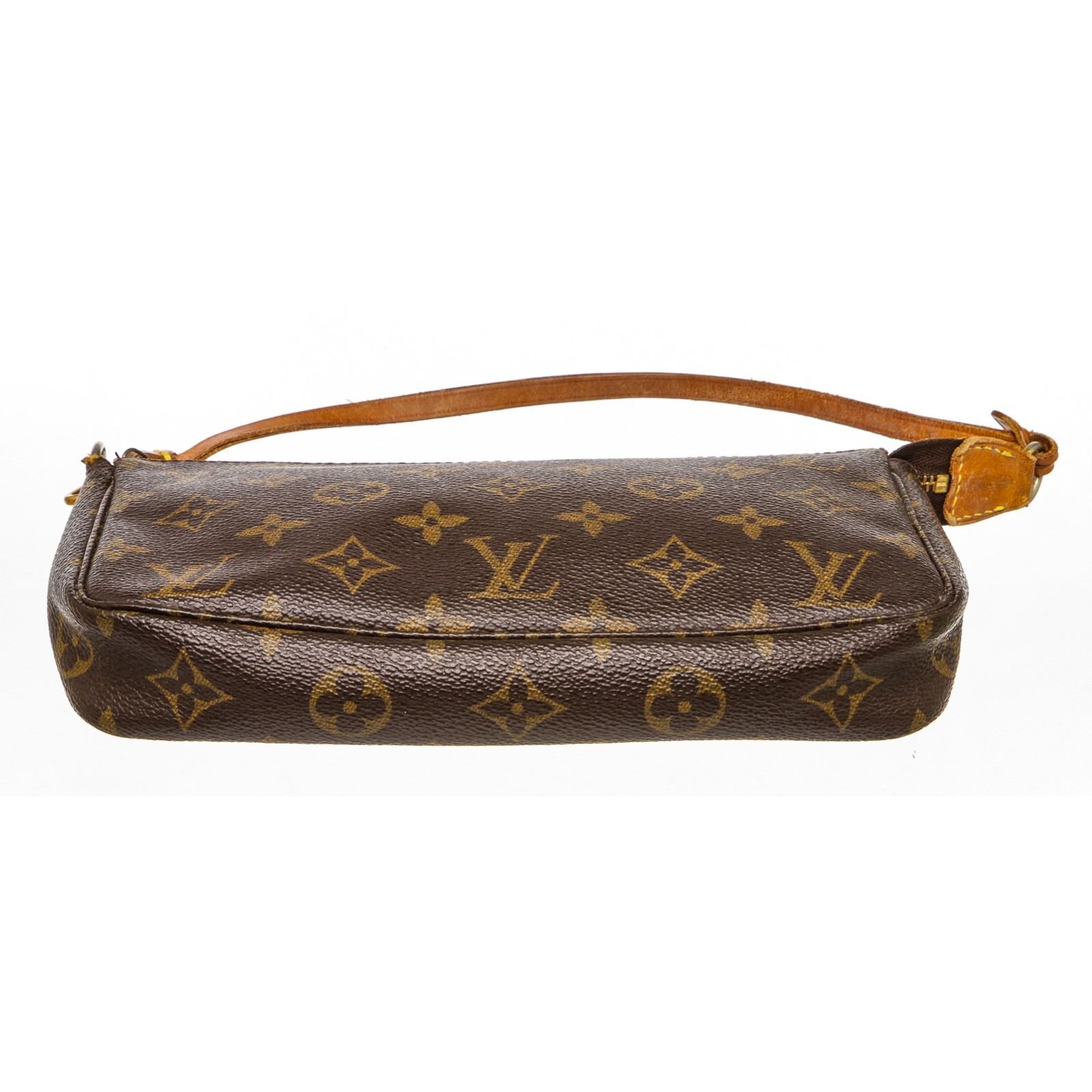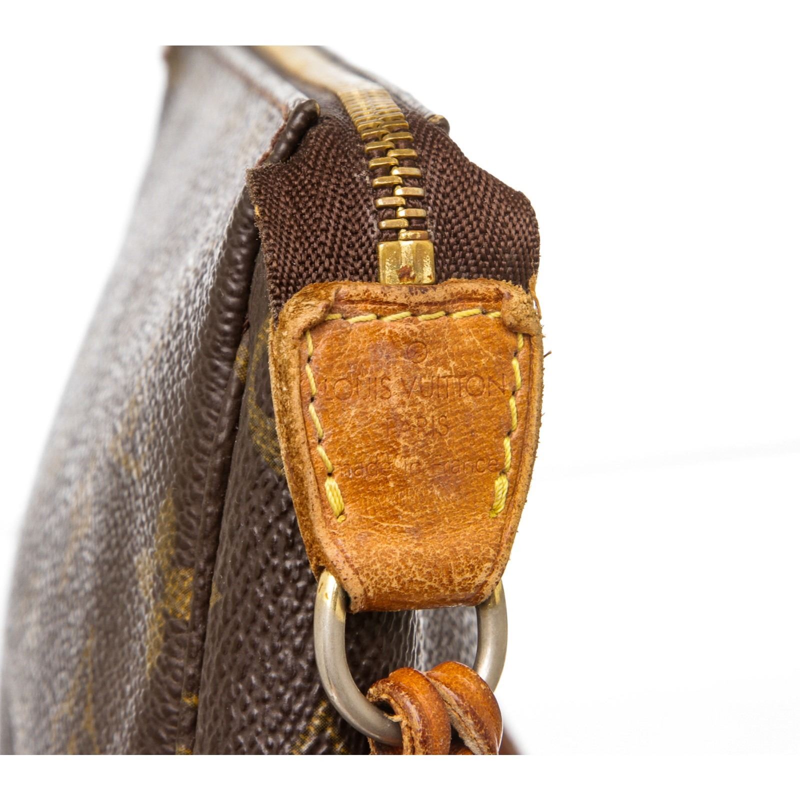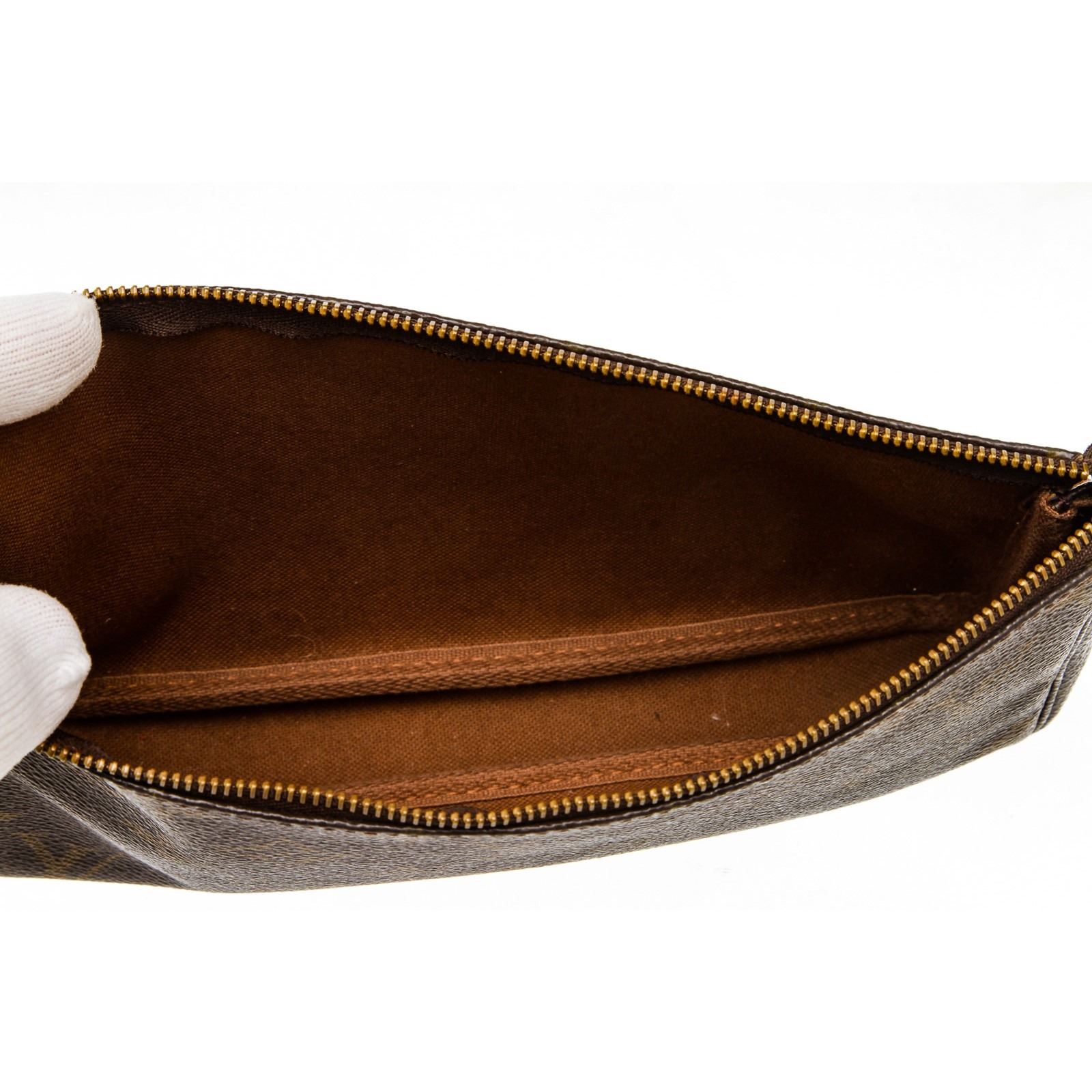 Brown and tan monogram coated canvas Louis Vuitton Pochette bag with brass hardware, tan vachetta leather trim, single flat top handle, brown canvas lining and zip closure at top.