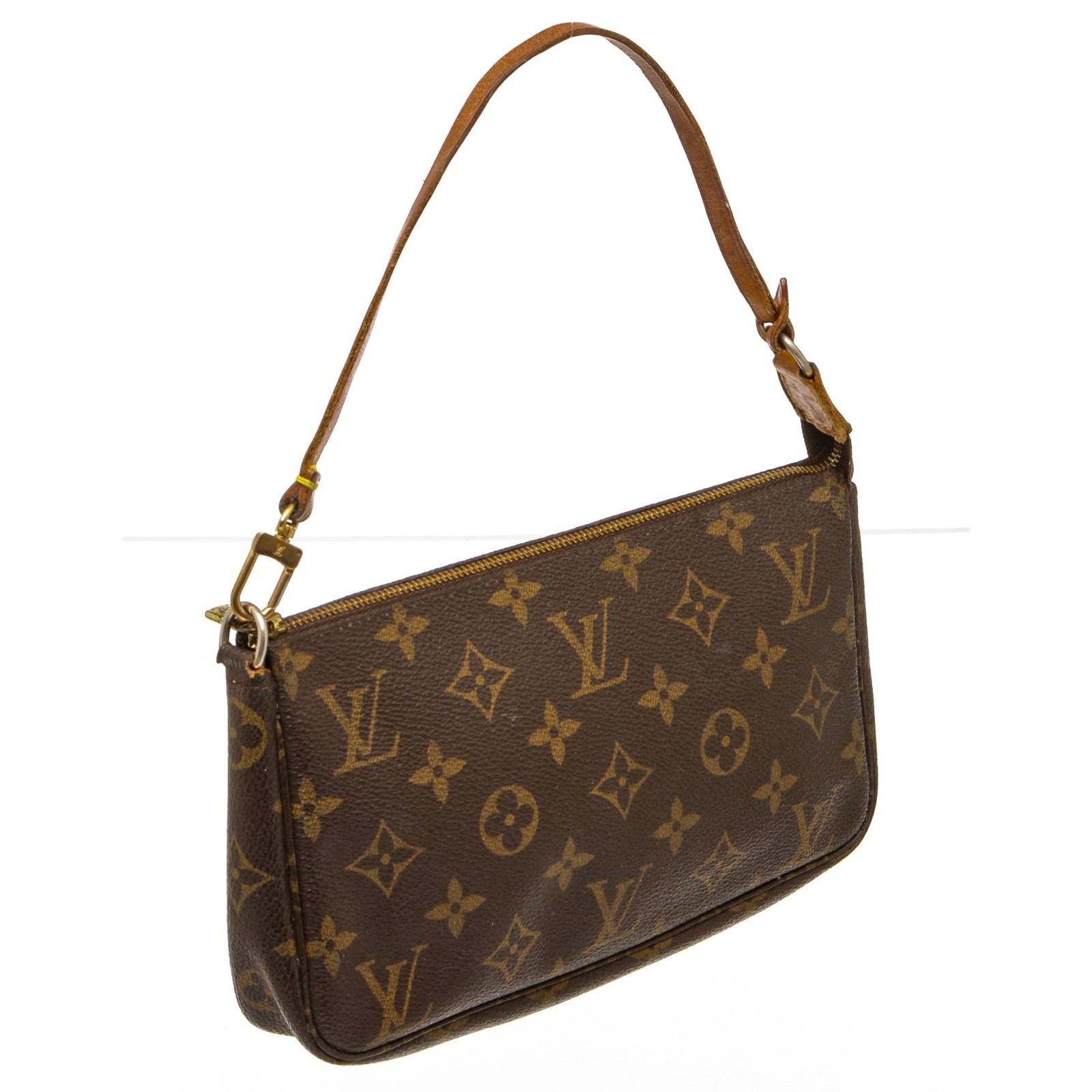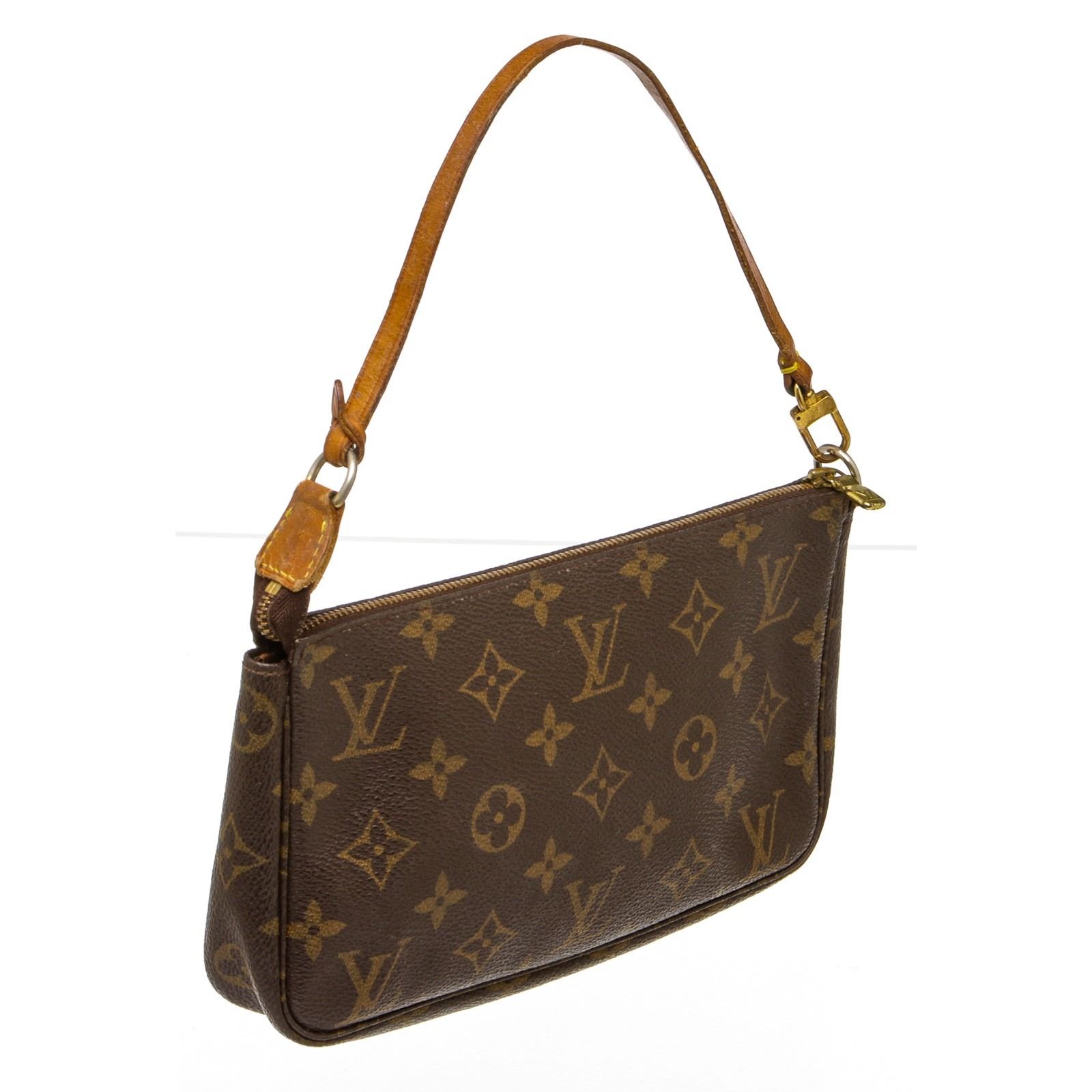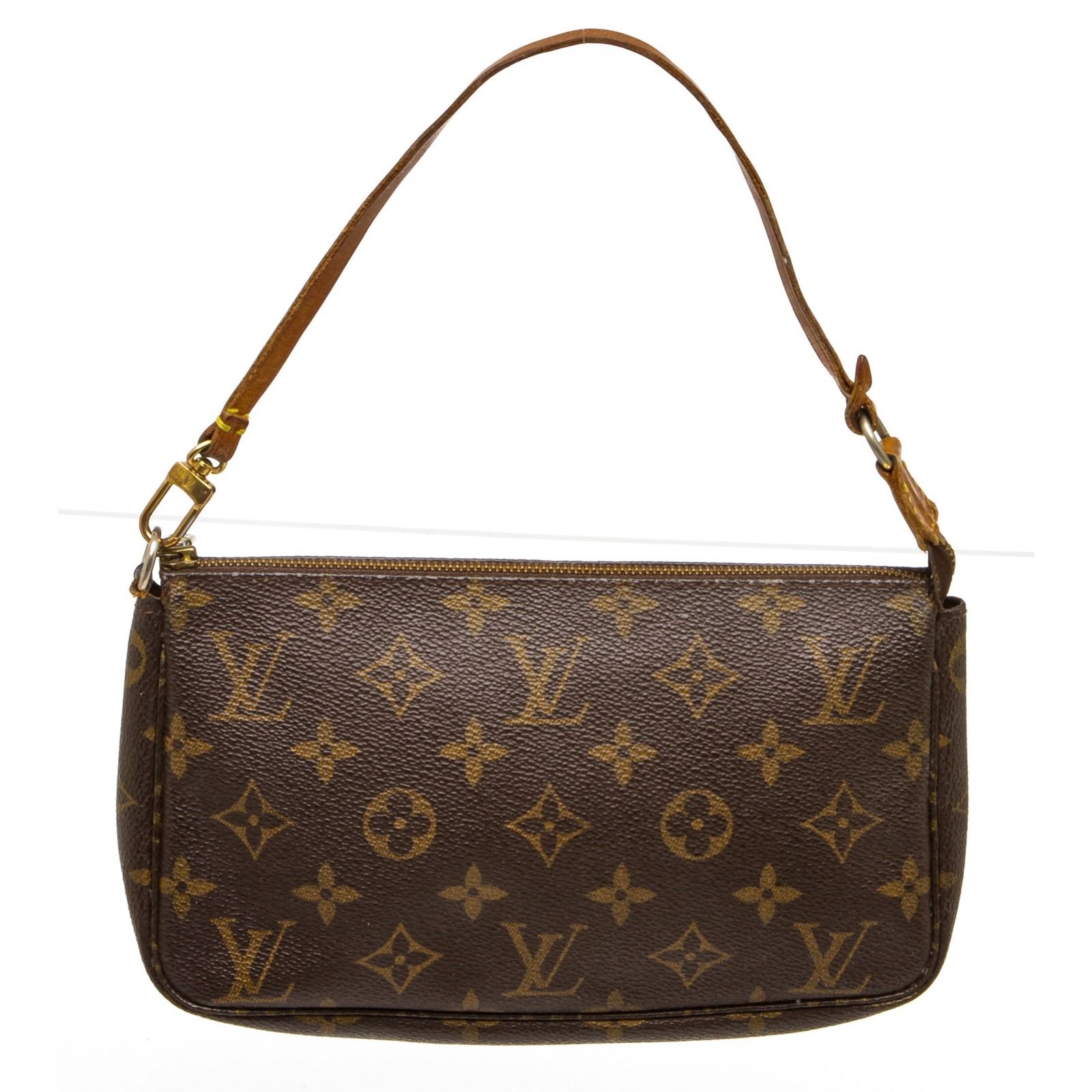 Brown and tan monogram coated canvas Louis Vuitton Pochette bag with brass hardware, tan vachetta leather trim, single flat top handle, brown canvas lining and zip closure at top.