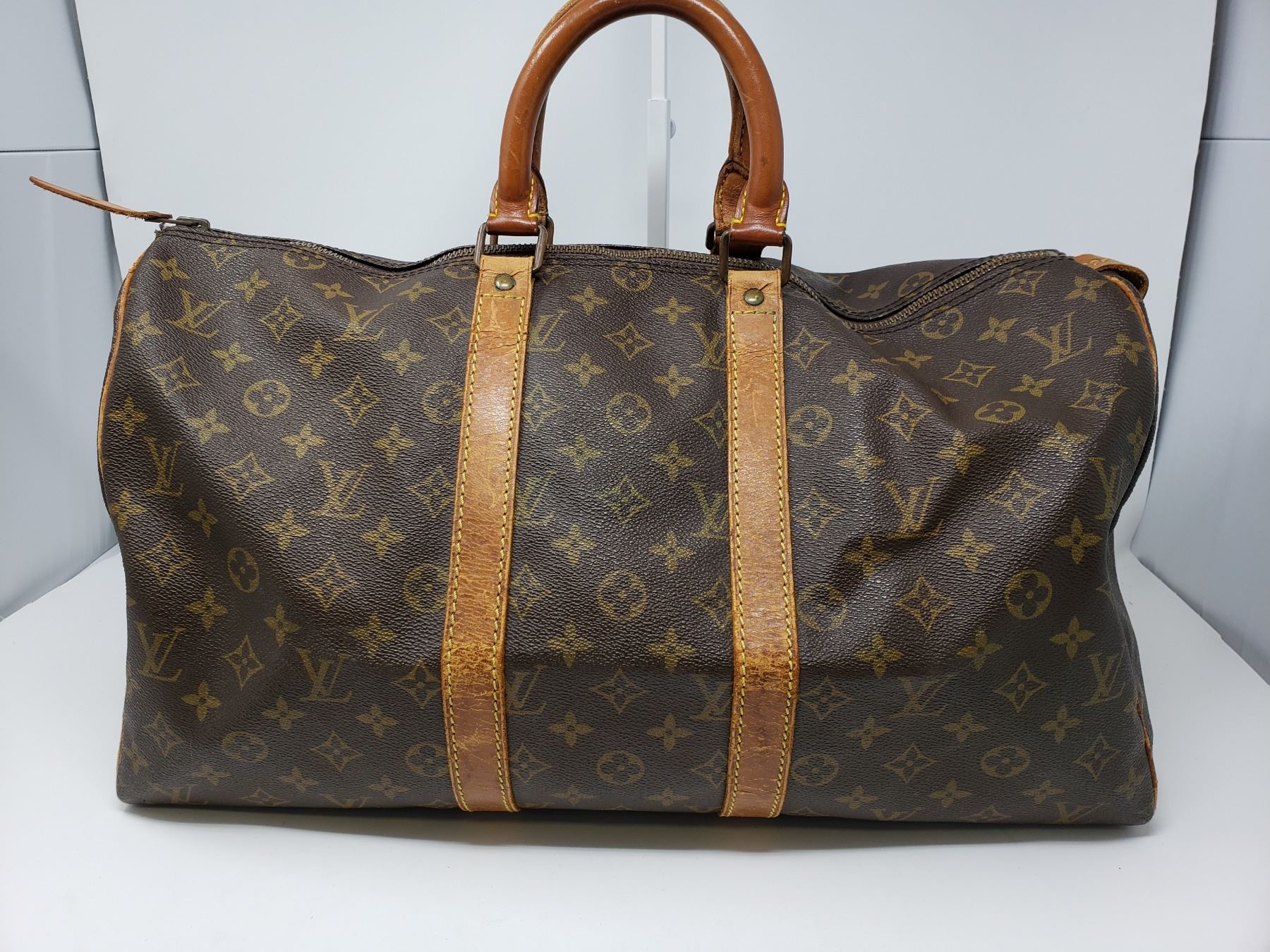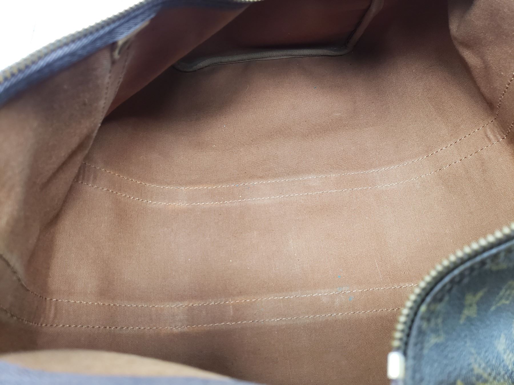 Crafted of signature Louis Vuitton monogram coated canvas. The bag features vachetta cowhide leather trim and rolled top handles with brass hardware. The top zipper opens to a spacious cocoa brown fabric interior with a hanging patch pocket.