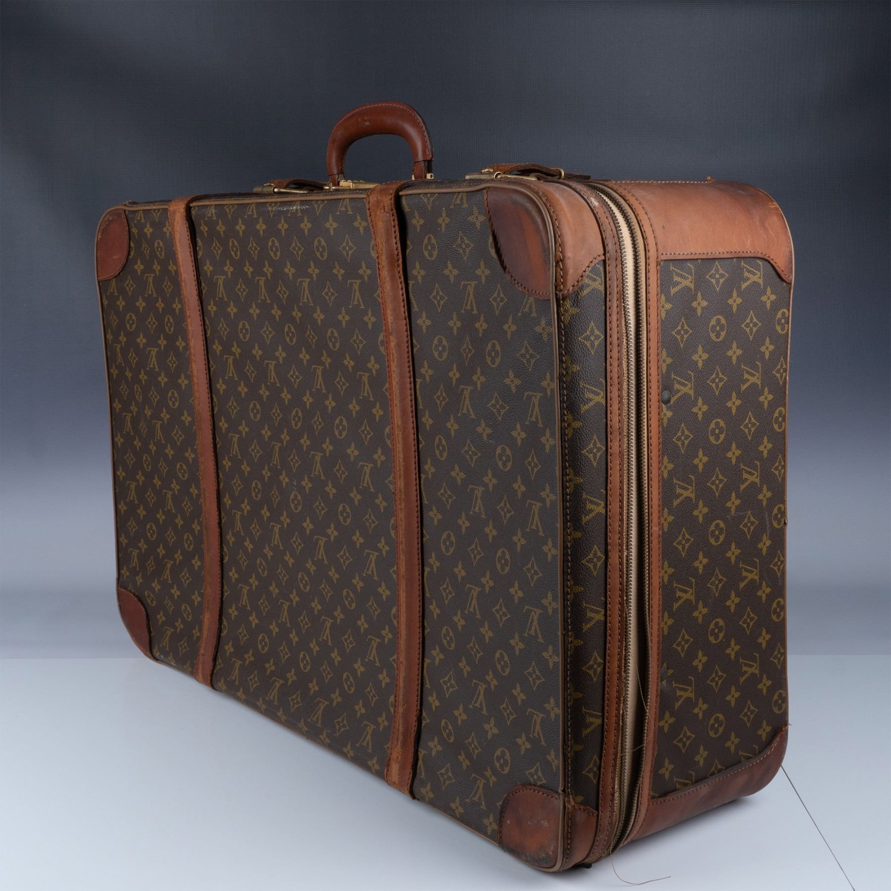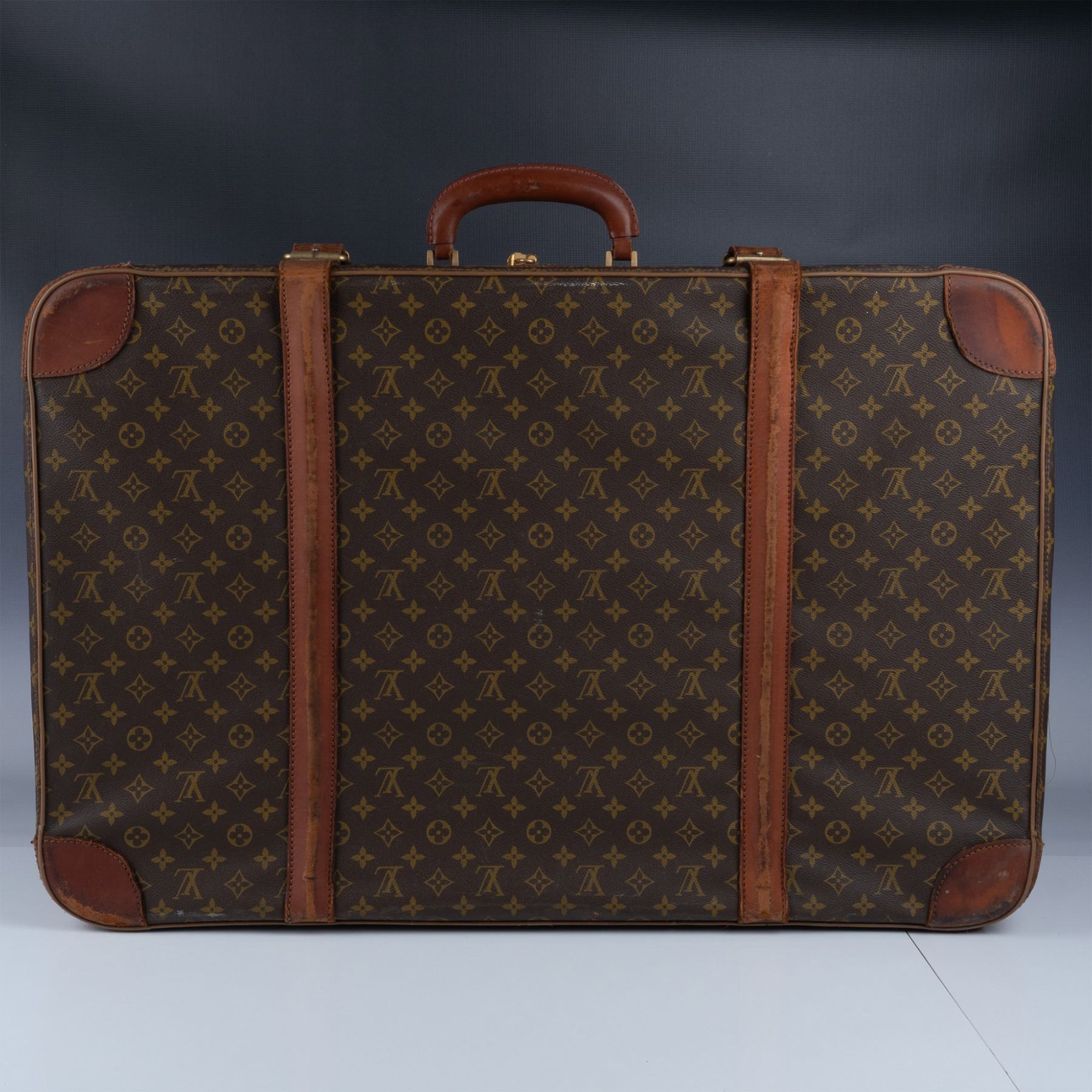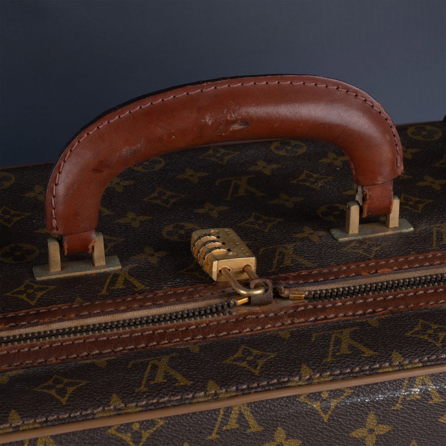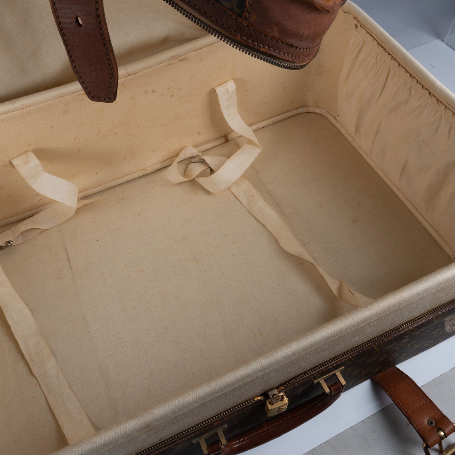 Vintage Louis Vuitton suitcase crafted from the iconic monogram canvas with natural leather trim and gold-tone hardware. This piece features a sturdy handle, buckle straps, and a zip closure. The interior is lined in beige fabric with tie-down straps and shows signs of use and age. External wear includes scuffs and marks consistent with travel and age, adding to its vintage appeal.