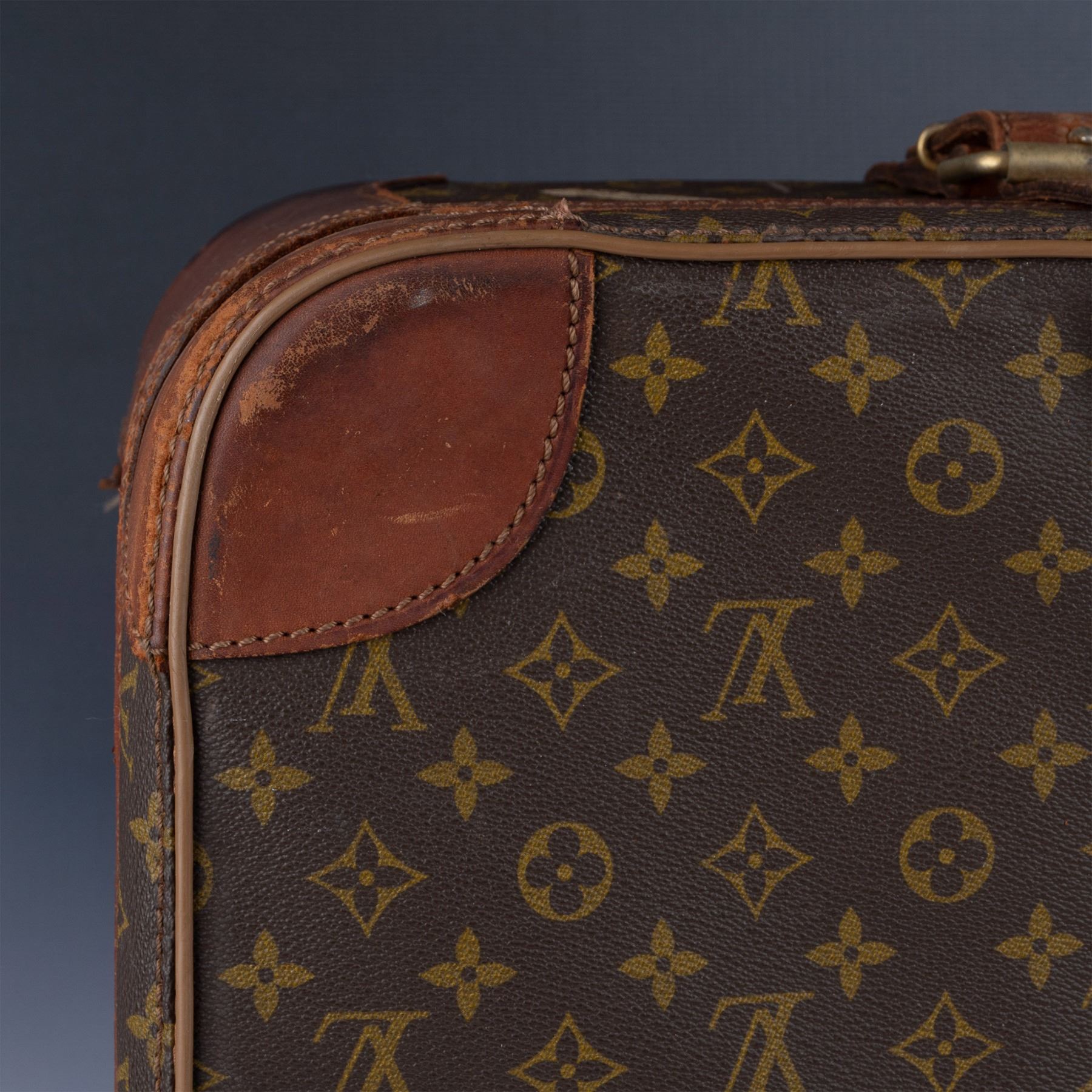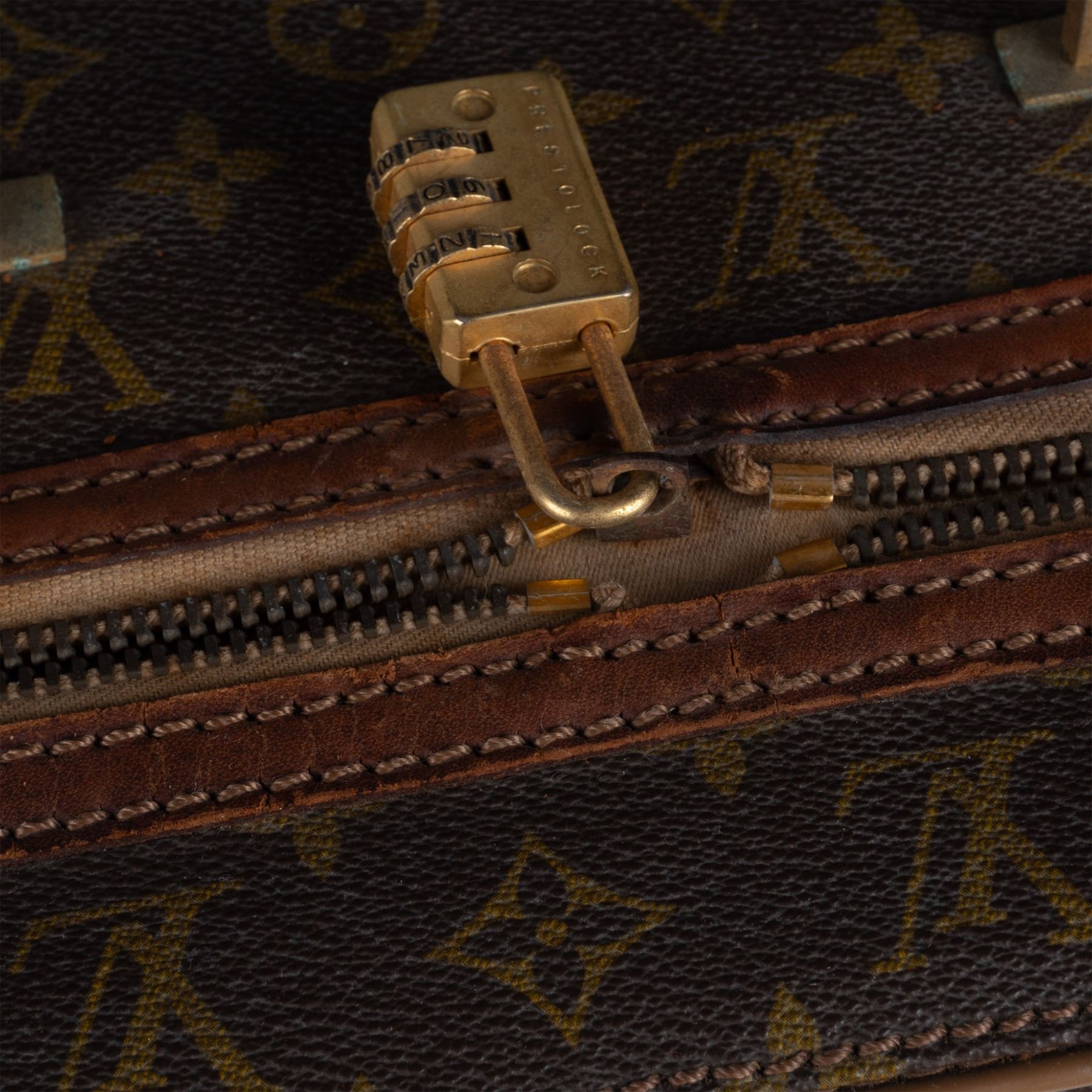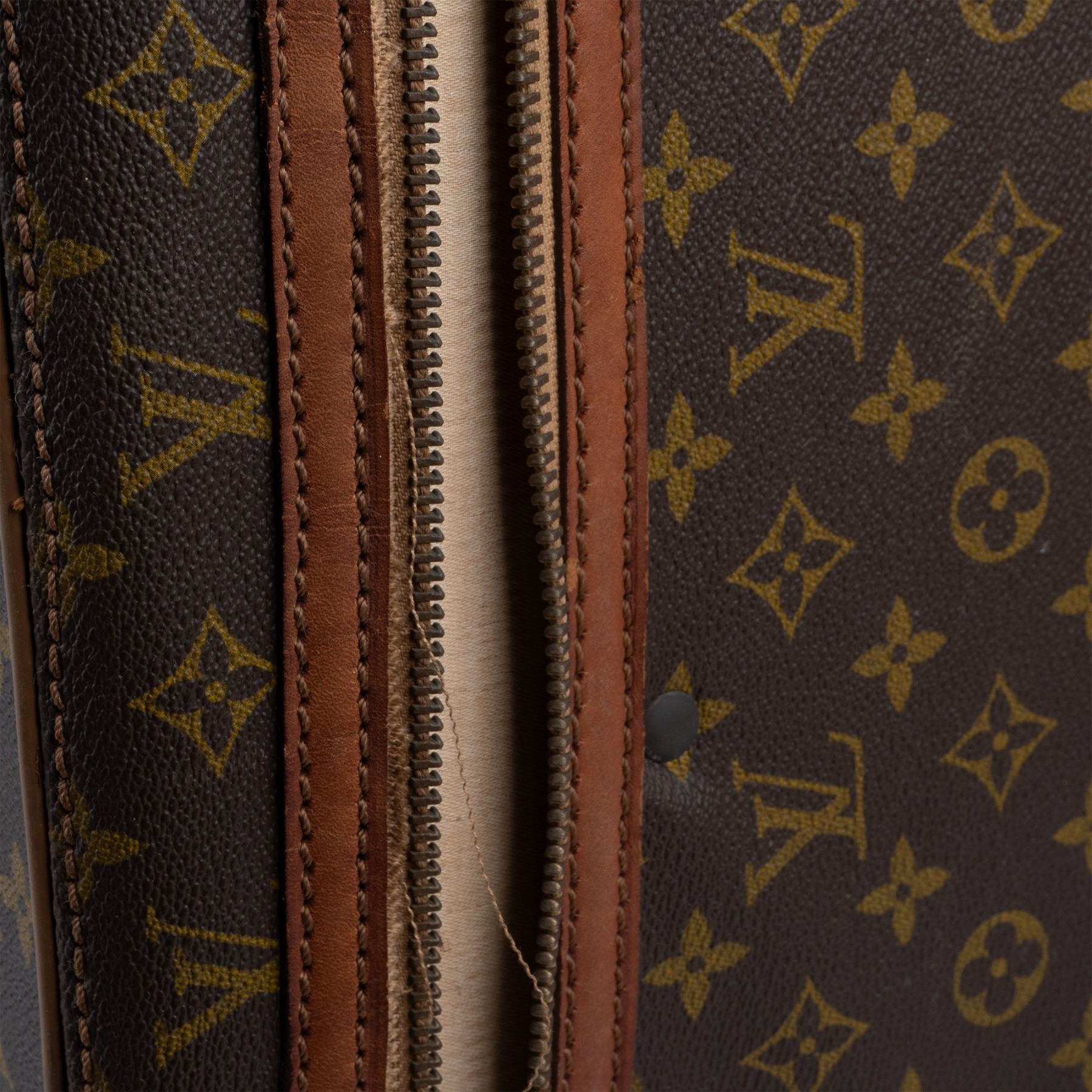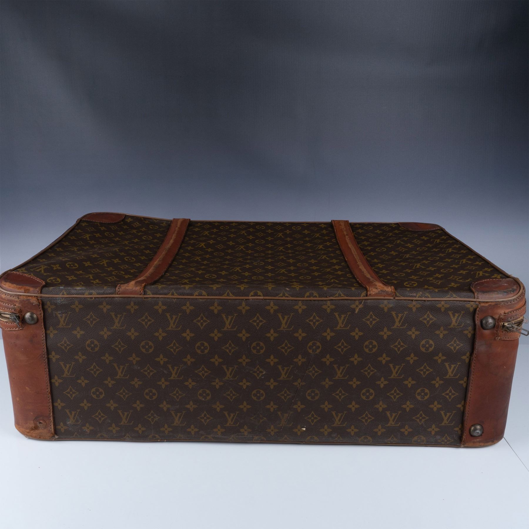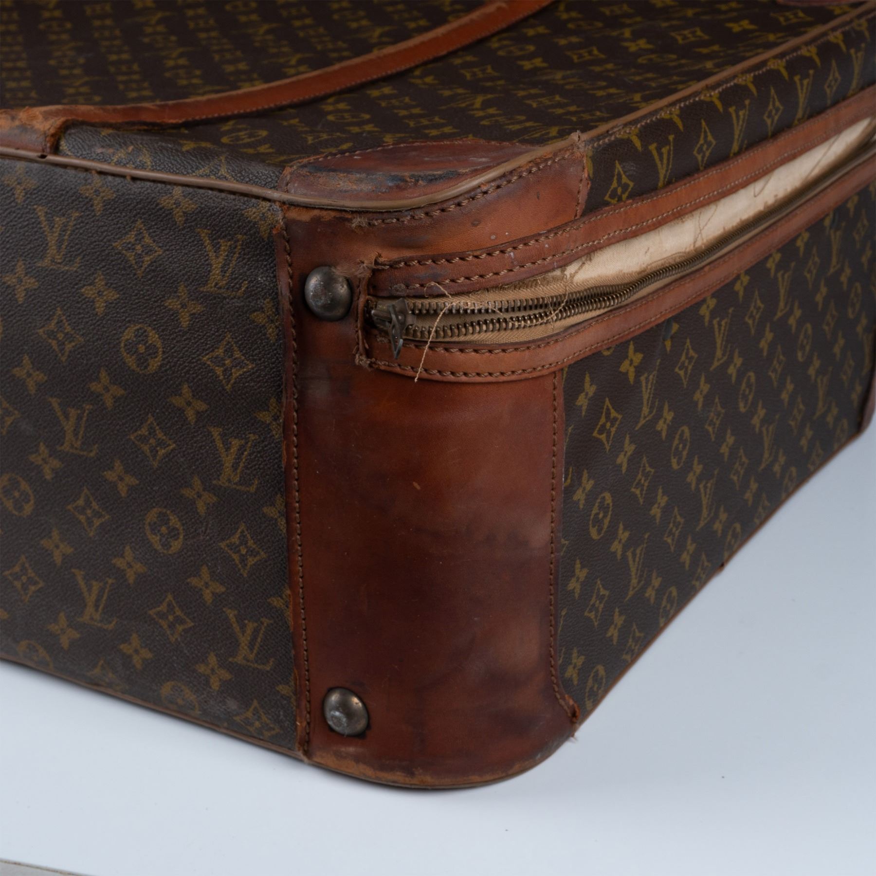 Vintage Louis Vuitton suitcase crafted from the iconic monogram canvas with natural leather trim and gold-tone hardware. This piece features a sturdy handle, buckle straps, and a zip closure. The interior is lined in beige fabric with tie-down straps and shows signs of use and age. External wear includes scuffs and marks consistent with travel and age, adding to its vintage appeal.