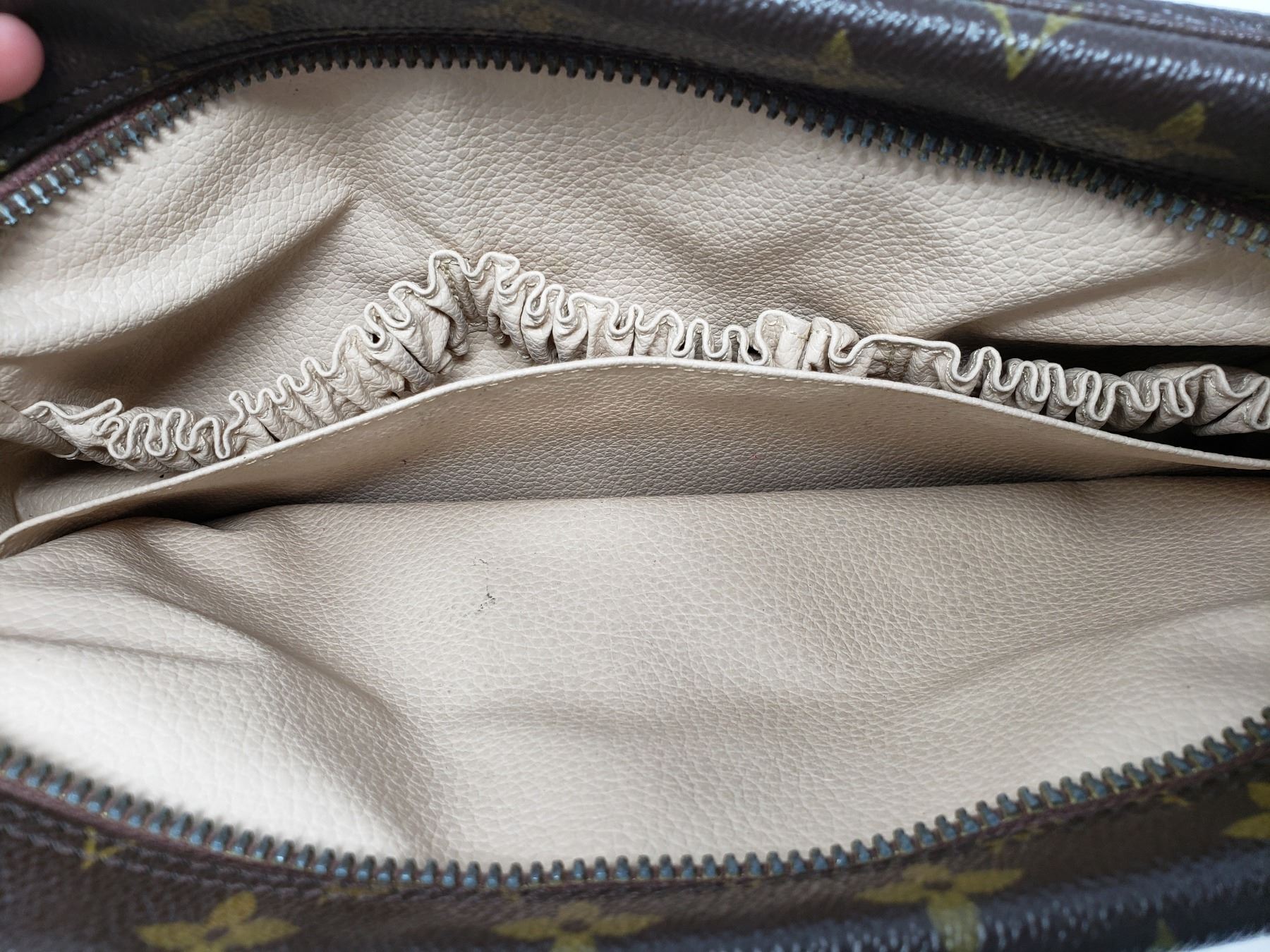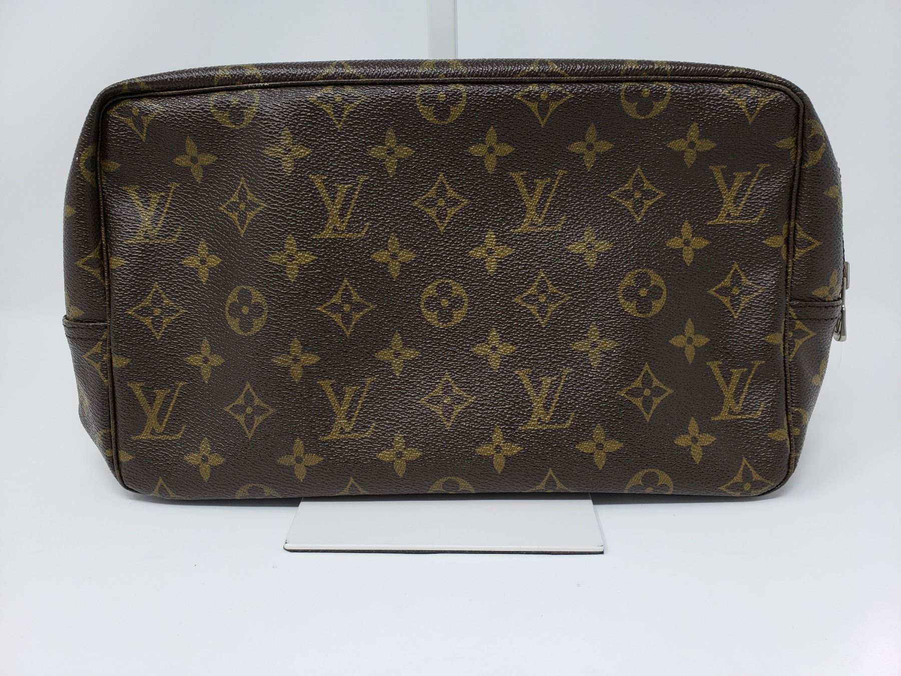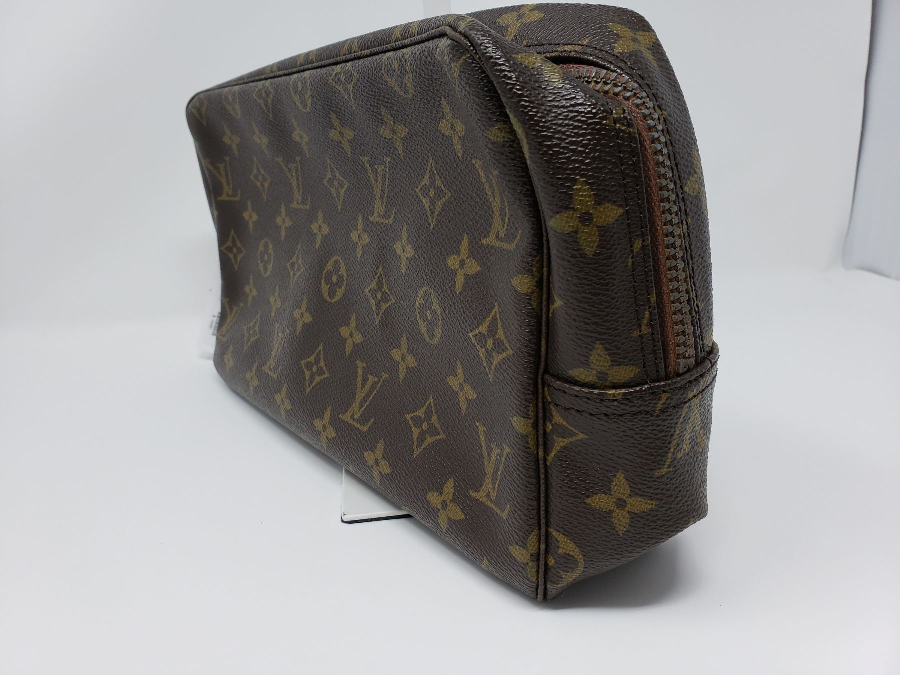Description:Brown and tan monogram coated canvas Louis Vuitton Toiletry pouch with brass hardware, creme coated canvas lining, single slit pocket, elasticized compartments and zip-around closure at top