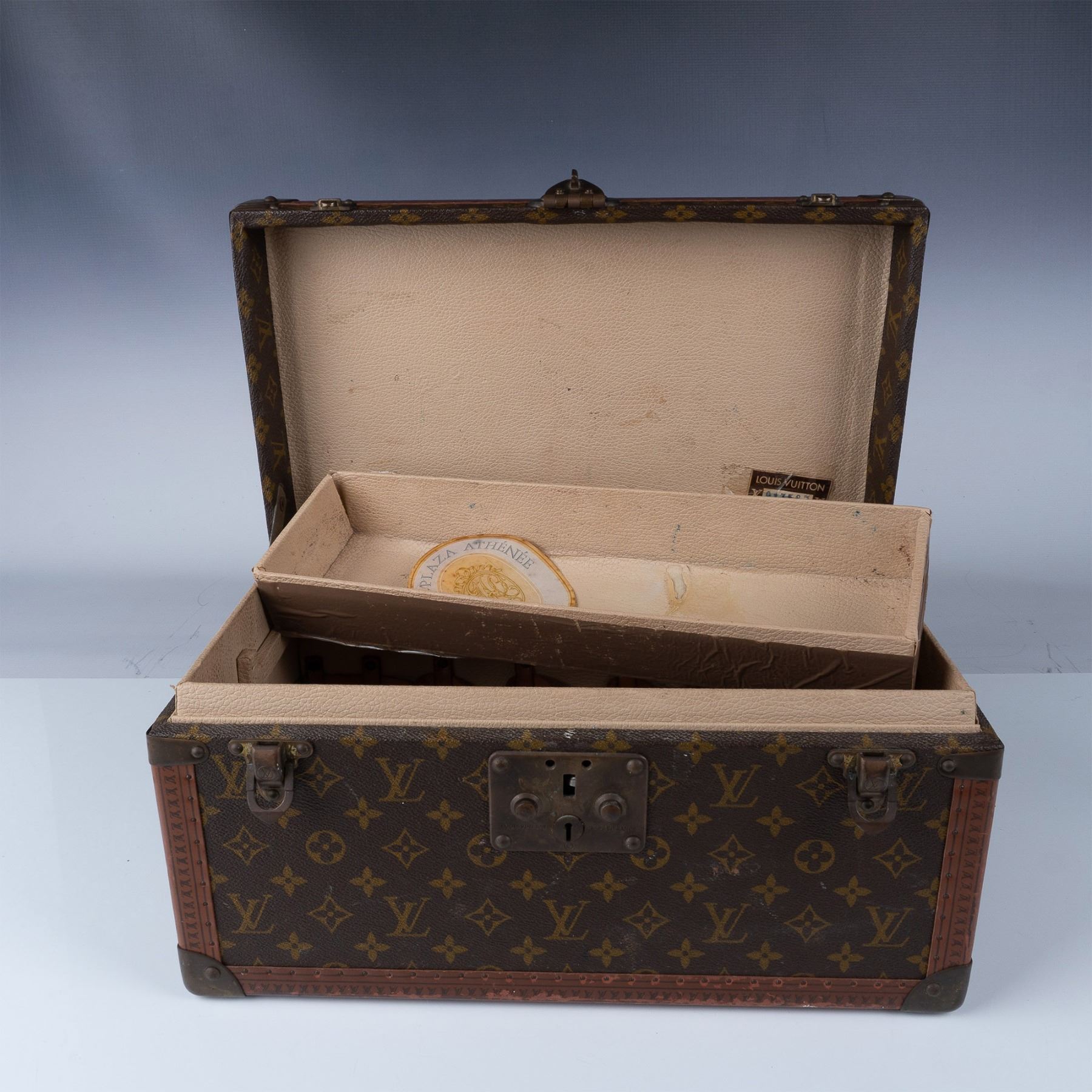 This is an exceptional vintage Louis Vuitton train case, showcasing the iconic monogram canvas design. Featuring brass hardware, leather trim, and sturdy construction, the case reflects Louis Vuitton's timeless craftsmanship and style. The interior is lined in a durable leatherette material and includes original compartments and leather straps, perfect for securing small essentials or toiletries. A classic Louis Vuitton label is present inside, along with a serial number. This train case exudes a sophisticated charm, making it a prized addition for collectors of luxury vintage luggage or Louis Vuitton enthusiasts. Condition consistent with age and use, showcasing minor scuffs and wear to the exterior and interior, adding to its vintage character. Case key included.