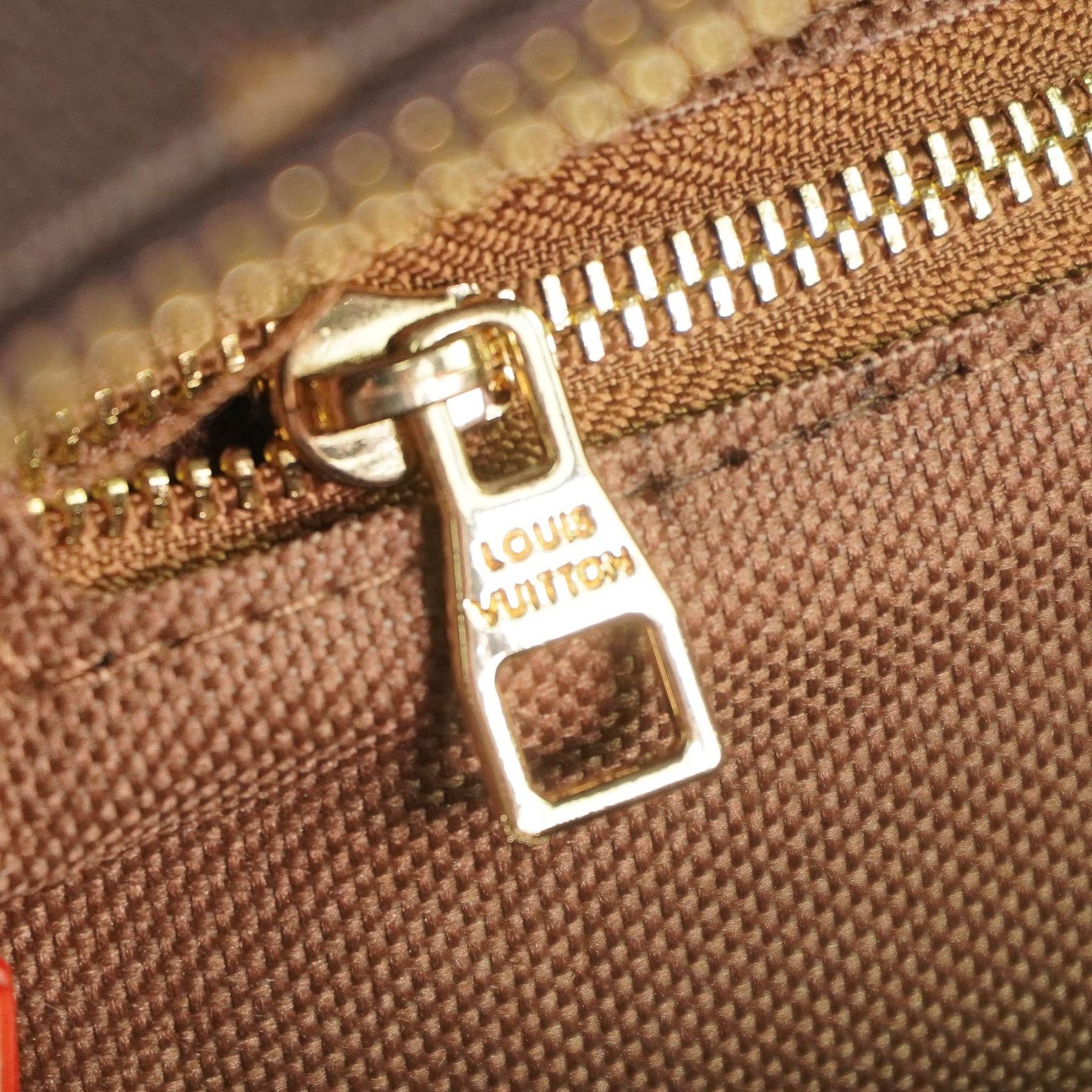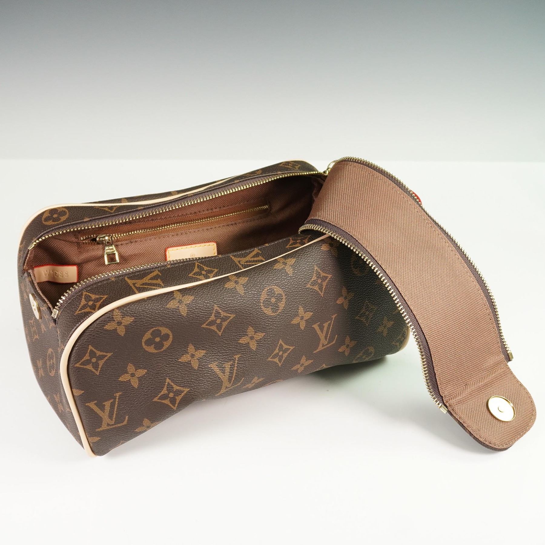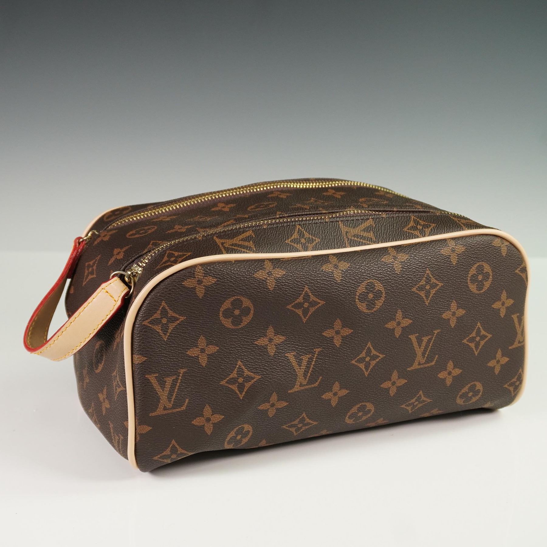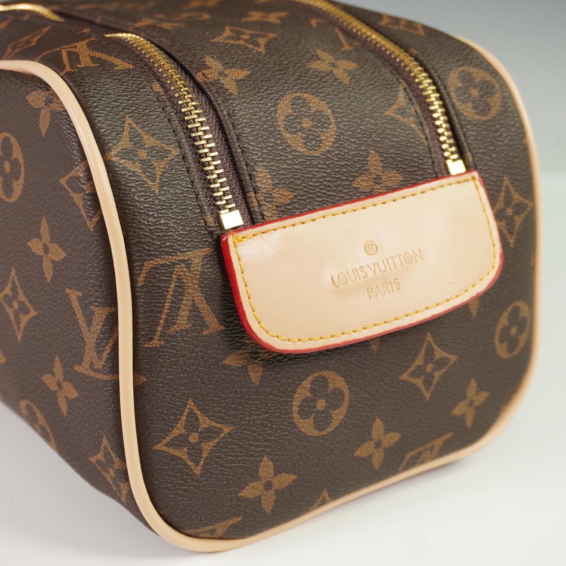 Crafted from the iconic Louis Vuitton monogram coated canvas with natural cowhide leather trim, this Trousse Toilette bag features a top zipper closure, a spacious interior with a canvas lining, and a single zipper pocket. The interior is marked with a leather tag stamped Louis Vuitton Paris. Designed for travel or everyday organization, the piece showcases the brand's classic LV monogram print across the exterior. Gold-tone hardware complements the design, and the interior offers ample room for personal items. Dimensions approximately 10"L x 6"H x 3"D.