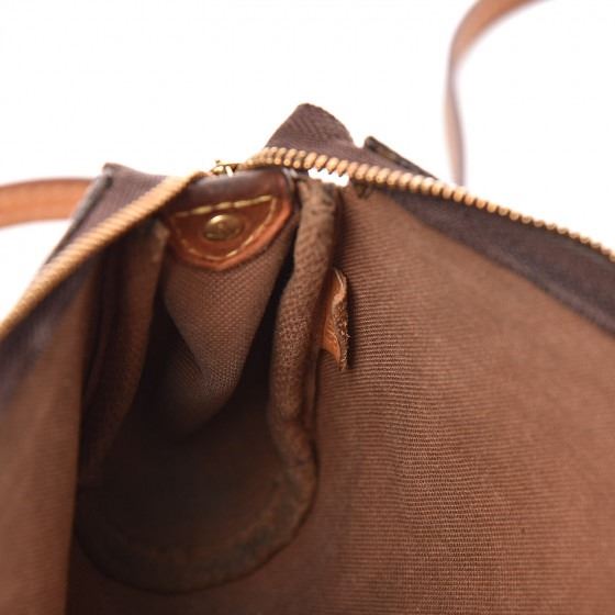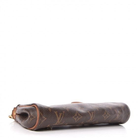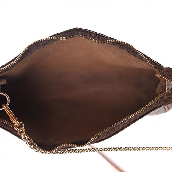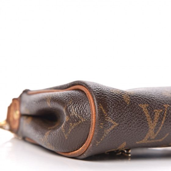 Description: Crafted of classic Louis Vuitton monogram coated canvas. This clutch features an elegant polished brass chain link wristlet strap, vachetta leather trim, and a matching, optional shoulder strap. The brass top zipper opens the bag to a compact cocoa brown fabric interior.