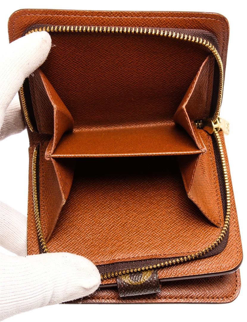 Brown and tan monogram coated canvas Louis Vuitton Porte-Papier Zippé wallet with gold-tone hardware, brown Taiga leather lining, single bill compartment, three card slots, two side pockets, snap closure, and zip pocket with two compartments.