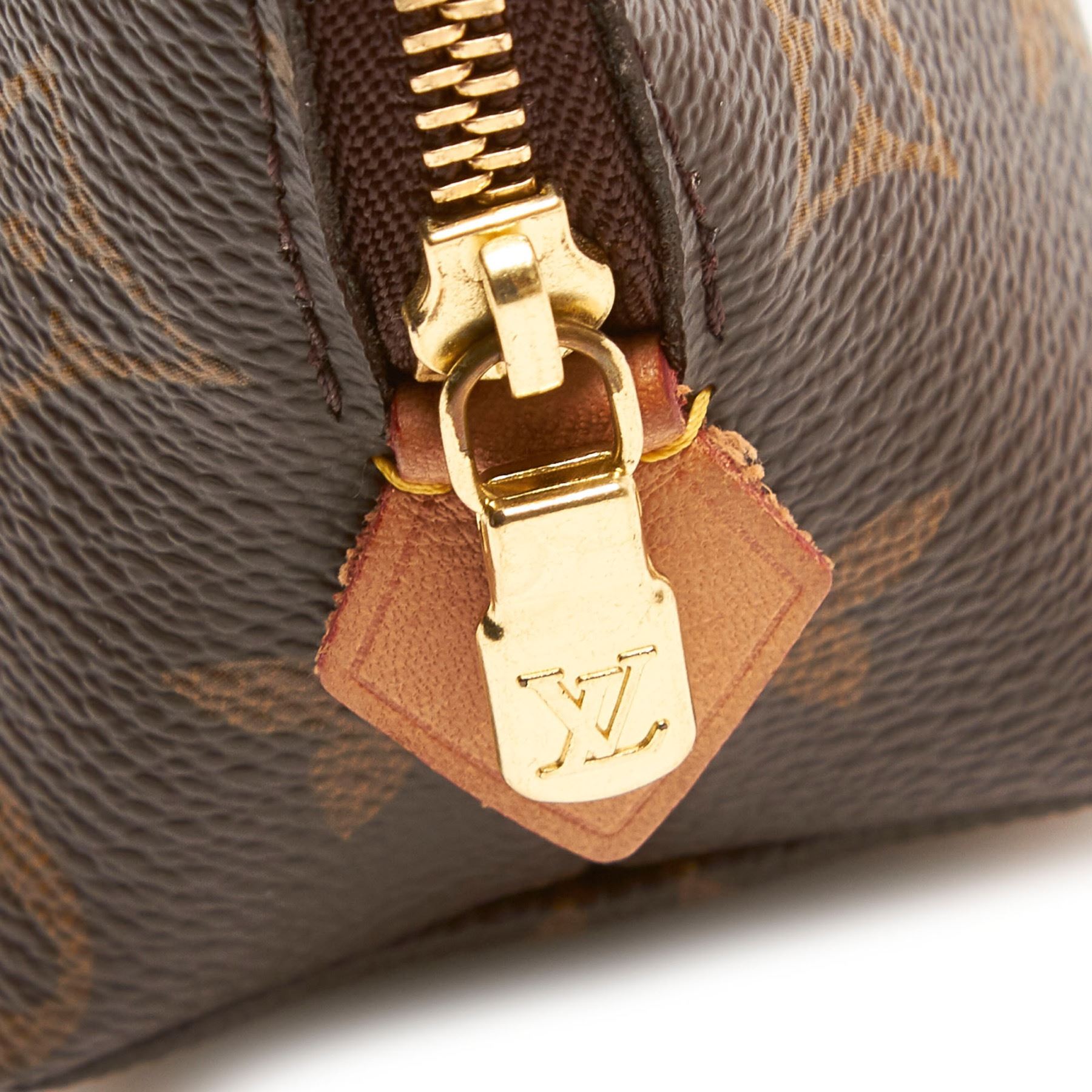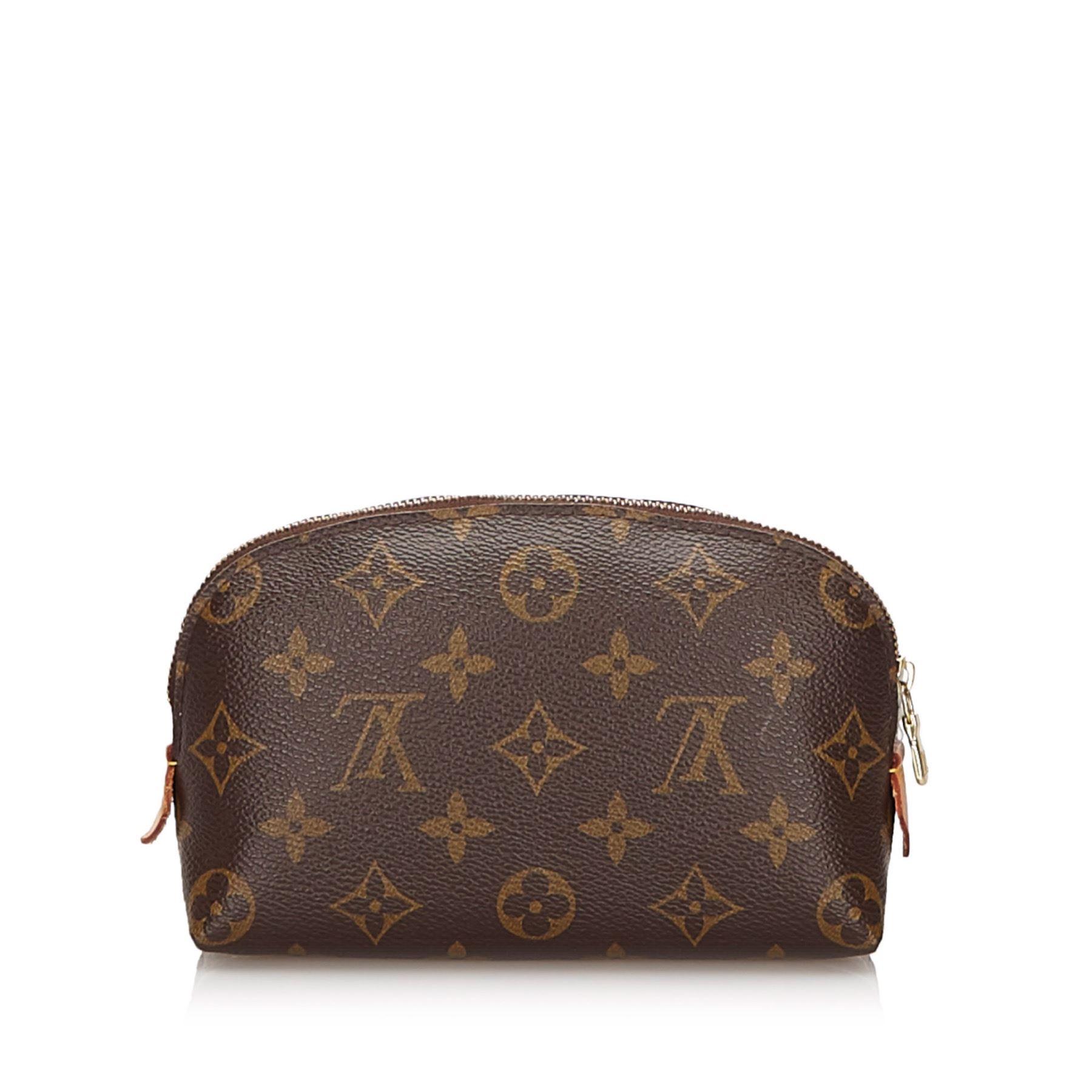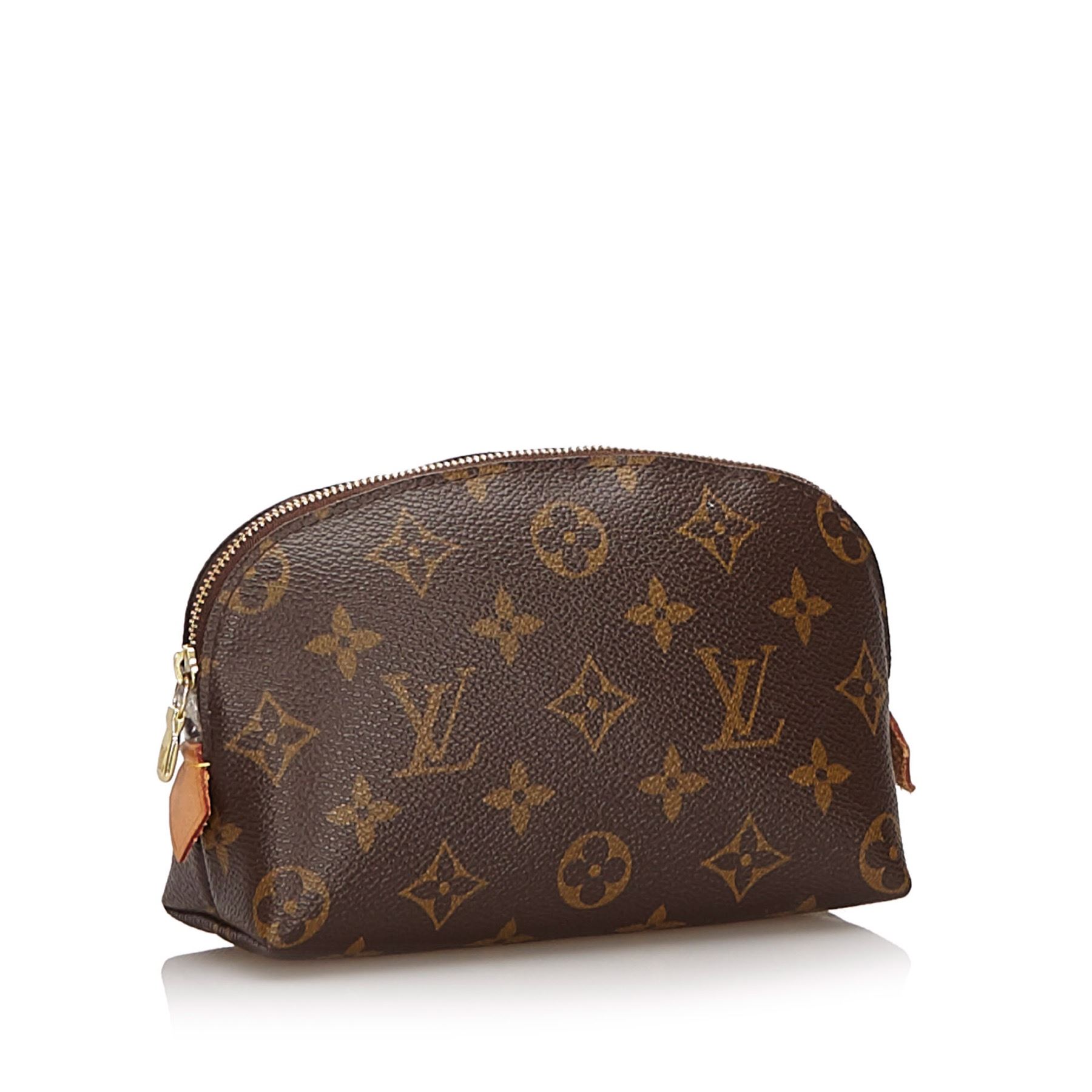 This cosmetic case features a monogram canvas body, a top zip closure, and an interior slip pocket. Canvas x Monogram Canvas Brown Exterior bottom is scratched. Exterior corners is scratched. Exterior side is stained. Interior lining is stained. Interior pocket is stained. Size: 17 x 12 x 6 Card: NO. Louis Vuitton pieces do not come with an authenticity card—please refer to the production date code within the bag for its age and as an authenticity reference. Made in: Spain