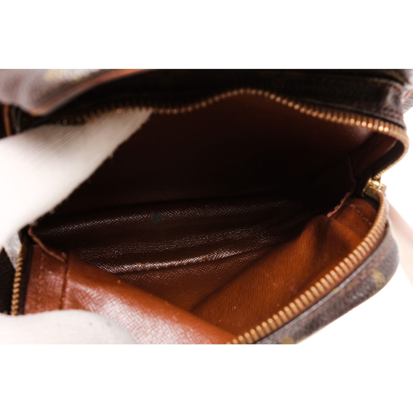 Brown and tan monogram coated canvas Louis Vuitton Amazone bag with brass hardware, tan vachetta leather trim, flat shoulder strap, exterior zip pocket, brown leather lining and zip closure at top.