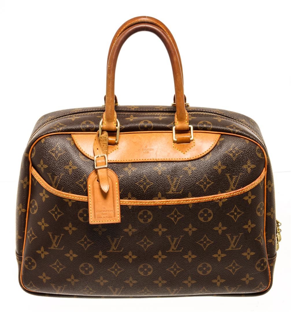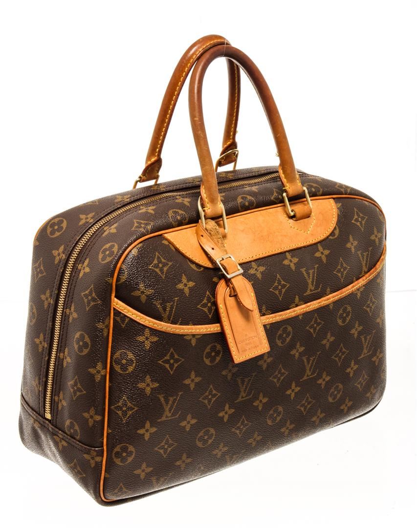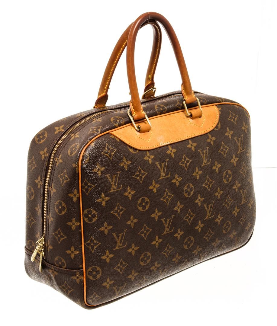 One Louis Vuitton Monogram Deauville. Item is sold AS-IS. All available information is listed in the description and shown in the photo. Louis Vuitton Monogram Deauville with coated canvas exterior, beige fabric lining, vachetta leather top handles, gold-tone hardware, zipper closure, and one main compartment with multiple slip pockets.