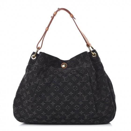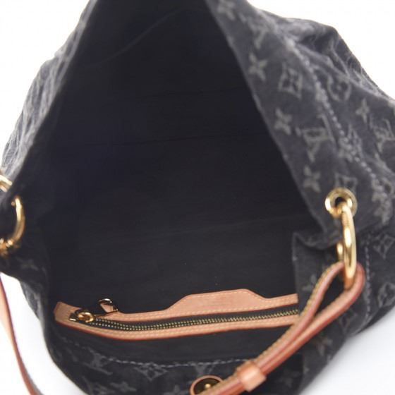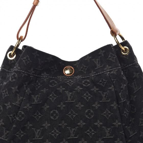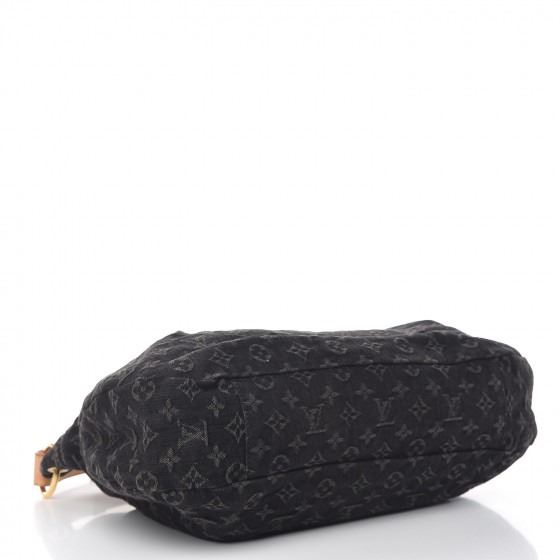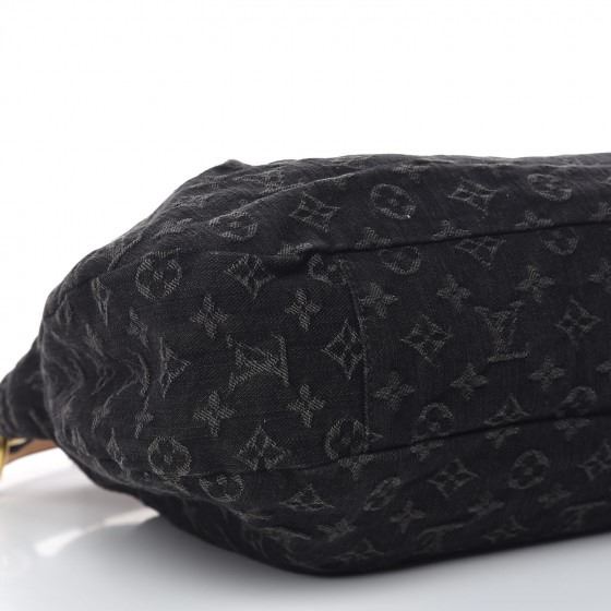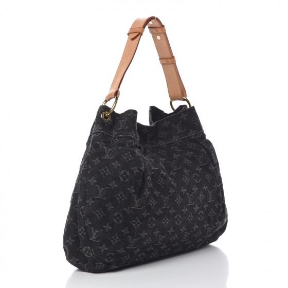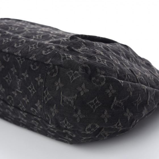 Black hobo style with a chic contemporary look. It is crafted out of black Louis Vuitton monogram denim that is tucked and tailored towards the top. The bag rises at the sides and extends upwards into a natural vachetta leather cowhide handle. The handle loops double back with brass handle rings and a brass top button closure. The interior is a black fabric with a zipper pocket .